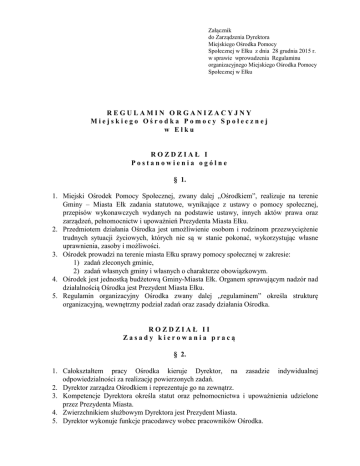 Załącznik do Zarządzenia Dyrektora Miejskiego Ośrodka Pomocy Społecznej w Ełku z dnia 28 grudnia 2015 r. w sprawie wprowadzenia Regulaminu organizacyjnego Miejskiego Ośrodka Pomocy Społecznej w Ełku REGULAMIN ORGANIZACYJNY Miejskiego Ośrodka Pomocy Społecznej w Ełku ROZDZIAŁ I Postanowienia ogólne § 1. 1. Miejski Ośrodek Pomocy Społecznej, zwany dalej „Ośrodkiem”, realizuje na terenie Gminy – Miasta Ełk zadania statutowe, wynikające z ustawy o pomocy społecznej, przepisów wykonawczych wydanych na podstawie ustawy, innych aktów prawa oraz zarządzeń, pełnomocnictw i upoważnień Prezydenta Miasta Ełku. 2. Przedmiotem działania Ośrodka jest umożliwienie osobom i rodzinom przezwyciężenie trudnych sytuacji życiowych, których nie są w stanie pokonać, wykorzystując własne uprawnienia, zasoby i możliwości. 3. Ośrodek prowadzi na terenie miasta Ełku sprawy pomocy społecznej w zakresie: 1) zadań zleconych gminie, 2) zadań własnych gminy i własnych o charakterze obowiązkowym. 4. Ośrodek jest jednostką budżetową Gminy-Miasta Ełk. Organem sprawującym nadzór nad działalnością Ośrodka jest Prezydent Miasta Ełku. 5. Regulamin organizacyjny Ośrodka zwany dalej „regulaminem” określa strukturę organizacyjną, wewnętrzny podział zadań oraz zasady działania Ośrodka. ROZDZIAŁ II Zasady kierowania pracą § 2. 1. Całokształtem pracy Ośrodka kieruje Dyrektor, na zasadzie indywidualnej odpowiedzialności za realizację powierzonych zadań. 2. Dyrektor zarządza Ośrodkiem i reprezentuje go na zewnątrz. 3. Kompetencje Dyrektora określa statut oraz pełnomocnictwa i upoważnienia udzielone przez Prezydenta Miasta. 4. Zwierzchnikiem służbowym Dyrektora jest Prezydent Miasta. 5. Dyrektor wykonuje funkcje pracodawcy wobec pracowników Ośrodka. 6. Swoje obowiązki Dyrektor wykonuje przy pomocy zastępcy dyrektora, głównego księgowego, kierowników sekcji i pracowników zatrudnionych na samodzielnych stanowiskach pracy. § 3. 1. Zastępca Dyrektora, główny księgowy, kierownicy sekcji oraz samodzielne stanowiska pracy działają w zakresie spraw powierzonych im przez Dyrektora i ponoszą przed nim odpowiedzialność za ich realizację. 2. Pracownicy Ośrodka, wymienieni w pkt 1, ustalają zakresy czynności podległym im pracownikom, zapewniają planową i terminową realizację zadań wynikających z zakresu działania Ośrodka w zakresie im powierzonym oraz nadzorują i koordynują pracę podległych pracowników. 3. Podczas nieobecności Dyrektora Ośrodkiem kieruje zastępca dyrektora, a w przypadku jego nieobecności wyznaczony kierownik, w granicach udzielonego mu pełnomocnictwa. ROZDZIAŁ III Struktura organizacyjna Ośrodka § 4. Struktura organizacyjna Ośrodka obejmuje komórki i jednostki organizacyjne oraz stanowiska pracy: 1) Dyrektor, 2) Zastępca dyrektora, 3) Sekcja Finansowo – Księgowa, 4) Sekcja Pracy Socjalnej, 5) Sekcja Świadczeń Środowiskowych, 6) Sekcja Usług Opiekuńczych i Pomocy Instytucjonalnej, 7) Zespół ds. Asysty Rodzinnej, 8) Zespół Pracy Socjalnej i Integracji Społecznej, 9)Środowiskowy Dom Samopomocy dla osób z chorobą Alzhaimera i innymi zaburzenia psychicznymi, 10) Samodzielne stanowiska pracy. § 5. 1. Funkcjonowanie komórek organizacyjnych oraz samodzielnych stanowisk pracy opiera się na zasadach służbowego podporządkowania, podziału czynności i indywidualnej odpowiedzialności kierowników i pracowników zatrudnionych na stanowiskach samodzielnych za wykonanie powierzonych zadań. 2. Na czas nieobecności kierownika komórki organizacyjnej, obowiązany jest on powierzyć swoje zadania innemu pracownikowi, w uzgodnieniu z Dyrektorem Ośrodka lub jego zastępcą. 3. Szczegółowe uregulowania zagadnień związanych z organizacją wewnętrzną i pracą jednostek organizacyjnych pomocy społecznej wchodzących w skład Ośrodka określają regulaminy wewnętrzne tych jednostek zatwierdzane przez Dyrektora. 2 ROZDZIAŁ IV Podział zadań § 6. Do zadań Dyrektora Ośrodka należy w szczególności: 1. prowadzenie działalności organizacyjnej i administracyjnej, służącej realizacji celów i zadań Ośrodka, 2. współpraca z właściwym d/s pomocy społecznej wydziałem Urzędu Miasta, z Wydziałem Polityki Społecznej Warmińsko – Mazurskiego Urzędu Wojewódzkiego i Regionalnym Ośrodkiem Polityki Społecznej Urzędu Marszałkowskiego Województwa Warmińsko – Mazurskiego, 3. nadzorowanie terminów oraz prawidłowości załatwiania spraw, 4. występowanie do Prezydenta Miasta w sprawach dot. organizacji, funkcjonowania i finansowania Ośrodka, 5. zawieranie i rozwiązywanie umów o pracę z pracownikami oraz podejmowanie wszelkich decyzji w sprawach osobowych, 6. wydawanie decyzji administracyjnych w indywidualnych sprawach z zakresu pomocy społecznej dotyczących zadań statutowych Ośrodka i innych określonych przepisami prawa na podstawie udzielonych przez Prezydenta Miasta upoważnień oraz wnioskowanie o udzielenie takich upoważnień innym osobom, 7. zapewnienie właściwego dopływu informacji merytorycznych i finansowych do Ośrodka, 8. ustalanie charakteru potrzeb i opracowywanie planów finansowych i rzeczowych ich zaspokajania, 9. sprawowanie nadzoru nad jednostkami organizacyjnymi pomocy społecznej, zgodnie z udzielonym pełnomocnictwem. § 7. 1. Dyrektor Ośrodka może kształtować strukturę organizacyjną Ośrodka poprzez tworzenie komórek organizacyjnych, ich likwidację i przenoszenie stanowisk pracy z jednej komórki organizacyjnej do drugiej. 2. Dyrektor może łączyć zakresy czynności, bez zmiany zakresu działania, poszczególnych komórek organizacyjnych jeśli nie spowoduje to zmiany zadań określonych niniejszym regulaminem. § 8. Zastępca Dyrektora 1. Zastępca Dyrektora podlega Dyrektorowi i kieruje Ośrodkiem podczas nieobecności Dyrektora, 2. Wykonując powierzone zadania zastępca Dyrektora zapewnia kompleksowe rozwiązywanie 