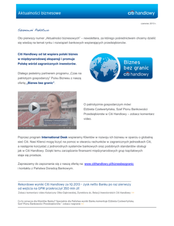 czerwiec 2013 r. Oto pierwszy numer „Aktualności biznesowych” – newslettera, za którego pośrednictwem chcemy dzielić się wiedzą na temat rynku i rozwiązań bankowych wspierających przedsiębiorców. Citi Handlowy od lat wspiera polski biznes w międzynarodowej ekspansji i promuje Polskę wśród zagranicznych inwestorów. Dlatego jesteśmy partnerem programu „Czas na patriotyzm gospodarczy” Pulsu Biznesu z naszą ofertą „Biznes bez granic”. O patriotyzmie gospodarczym mówi Elżbieta Czetwertyńska, Szef Pionu Bankowości Przedsiębiorstw w Citi Handlowy – zobacz komentarz video. Poprzez program International Desk wspieramy Klientów w rozwoju ich biznesu w oparciu o globalną sieć Citi. Nasi Klienci mogą liczyć na pomoc w otwarciu rachunków w zagranicznych jednostkach Citi, a następnie korzystać z jednorodnych systemów bankowych oraz podobnych standardów obsługi jak w Citi Handlowy. Dzięki temu zarządzanie finansami międzynarodowych grup kapitałowych staje się prostsze. Zapraszamy do zapoznania się z naszą ofertą na: www.citihandlowy.pl/biznesbezgranic i kontaktu z Państwa Doradcą Bankowym. www.citihandlowy.pl Bank Handlowy w Warszawie S.A. Citi Handlowy jest zastrzeżonym znakiem towarowym należącym do podmiotów z grupy Citigroup Inc. Bank Handlowy w Warszawie S.A. z siedzibą w Warszawie, ul. Senatorska 16, 00-923 Warszawa, zarejestrowany w rejestrze przedsiębiorców Krajowego Rejestru Sądowego przez Sąd Rejonowy dla m.st. Warszawy w Warszawie, XII Wydział Gospodarczy Krajowego Rejestru Sądowego, pod nr. KRS 000 000 1538; NIP 526-030-02-91; wysokość kapitału zakładowego wynosi 522.638.400 złotych, kapitał został w pełni opłacony. Jeśli nie chcą Państwo otrzymywać tego typu wiadomości w przyszłości, prosimy o wysłanie e-maila poprzez link NIE wyrażam zgody