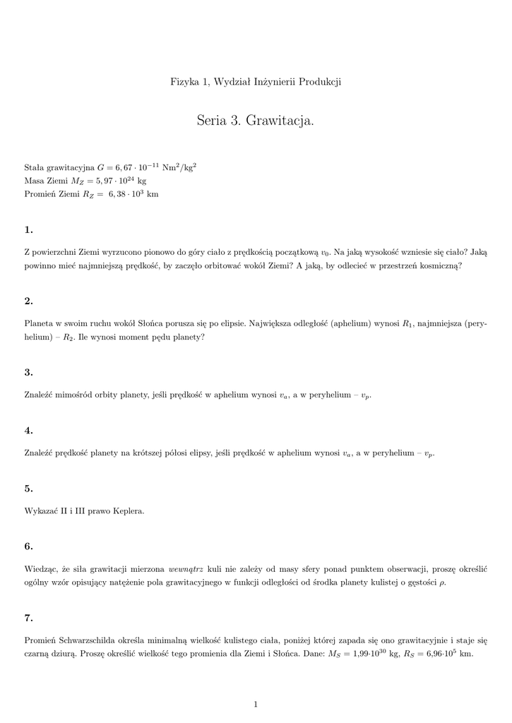 Fizyka 1, Wydział Inżynierii Produkcji Seria 3. Grawitacja. Stała grawitacyjna G = 6, 67 · 10−11 Nm2 /kg2 Masa Ziemi MZ = 5, 97 · 1024 kg Promień Ziemi RZ = 6, 38 · 103 km 1. Z powierzchni Ziemi wyrzucono pionowo do góry ciało z prędkością początkową v0 . Na jaką wysokość wzniesie się ciało? Jaką powinno mieć najmniejszą prędkość, by zaczęło orbitować wokół Ziemi? A jaką, by odlecieć w przestrzeń kosmiczną? 2. Planeta w swoim ruchu wokół Słońca porusza się po elipsie. Największa odległość (aphelium) wynosi R1 , najmniejsza (peryhelium) – R2 . Ile wynosi moment pędu planety? 3. Znaleźć mimośród orbity planety, jeśli prędkość w aphelium wynosi va , a w peryhelium – vp . 4. Znaleźć prędkość planety na krótszej półosi elipsy, jeśli prędkość w aphelium wynosi va , a w peryhelium – vp . 5. Wykazać II i III prawo Keplera. 6. Wiedząc, że siła grawitacji mierzona wewnątrz kuli nie zależy od masy sfery ponad punktem obserwacji, proszę określić ogólny wzór opisujący natężenie pola grawitacyjnego w funkcji odległości od środka planety kulistej o gęstości ρ. 7. Promień Schwarzschilda określa minimalną wielkość kulistego ciała, poniżej której zapada się ono grawitacyjnie i staje się czarną dziurą. Proszę określić wielkość tego promienia dla Ziemi i Słońca. Dane: MS = 1,99·1030 kg, RS = 6,96·105 km. 1