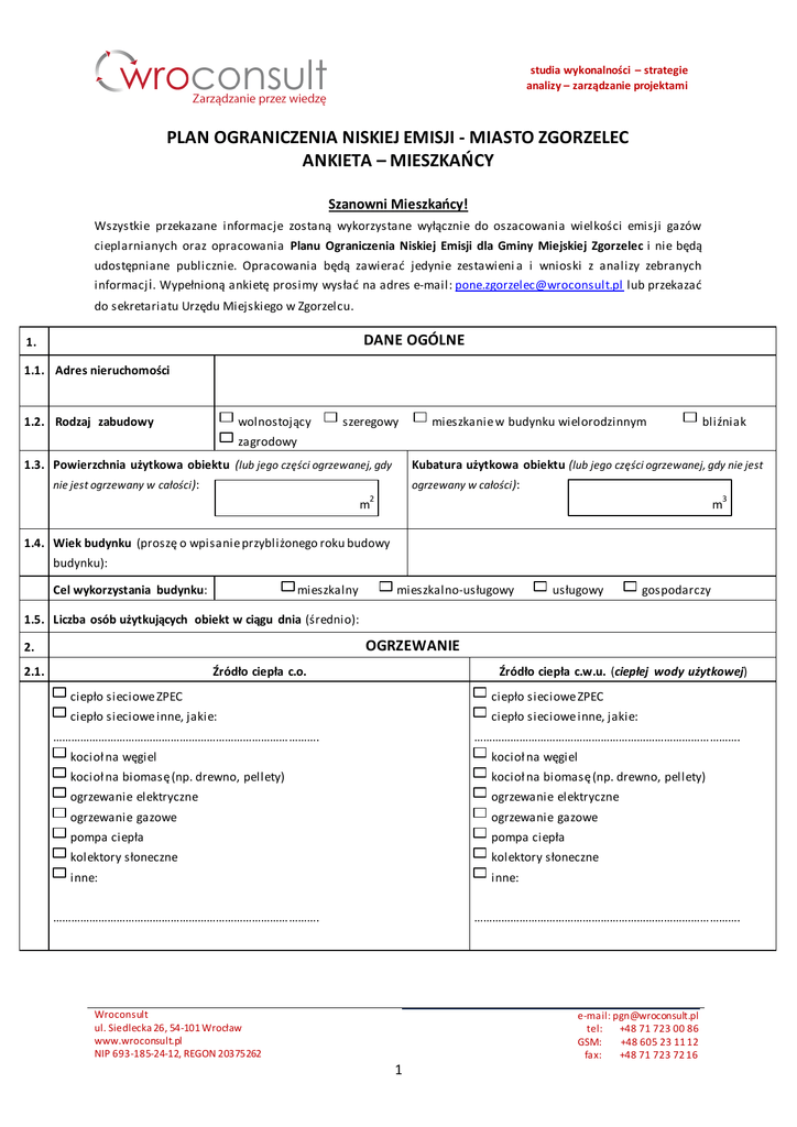 studia wykonalności – strategie analizy – zarządzanie projektami PLAN OGRANICZENIA NISKIEJ EMISJI - MIASTO ZGORZELEC ANKIETA – MIESZKAŃCY Szanowni Mieszkańcy! Wszystkie przekazane informacje zostaną wykorzystane wyłącznie do oszacowania wielkości emisji gazów cieplarnianych oraz opracowania Planu Ograniczenia Niskiej Emisji dla Gminy Miejskiej Zgorzelec i nie będą udostępniane publicznie. Opracowania będą zawierać jedynie zestawieni a i wnioski z analizy zebranych informacj i . Wypełnioną ankietę prosimy wysłać na adres e-mail: [email protected] lub przekazać do sekretariatu Urzędu Miejskiego w Zgorzelcu. DANE OGÓLNE 1. 1.1. Adres nieruchomości 1.2. Rodzaj zabudowy wolnostojący szeregowy mieszkanie w budynku wielorodzinnym bliźniak zagrodowy 1.3. Powierzchnia użytkowa obiektu (lub jego części ogrzewanej, gdy Kubatura użytkowa obiektu (lub jego części ogrzewanej, gdy nie jest nie jest ogrzewany w całości ): ogrzewany w całości ): 2 3 m m 1.4. Wiek budynku (proszę o wpisanie przybliżonego roku budowy budynku): Cel wykorzystania budynku: mieszkalny mieszkalno-usługowy usługowy gospodarczy 1.5. Liczba osób użytkujących obiekt w ciągu dnia (średnio): OGRZEWANIE 2. 2.1. Źródło ciepła c.o. Źródło ciepła c.w.u. (ciepłej wody użytkowej) ciepło sieciowe ZPEC ciepło sieciowe ZPEC ciepło sieciowe inne, jakie: ciepło sieciowe inne, jakie: ……………………………………………………………………………. ……………………………………………………………………………. kocioł na węgiel kocioł na węgiel kocioł na biomasę (np. drewno, pellety) kocioł na biomasę (np. drewno, pellety) ogrzewanie elektryczne ogrzewanie elektryczne ogrzewanie gazowe ogrzewanie gazowe pompa ciepła pompa ciepła kolektory słoneczne kolektory słoneczne inne: inne: ……………………………………………………………………………. ……………………………………………………………………………. Wroconsult ul. Siedlecka 26, 54-101 Wrocław www.wroconsult.pl NIP 693-185-24-12, REGON 20375262 e-mail: [email protected] tel: +48 71 723 00 86 GSM: +48 605 23 11 12 fax: +48 71 723 72 16 1 studia wykonalności – strategie analizy – zarządzanie projektami 2.2. Wiek posiadanego źródła ciepła c.o. poniżej 5 lat 5-10 lat 10-15 lat powyżej 15 lat 10-15 lat powyżej 15 lat 2.3. Wiek posiadanego źródła ciepła c.w.u. poniżej 5 lat 5-10 lat 2.4. Typ, model źródła ciepła do celów grzewczych (kotła, wymiennika, etc.) 2.5. Moc zainstalowana źródła ciepła, kW 3. NOŚNIKI ENERGII 3.1. Używane nośniki energii – ogrzewanie obiektu: ciepło sieciowe e. elektryczna gaz płynny inne – jakie: gaz węgiel koks drewno olej opałowy ………………………………………………………………………………………………………………………………………………………………………………… 3.2. Używane nośniki energii – c.w.u: ciepło sieciowe e. elektryczna gaz płynny inne – jakie: gaz węgiel koks drewno olej opałowy ………………………………………………………………………………………………………………………………………………………………………………… ROCZNE ZUŻYCIE ENERGII I PALIW 4. 4.1. Zużycie energii elektrycznej (kWh) łącznie: 2010 ____________________ 2014 ____________________ 2010: c.o. ____________________ c.w.u ____________________ 2014: c.o. ____________________ c.w.u ____________________ pozos tałe (oświetlenie, agd gotowanie, etc.) ____________________ pozostałe ____________________ Rodzaj paliwa: ciepło sieciowe (GJ) pellet (t) 3 drewno (m ) węgiel (t) 3 gaz ziemny (m ) olej opałowy (litry) gaz płynny (propan-butan, LPG ) (kg lub litry, np. 10 dużych butli (11 kg) gazu = 110 kg) do celów: c.o. c.w.u. c.o. + c.w.u. zużycie 2010: ……………………………………………………… ………………………………………………………………………………………….. zużycie 2014: ……………………………………………………… ………………………………………………………………………………………….. Wroconsult ul. Siedlecka 26, 54-101 Wrocław www.wroconsult.pl NIP 693-185-24-12, REGON 20375262 e-mail: [email protected] tel: +48 71 723 00 86 GSM: +48 605 23 11 12 fax: +48 71 723 72 16 2 studia wykonalności – strategie analizy – zarządzanie projektami inne ( jakie): ….………………………………………………..… zużycie 2010: ……………………………………………………… ………………………………………………………………………………………….. zużycie 2014: ……………………………………………………… ………………………………………………………………………………………….. 5. WYKORZYSTYWANE ODNAWIALNE ŹRÓDŁA ENERGII (OZE) 5.1. Czy w budynku wykorzystywane są urządzenia wykorzystujące OZE? tak nie 5.2. Jeśli tak, proszę o wskazanie jakie (+ liczba, rodzaj, moc zainstalowana, moc cieplna i in.) 5.3. Roczna produkcja energii (np. kolektory słoneczne 1200 kJ, pompa ciepła 2010 500 kWh itp.) 2014 WYKONANE PRACE OCIEPLENIOWE I TERMOMODERNIZACYJNE 6. Rodzaje prac 6.1. Rok wykonania wymiana okien ocieplenie ścian ocieplenie stropu nad ostat. kondygn. /dachem wymiana źródła ciepła modernizacje urządzeń przesyłu energii wymiana instalacji c.o. wymiana instalacji c.w.u. modernizacja wentalacji budynek nowy – termoizolacja wykonana na etapie budowy inne (jakie i kiedy) …………………………………………………………………………………………………………………………………………………………………… Wroconsult ul. Siedlecka 26, 54-101 Wrocław www.wroconsult.pl N