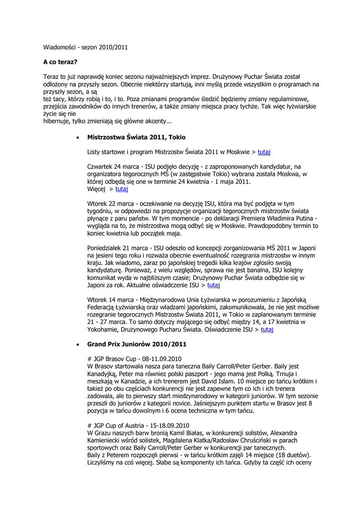 Wiadomości - sezon 2010/2011 A co teraz? Teraz to już naprawdę koniec sezonu najważniejszych imprez. Drużynowy Puchar Świata został odłożony na przyszły sezon. Obecnie niektórzy startują, inni myślą przede wszystkim o programach na przyszły sezon, a są też tacy, którzy robią i to, i to. Poza zmianami programów śledzić będziemy zmiany regulaminowe, przejścia zawodników do innych trenerów, a także zmiany miejsca pracy tychże. Tak więc łyżwiarskie życie się nie hibernuje, tylko zmieniają się główne akcenty... Mistrzostwa Świata 2011, Tokio Listy startowe i program Mistrzostw Świata 2011 w Moskwie > tutaj Czwartek 24 marca - ISU podjęło decyzję - z zaproponowanych kandydatur, na organizatora tegorocznych MŚ (w zastępstwie Tokio) wybrana została Moskwa, w której odbędą się one w terminie 24 kwietnia - 1 maja 2011. Więcej > tutaj Wtorek 22 marca - oczekiwanie na decyzję ISU, która ma być podjęta w tym tygodniu, w odpowiedzi na propozycje organizacji tegorocznych mistrzostw świata płynące z paru państw. W tym momencie - po deklaracji Premiera Władimira Putina wygląda na to, że mistrzostwa mogą odbyć się w Moskwie. Prawdopodobny termin to koniec kwietnia lub początek maja. Poniedziałek 21 marca - ISU odeszło od koncepcji zorganizowania MŚ 2011 w Japoni na jesieni tego roku i rozważa obecnie ewentualność rozegrania mistrzostw w innym kraju. Jak wiadomo, zaraz po japońskiej tregedii kilka krajów zgłosiło swoją kandydaturę. Ponieważ, z wielu względów, sprawa nie jest banalna, ISU kolejny komunikat wyda w najbliższym czasie; Drużynowy Puchar Świata odbędzie się w Japoni za rok. Aktualne oświadczenie ISU > tutaj Wtorek 14 marca - Międzynarodowa Unia Łyżwiarska w porozumieniu z Japońską Federacją Łyżwiarską oraz władzami japońskimi, zakomunikowała, że nie jest możliwe rozegranie tegorocznych Mistrzostw Świata 2011, w Tokio w zaplanowanym terminie 21 - 27 marca. To samo dotyczy mającego się odbyć między 14, a 17 kwietnia w Yokohamie, Drużynowego Pucharu Świata. Oświadczenie ISU > tutaj Grand Prix Juniorów 2010/2011 # JGP Brasov Cup - 08-11.09.2010 W Brasov startowała nasza para taneczna Baily Carroll/Peter Gerber. Baily jest Kanadyjką, Peter ma równiez polski paszport - jego mama jest Polką. Trnuja i meszkają w Kanadzie, a ich trenerem jest David Islam. 10 miejsce po tańcu krótkim i takież po obu częściach konkurencji nie jest zapewne tym co ich i ich trenera zadowala, ale to pierwszy start miedzynarodowy w kategorii juniorów. W tym sezonie przeszli do juniorów z kategorii novice. Jaśniejszym punktem startu w Brasov jest 8 pozycja w tańcu dowolnym i 6 ocena techniczna w tym tańcu. # JGP Cup of Austria - 15-18.09.2010 W Grazu naszych barw bronią Kamil Białas, w konkurencji solistów, Alexandra Kamieniecki wśród solistek, Magdalena Klatka/Radosław Chruściński w parach sportowych oraz Baily Carroll/Peter Gerber w konkurencji par tanecznych. Baily z Peterem rozpoczęli pierwsi - w tańcu krótkim zajęli 14 miejsce (18 duetów). Liczyliśmy na coś więcej. Słabe są komponenty ich tańca. Gdyby ta część ich oceny była wyższa, mogliby zbliżyć się do 10ki. Prowadzą Amerykanie Charlotte Lichtmann/Dean Copely, przed duetem rosyjskim i francuskim. Niestety tańca dowolnego Baily z Peterem nie zaprezentowali, bo zderzyli się z inną parą i Baily zamiast występować, odwieziona została do szpitala. Szkoda. Kamil Białas nadal jest bez formy, występ podobny do tego, co można było zobaczyć na zawodach, w trakcie treningów, w Kanadzie. 18 miejsce - trzecia pozycja od końca i duża różnica punktowa do zawodnika na 17 pozycji. Alexandra Kamieniecki na 26 pozycji - za nią 5 zawodniczek. Bardzo dużo do zrobienia w tym, co kryje się pod hasłem komponenty. Jeśli chodzi o ocenę techniczną - parę zawodniczek byłoby jeszcze za Alexandrą. Dobry początek pary sportowej Magdalena Klatka/Radosław Chruściński. 12 pozycja w ich przypadku jest niezła, ale na ocenę trzeba poczekać do następnego startu. # JGP John Curry Memorial Competition - 29.09-02.10.2010 W Sheffield naszych barw bronią Kamil Dymowski, w konkurencji solistów, Magdalena Jaskółka/Piotr Snopek w parach sportowych oraz Joanna Zając/Damian Bińkowski w konkurencji par tanecznych. Tych zawodów jako dobrych dla naszych barw nie zapiszemy wszak Kamil Dymowski zajął 20 miejsce na 22 startujących, para sportowa 14te, a więc ostatnie, natomiast para taneczna 16te - czyli przedostatnie. # JGP Pokal der Blauen Schwerter - 29.09-02.10.2010 W Dreźnie polskę reprezentują Kamil Dymowski i para sportowa Magdalena Klatka/Radosław Chruściński. Po programie krótkim Kamil Dymowski jest dopiero 26ty (na 28 solistów), zaś para sportowa wśród 12 duetów zajęła miejsce 11te... Finalnie Kamil Dymowski zajął 26 miejsce na 27miu. Niestety nie jest to imponujący wynik. JGP Czech Skate - 13-17.10.2010 W konkurencji solistów trochę lepszy występ Kamila Białasa, który na 20 zawodników zajął 11 pozycję. Niestety po 10 miejscu w programie krótkim, w programie dowolnym dopiero 13 pozycja. Również lepiej zaprezentowała się w Ostrawie Aleksandra Kamieniecki. Finalnie 16 pozycja wśród 32 solistek i 15 miejsca w obu programach – krótkim i dowolnym. Joanna Zając/Damian Bińkowski, którzy reprezentowali nasze barwy w parach tanecznych ukończyli rywalizację na 13 miejscu. Szkoda, że nie obronili 12 pozycji zajmowanej po tańcu krótkim. W tej konkurencji startowało 19 duetów. Najsłabsze miejsce zajęli – w konkurencji par sportowych – Magdalena Jaskółka/Piotr Snopek. Ich udziałem było 13, ostatnie miejsce. Nebelhorn Trophy, Oberstdorf - 23-25.09.2010 42 - już - raz Oberstdorf gości dobrą stawkę łyżwiarzy w pierwszej fazie sezonu. W naszej drużynie dwóch czołowych solistów - Maciej Cieplucha i Sebastian Iwasaki oraz para sportowa Joanna Sulej/Mateusz Chruściński. Za