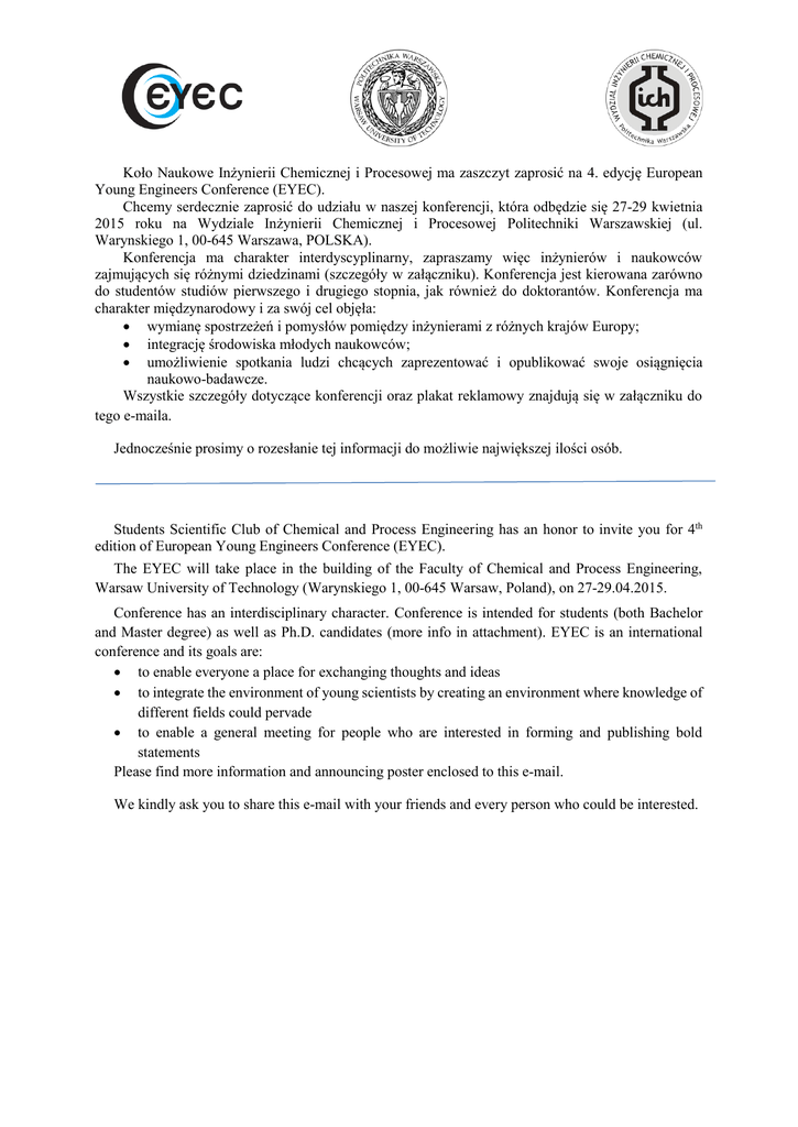 Koło Naukowe Inżynierii Chemicznej i Procesowej ma zaszczyt zaprosić na 4. edycję European Young Engineers Conference (EYEC). Chcemy serdecznie zaprosić do udziału w naszej konferencji, która odbędzie się 27-29 kwietnia 2015 roku na Wydziale Inżynierii Chemicznej i Procesowej Politechniki Warszawskiej (ul. Warynskiego 1, 00-645 Warszawa, POLSKA). Konferencja ma charakter interdyscyplinarny, zapraszamy więc inżynierów i naukowców zajmujących się różnymi dziedzinami (szczegóły w załączniku). Konferencja jest kierowana zarówno do studentów studiów pierwszego i drugiego stopnia, jak również do doktorantów. Konferencja ma charakter międzynarodowy i za swój cel objęła: wymianę spostrzeżeń i pomysłów pomiędzy inżynierami z różnych krajów Europy; integrację środowiska młodych naukowców; umożliwienie spotkania ludzi chcących zaprezentować i opublikować swoje osiągnięcia naukowo-badawcze. Wszystkie szczegóły dotyczące konferencji oraz plakat reklamowy znajdują się w załączniku do tego e-maila. Jednocześnie prosimy o rozesłanie tej informacji do możliwie największej ilości osób. Students Scientific Club of Chemical and Process Engineering has an honor to invite you for 4th edition of European Young Engineers Conference (EYEC). The EYEC will take place in the building of the Faculty of Chemical and Process Engineering, Warsaw University of Technology (Warynskiego 1, 00-645 Warsaw, Poland), on 27-29.04.2015. Conference has an interdisciplinary character. Conference is intended for students (both Bachelor and Master degree) as well as Ph.D. candidates (more info in attachment). EYEC is an international conference and its goals are: to enable everyone a place for exchanging thoughts and ideas to integrate the environment of young scientists by creating an environment where knowledge of different fields could pervade to enable a general meeting for people who are interested in forming and publishing bold statements Please find more information and announcing poster enclosed to this e-mail. We kindly ask you to share this e-mail with your friends and every person who could be interested.