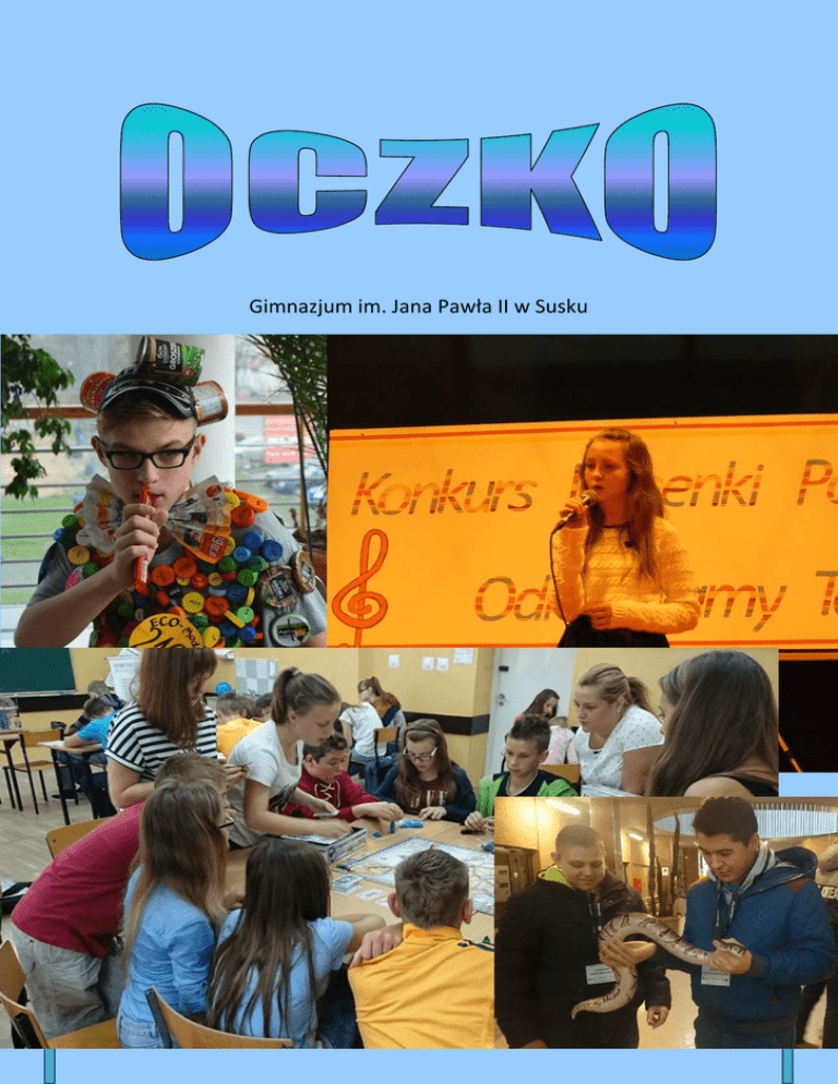 Gimnazjum im. Jana Pawła II w Susku Oczko nr1 2015/2016 Strona 1 Wyjazd do Sierpca Dnia 26 listopada 2015r. uczniowie klas drugich pod opieką p. B. Lemanowicz,p . A. Bajkowskiej i p. A.Kobyłeckiej wzięli udział w wycieczce do Sierpca. Najpierw pojechaliśmy do Ratusza w Sierpcu, gdzie odbyły się warsztaty Andrzejkowe. Każdy skorzystał z wielu wróżb i mógł przepowiedzied sobie przyszłośd, co bardzo się wszystkim spodobało. Następnie przeszliśmy do szpitala, gdzie pani pielęgniarka opowiedziała nam o swojej pracy i oprowadziła po oddziale dziecięcym. Później udaliśmy się do siłowni, gdzie każdy przez godzinę mógł skorzystad z dowolnych urządzeo. Na koniec wycieczki pojechaliśmy do restauracji Mcdonald, aby posilid się po ciekawym dniu. Zadowoleni wróciliśmy do Suska. B. Wewiórowska Oczko nr1 2015/2016 Strona 2 Dzieo Edukacji Narodowej Dnia 13 października 2015r w naszym gimnazjum uroczyście obchodziliśmy Dzieo Edukacji Narodowej. Już od samego rana w szkole panowała świąteczna atmosfera. Naszym drogim wychowawcom, nauczycielom i pracownikom szkoły składaliśmy życzenia, wręczaliśmy kwiaty, dziękowaliśmy Im za trud, jaki każdego dnia wkładają w naszą edukację i wychowanie. Dopełnieniem tego wyjątkowego dnia była uroczysta akademia przygotowana przez uczniów naszej szkoły pod opieką p. B Błażejewskiej. Gimnazjaliści zaprezentowali montaż równo-muzyczny, a w części drugiej w formie kabaretu pokazali, jak wygląda codzienna „szara” szkolna rzeczywistośd. „Aktorzy” stanęli na wysokości zadania i fantastycznie wcielili się w swoje role. Było dużo śmiechu, przedstawienie bardzo spodobało się wszystkim obecnym. Podczas akademii pan dyrektor wręczył nagrody wyróżniającym się nauczycielom. W obchodach DEN uczestniczyli nauczyciele emeryci. Szkoda, że takie święto mamy tylko jeden raz w roku. Góra Grosza W naszej szkole w dniach od 23 listopada do 4 grudnia 2015r. zorganizowana była „Góra Grosza”. Akcja ta miała na celu zebranie funduszy na pomoc dzieciom wychowywanych poza własną rodziną. Zebraliśmy w monetach aż 34,13zł Dziękujemy Oczko nr1 2015/2016 Strona 3 Szkolne Koło Ligi Ochrony Przyrody 16.12.2015r odbyło się uroczyste podsumowanie konkursu „Ptaki Doliny środkowej Wisły”, którego organizatorem był zarząd Okręgu Ligi Ochrony Przyrody w Płocku. Laureatami zostali: Martyna Dybowska z kl 3a - ll miejsce (opiekun merytoryczny Joanna Urbaoska) Mariusz Jaworski z kl 2b – lll miejsce (opiekun Anna Kobyłecka). Szkolne Koło Ligi Ochrony przyrody otrzymało również zaszczytne ll miejsce w konkursie „Najlepiej pracujące Koło Ligi Ochrony Przyrody” w roku szkolnym 2014/2015r. w regionie płockim. W tym konkursie laureatką została Anna Topolewska z kl. 3a zajmując ll miejsce. Podziękowanie otrzymała również Opiekun koła- p. Joanna Urbaoska za cenny wkład w realizację programu edukacyjnego Ligi Ochrony Przyrody. Gratulujemy laureatom i p. Joannie Urbaoskiej za reprezentowanie naszej szkoły. Życzymy kolejnych sukcesów. Rajd „Harcerki Mart” 28.11.2015r. odbył się Rajd „Harcerki Mort” przygotowany przez nasza drużynę harcerską DSH21 im. Szarych Szeregów. Był to rajd przygotowany dla naszych „nowych” członków, odbył się w Susku. Nasi młodzi harcerze musieli wędrowad wg. mapki i meldowad się w punktach kontrolnych, gdzie wykonywali dodatkowe zadania. Sprawdziliśmy „młodziaków” ze znajomości udzielania pierwszej pomocy, z wiedzy o harcerstwie i przysięgi harcerskiej. Resztę czasu spędziliśmy na śpiewaniu przyśpiewek harcerskich , grach (kalambury) i zadaniach. Opiekunem na rajdzie była Martyna Witkowska. Za przygotowanie logistyczne, mapki, punkty kontrolne oraz zadania dodatkowe dla „Młodziaków” były odpowiedzialne: Ewa Sieklucka, Kinga Miaśkiewicz, Paulina Goździkowska, Agata Amroziak, Patrycja i Natalia Jażdzewskie , Kasia Fijałkowska, Magdalena Jackowska i Weronika Zielioska Czuwaj Oczko nr1 2015/2016 Strona 4 Sukcesy sportowe 15.X.15r Udział w zawodach rejonowych rejonu płockiego w piłce siatkowej dziewcząt i chłopców. Zawody odbyły się w Mochowie chłopcy II miejsce dziewczęta III miejsce. 4.XII.15r. Na sierpeckiej pływalni rozegrano powiatowe zawody w plywaniu .Organizatorami zawodów byli; MOSiR Sierpc ,Powiatowy Szkolny Związek Sportowy w Sierpcu , Klub Plywacki "Shark" ,Kryta Pływalnia w Sierpcu. W zawodach wzięło udział 250 dzieci i młodzieży szkolnej z 12 szkół. Uzyskano wiele bardzo dobrych wyników. Dla szkół podstawowych i gimnazjów były to jednocześnie eliminacje do zawodów rejonowych . Fenomenalny start naszych uczniów Oliwi Ossowskiej na dystansie 50 m st. klasycznym II msc., Jakuba Ossowskiego na dystansie 50 m. st. dowolnym i Marka Paciuszkiewicza na dystansie 50m. st. dowolnym III msc. 8.X.15r. Udział w między powiatowych zawodach „trójek siatkowych w Studzieocu” I miejsce chłopcy I miejsce dziewczęta Oczko nr1 2015/2016 Strona 5 Narodowe Święto Niepodległości 10 listopada w naszym gimnazjum obchodziliśmy Narodowe Święto Niepodległości. Była to już 97 rocznica odzyskania przez Polskę Niepodległości. Po wprowadzeniu sztandaru i odśpiewaniu hymnu narodowego rozpoczęła się uroczysta akademia przygotowana rzez uczniów klas drugich pod opieką p. A. Bajkowskiej. Przypomniano nam naszą historię, najważniejsze postacie i wydarzenia, które doprowadziły do powstania suwerennej i wolnej Polski. Następnie uczniowie reprezentowali inscenizację. Oprócz niezwykle wzruszającej gry aktorskiej mogliśmy obejrzed prezentację multimedialną związaną z uroczystością. Wyjątkowośd tegorocznej akademii polegała na wyłonieniu się polskiego patrioty. Należy pamiętad, że współczesny patriotyzm to pamięd, szacunek do historii, wzorowa postawa obywatelska, kultura osobista, a także poświęcenie dla innych ludzi. Oczko nr1 2015/2016 Strona 6 