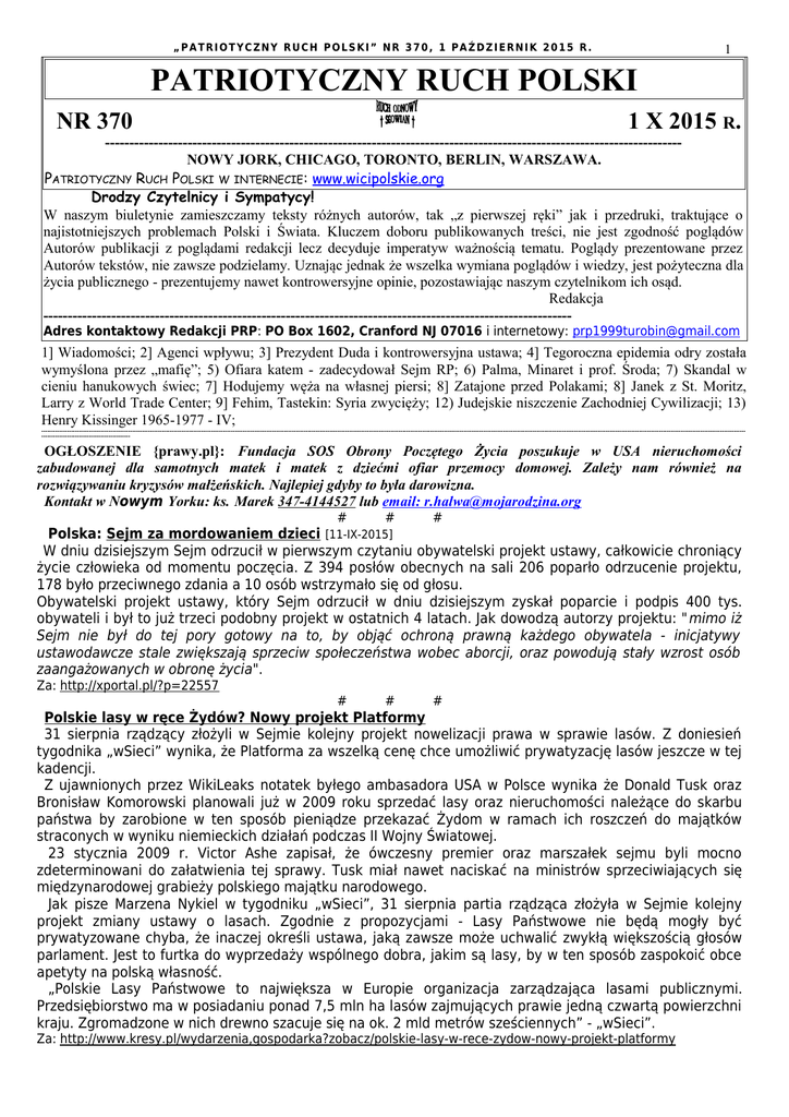 „PATRIOTYCZNY RUCH POLSKI” NR 370, 1 PAŹDZIERNIK 2015 R. 1 PATRIOTYCZNY RUCH POLSKI NR 370 1 X 2015 R. ----------------------------------------------------------------------------------------------------------------------NOWY JORK, CHICAGO, TORONTO, BERLIN, WARSZAWA. PATRIOTYCZNY RUCH POLSKI W INTERNECIE: www.wicipolskie.org Drodzy Czytelnicy i Sympatycy! W naszym biuletynie zamieszczamy teksty różnych autorów, tak „z pierwszej ręki” jak i przedruki, traktujące o najistotniejszych problemach Polski i Świata. Kluczem doboru publikowanych treści, nie jest zgodność poglądów Autorów publikacji z poglądami redakcji lecz decyduje imperatyw ważnością tematu. Poglądy prezentowane przez Autorów tekstów, nie zawsze podzielamy. Uznając jednak że wszelka wymiana poglądów i wiedzy, jest pożyteczna dla życia publicznego - prezentujemy nawet kontrowersyjne opinie, pozostawiając naszym czytelnikom ich osąd. Redakcja ------------------------------------------------------------------------------------------------------------Adres kontaktowy Redakcji PRP: PO Box 1602, Cranford NJ 07016 i internetowy: [email protected] 1] Wiadomości; 2] Agenci wpływu; 3] Prezydent Duda i kontrowersyjna ustawa; 4] Tegoroczna epidemia odry została wymyślona przez „mafię”; 5) Ofiara katem - zadecydował Sejm RP; 6) Palma, Minaret i prof. Środa; 7) Skandal w cieniu hanukowych świec; 7] Hodujemy węża na własnej piersi; 8] Zatajone przed Polakami; 8] Janek z St. Moritz, Larry z World Trade Center; 9] Fehim, Tastekin: Syria zwycięży; 12) Judejskie niszczenie Zachodniej Cywilizacji; 13) Henry Kissinger 1965-1977 - IV; ----------------------------------------------------------------------------------------------------------------------------------------------------------------------------------------------------------------------------------------------------------------------------------------------------------------------------------------------------------------------------------------------------------------- OGŁOSZENIE {prawy.pl}: Fundacja SOS Obrony Poczętego Życia poszukuje w USA nieruchomości zabudowanej dla samotnych matek i matek z dziećmi ofiar przemocy domowej. Zależy nam również na rozwiązywaniu kryzysów małżeńskich. Najlepiej gdyby to była darowizna. Kontakt w Nowym Yorku: ks. Marek 347-4144527 lub email: [email protected] # # # Polska: Sejm za mordowaniem dzieci [11-IX-2015] W dniu dzisiejszym Sejm odrzucił w pierwszym czytaniu obywatelski projekt ustawy, całkowicie chroniący życie człowieka od momentu poczęcia. Z 394 posłów obecnych na sali 206 poparło odrzucenie projektu, 178 było przeciwnego zdania a 10 osób wstrzymało się od głosu. Obywatelski projekt ustawy, który Sejm odrzucił w dniu dzisiejszym zyskał poparcie i podpis 400 tys. obywateli i był to już trzeci podobny projekt w ostatnich 4 latach. Jak dowodzą autorzy projektu: " mimo iż Sejm nie był do tej pory gotowy na to, by objąć ochroną prawną każdego obywatela - inicjatywy ustawodawcze stale zwiększają sprzeciw społeczeństwa wobec aborcji, oraz powodują stały wzrost osób zaangażowanych w obronę życia". Za: http://xportal.pl/?p=22557 # # # Polskie lasy w ręce Żydów? Nowy projekt Platformy 31 sierpnia rządzący złożyli w Sejmie kolejny projekt nowelizacji prawa w sprawie lasów. Z doniesień tygodnika „wSieci” wynika, że Platforma za wszelką cenę chce umożliwić prywatyzację lasów jeszcze w tej kadencji. Z ujawnionych przez WikiLeaks notatek byłego ambasadora USA w Polsce wynika że Donald Tusk oraz Bronisław Komorowski planowali już w 2009 roku sprzedać lasy oraz nieruchomości należące do skarbu państwa by zarobione w ten sposób pieniądze przekazać Żydom w ramach ich roszczeń do majątków straconych w wyniku niemieckich działań podczas II Wojny Światowej. 23 stycznia 2009 r. Victor Ashe zapisał, że ówczesny premier oraz marszałek sejmu byli mocno zdeterminowani do załatwienia tej sprawy. Tusk miał nawet naciskać na ministrów sprzeciwiających się międzynarodowej grabieży polskiego majątku narodowego. Jak pisze Marzena Nykiel w tygodniku „wSieci”, 31 sierpnia partia rządząca złożyła w Sejmie kolejny projekt zmiany ustawy o lasach. Zgodnie z propozycjami - Lasy Państwowe nie będą mogły być prywatyzowane chyba, że inaczej określi ustawa, jaką zawsze może uchwalić zwykłą większością głosów parlament. Jest to furtka do wyprzedaży wspólnego dobra, jakim są lasy, by w ten sposób zaspokoić obce apetyty na polską własność. „Polskie Lasy Państwowe to największa w Europie organizacja zarządzająca lasami publicznymi. Przedsiębiorstwo ma w posiadaniu ponad 7,5 mln ha lasów zajmujących prawie jedną czwartą powierzchni kraju. Zgromadzone w nich drewno szacuje się na ok. 2 mld metrów sześciennych” - „wSieci”. Za: http://www.kresy.pl/wydarzenia,gospodarka?zobacz/polskie-lasy-w-rece-zydow-nowy-projekt-platformy 2 „PATRIOTYCZNY RUCH POLSKI” NR 370, 1 PAŹDZIERNIK 2015 R. # # # UWAGA! Wielbiona przez rząd Biedronka pomaga uczyć dzieci o ... homofobii! [18 Sierpień 2015] W sieci sklepów Biedronka sprzedawane są książeczki dla dzieci zatytułowane „Mały słownik ważnych pojęć”. Ostrzegamy rodziców - publikacja ta wpisuje się w promocję homoseksualizmu. Cywilizacja, doping, feministka, strajk, ekologia, imigrant... Te słowa, bardzo często, pojawiają się w rozmowach dorosłych. Dzieci słysząc je nie zawsze znają ich sens. Niniejszy słownik w niekonwencjonalny sposób, za pomocą komiksów - podaje ich definicje. Zachęca też do zgłębiania wielu zagadnień i poznawania zjawisk zachodzących we współczesnym świecie - taki opis książeczki przedstawia wydawnictwo Olesiejuk, brzmi interesująco nieprawdaż? ale rodzice muszą wiedzieć, że książeczka ta wpisuje się w coraz śmielej sobie poczynającą homo-propagandę! „Niezwykły rodzaj encyklo