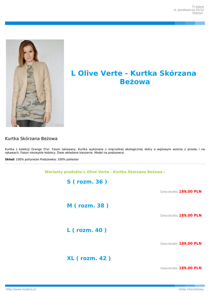Ti Adoro ul. Jeziołowicza 25/12 Olsztyn L Olive Verte - Kurtka Skórzana Beżowa Kurtka Skórzana Beżowa Kurtka z kolekcji Orange O'or. Fason taliowany. Kurtka wykonana z mięciutkiej ekologicznej skóry o wężowym wzorze z przodu i na rękawach. Fason niezwykle kobiecy. Dwie wkładane kieszenie. Model na podszewce. Skład: 100% poliuretan Podszewka: 100% poliester Warianty produktu L Olive Verte - Kurtka Skórzana Beżowa : S ( rozm. 36 ) Cena brutto: 189,00 PLN Cena brutto: 189,00 PLN Cena brutto: 189,00 PLN Cena brutto: 189,00 PLN M ( rozm. 38 ) L ( rozm. 40 ) XL ( rozm. 42 ) http://www.tiadoro.pl sklep internetowy