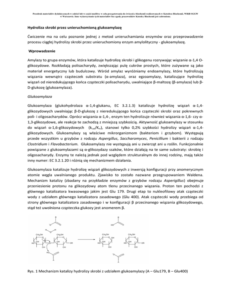 Przedruk materiałów dydaktycznych w całości lub w części możliwy w celu przygotowania do ćwiczeń z biochemii realizowanych w Katedrze Biochemii, WRiB SGGW w Warszawie. Inne wykorzystanie tych materiałów bez zgody pracowników Katedry Biochemii jest zabronione. Hydroliza skrobi przez unieruchomioną glukoamylazę Ćwiczenie ma na celu poznanie jednej z metod unieruchamiania enzymów oraz przeprowadzenie procesu ciągłej hydrolizy skrobi przez unieruchomiony enzym amylolityczny - glukoamylazę. Wprowadzenie Amylazy to grupa enzymów, która katalizuje hydrolizę skrobi i glikogenu rozrywając wiązanie α-1,4 Oglikozydowe. Rozkładają polisacharydy, zwiększając pulę cukrów prostych, które zużywane są jako materiał energetyczny lub budulcowy. Wśród amylaz wyróżniamy endoamylazy, które hydrolizują wiązania wewnątrz cząsteczek substratu (α-amylaza), oraz egzoamylazy, katalizujące hydrolizę wiązań od nieredukującego końca cząsteczki polisacharydu, uwalniające β-maltozę (β-amylaza) lub βD-glukozę (glukoamylaza). Glukoamylaza Glukoamylaza (glukohydrolaza α-1,4-glukanu, EC 3.2.1.3) katalizuje hydrolizę wiązań α-1,4glikozydowych uwalniając β-D-glukozę z nieredukującego końca cząsteczki skrobi oraz pokrewnych poli- i oligosacharydów. Oprócz wiązania α-1,4-, enzym ten hydrolizuje również wiązania α-1,6- czy α1,3-glikozydowe, ale reakcje te zachodzą z mniejszą szybkością. Aktywność glukoamylazy w stosunku do wiązań α-1,6-glikozydowych (kcat/Km), stanowi tylko 0,2% szybkości hydrolizy wiązań α-1,4glikozydowych. Glukoamylazy są właściwe mikrorganizmom (bakteriom i grzybom). Występują przede wszystkim u grzybów z rodzaju Aspergillus, Saccharomyces, Penicillium i bakterii z rodzaju Clostridium i Flavobacterium. Glukoamylazy nie występują ani u zwierząt ani u roślin. Funkcjonalnie powiązane z glukoamylazami są α-glikozydazy ssaków, które działają na te same substraty: skrobię i oligosacharydy. Enzymy te należą jednak pod względem strukturalnym do innej rodziny, mają także inny numer: EC 3.2.1.20 i różnią się mechanizmem działania. Glukoamylaza katalizuje hydrolizę wiązań glikozydowych z inwersją konfiguracji przy anomerycznym atomie węgla uwalnianego produktu. Zjawisko to zostało nazwane przegrupowaniem Waldena. Mechanizm katalizy (zbadany na przykładzie enzymów z grzybów rodzaju Asperigillus) obejmuje przeniesienie protonu na glikozydowy atom tlenu przecinanego wiązania. Proton ten pochodzi z głównego katalizatora kwasowego jakim jest Glu 179. Drugi etap to nukleofilowy atak cząsteczki wody z udziałem głównego katalizatora zasadowego (Glu 400). Atak cząsteczki wody przebiega od strony głównego katalizatora zasadowego i w konfiguracji β przecinanego wiązania glikozydowego, stąd też uwolniona cząsteczka glukozy jest anomerem β. Rys. 1 Mechanizm katalizy hydrolizy skrobi z udziałem glukoamylazy (A – Glu179, B – Glu400) Przedruk materiałów dydaktycznych w całości lub w części możliwy w celu przygotowania do ćwiczeń z biochemii realizowanych w Katedrze Biochemii, WRiB SGGW w Warszawie. Inne wykorzystanie tych materiałów bez zgody pracowników Katedry Biochemii jest zabronione. Glukoamylazy z grzybów, jak większość wydzielanych białek eukariotycznych, są glikozylowane (zarówno O- jak i N-glikozylacje). Większość szczepów A. niger wydziela dwie główne formy glukoamylazy różniące się masą cząsteczkową (forma G1 – 99 kDa, G2 – 112 kDa) przy czym obie posiadają podobną budowę części białkowej, a różnią się udziałem części cukrowej (we frakcji cięższej udział reszt cukrowych jest dwa razy większy). Formy te są kodowane przez jeden gen i forma G2 powstaje w wyniku wycięcia intronu z pierwotnego transkryptu. Glikozylacja obu form jest skutkiem modyfikacji potranslacyjnych powstałych białek. Uważa się, że wysoka zawartość reszt cukrowych w enzymie pozwala na utrzymanie biologicznie aktywnej konformacji enzymu oraz wpływa na jego stabilność w podwyższonej temperaturze, czy w szerokim zakresie pH. Część białkowa składa się z dwóch domen, domeny katalitycznej i domeny wiążącej skrobię. Domena katalityczna składa się z 13 α-helis, z czego 12 tworzy kształt podobny do beczki [(α/α) 6-barrel]. Wewnątrz niej znajduje się centrum aktywne, utworzone przez 6 wysoce konserwatywnych odcinków α→α. Tu znajdują się kluczowe dla reakcji hydrolizy aminokwasy kontaktowe (A. awamori – Glu 179 i Glu 400). Do C-terminalnej części domeny katalitycznej przyłączona jest, poprzez giętki łącznik, domena wiążąca skrobię. Po przeciwległych jej stronach znajdują się dwa regiony odpowiedzialne za przyłączanie substratu. Domena ta wiąże skrobię rozrywając jej zbitą strukturę, co wydatnie ułatwia jej hydrolizę przez domenę katalityczną. Zastosowanie glukoamylazy w przemyśle Ze względu na stosunkowo prosty sposób otrzymywania preparatów enzymatycznych glukoamylazy i ich stabilność, uzyskuje się je na skalę przemysłową głównie z grzybów z rodzaju Aspergillus. Te glukoamylazy są odporne na zmiany pH, (zachowując aktywność w zakresie pH od 1,8 do 10,5) i wysoką temperaturę, ich optymalna temperatura to 40 – 65°C. Glukoamylaza jest wykorzystywana do produkcji cukrów rozpuszczalnych ze skrobi po uprzedniej jej hydrolizie. Znanych jest kilka metod hydrolizy skrobi. Na skalę techniczną stosuje się kwaśną hydrolizę lub metody enzymatyczne. Wydajność procesu kwaśnej hydrolizy skrobi nie przekracza 80% z powodu rewersji lub też rozkładu glukozy. Dlatego metoda ta jest coraz rzadziej wykorzystywana, a zastępuje się ją tańszą i wydajniejszą (o 5 – 12%) metodą hydrolizy enzymatycznej. Otrzymuje się w ten sposób hydrolizaty o wyższej jakości, bez konieczności stosowania materiałów odpornych na działanie silnych kwasów i wysokiej temperatury. Opracowano kilka metod