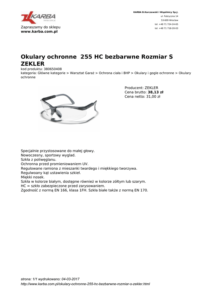 KARBA B.Karczewski i Wspólnicy Sp.J. ul. Fabryczna 14 53-609 Wrocław tel. +48 71 724-24-65 Zapraszamy do sklepu www.karba.com.pl tel. +48 71 718-20-03 Okulary ochronne 255 HC bezbarwne Rozmiar S ZEKLER kod produktu: 380650408 kategoria: Główne kategorie > Warsztat Garaż > Ochrona ciała i BHP > Okulary i gogle ochronne > Okulary ochronne Producent: ZEKLER Cena brutto: 38,13 zł Cena netto: 31,00 zł Specjalnie przystosowane do małej głowy. Nowoczesny, sportowy wyglad. Szkła z poliwęglanu. Ochronna przed promieniowaniem UV. Regulowane ramiona z mieszanki twardego i miękkiego tworzywa. Regulwoany kąt ustawienia szkieł. Miękki nosek. Szkła w kolorze białym, dostępne również w kolorze zółtym lub szarym. HC = szkło zabezpieczone przed zarysowaniem. Zgodność z normą EN 166, klasa 1FH. Szkła białe także z normą EN 170. strona: 1/1 wydrukowano: 04-03-2017 http://www.karba.com.pl/okulary-ochronne-255-hc-bezbarwne-rozmiar-s-zekler.html