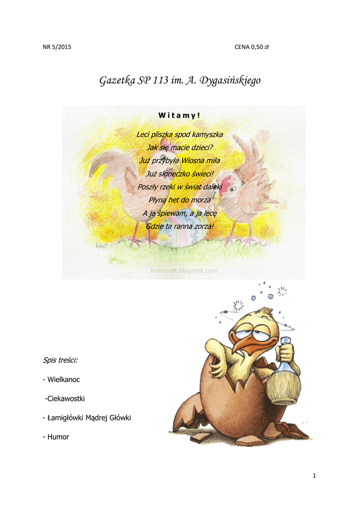 NR 5/2015 CENA 0,50 zł Gazetka SP 113 im. A. Dygasińskiego Witamy! Leci pliszka spod kamyszka Jak się macie dzieci? Już przybyła Wiosna miła Już słoneczko świeci! Poszły rzeki w świat daleki Płyną het do morza A ja śpiewam, a ja lecę Gdzie ta ranna zorza! Spis treści: - Wielkanoc -Ciekawostki - Łamigłówki Mądrej Główki - Humor 1 Święta, święta … Świąteczny czas Wkrótce święto wielkanocne. Przygotujcie wiadra mocne. Do dyngusa, do śmigusa ( nie wskazana suknia kusa). Pomalujcie pisaneczki W kółka, fale i kropeczki. Śmigus – dyngus Zając, jajka i kurczaki. To są wielkanocne znaki. Woda leje się z sikawki. Aż spadają dziewczyny z ławki. Chłopcy biegną z wiaderkami. Nie chcą być polani sami. Wielu radosnych i niepowtarzalnych chwil Na Święta Wielkanocne Serdecznych spotkań rodzinnych przy świątecznym, suto zastawionym stole 2 Przyjaznych rozmów, miłych gestów i wszelkiej pomyślności życzy Zespół redakcyjny Przedłużacza Łamigłówki mądrej główki 1. Dwaj ojcowie podarowali synom pieniądze. Jeden dał swemu synowi 150 zł, a drugi zaś dał swojemu 100 zł. Okazuje się jednak, że obaj synowie razem powiększyli swoje kapitały tylko o 150 zł. Pytanie: Jak to wyjaśnić? 2. Sześciu chłopcom dano woreczek, zawierający sześć batonów czekoladowych. Chłopcy podzielili się w ten sposób, że każdy dostał jeden baton, a jednak na końcu jeden baton pozostał w woreczku. Pytanie: Jak to się stało? 3. Na strychu suszy się 13 par białych skarpetek i 9 par czarnych skarpetek. Jest tam jednak tak ciemno, że nie widać ich kolorów. Marek chce wziąć ze strychu jedną parę. Pytanie: Ile pojedynczych skarpetek powinien zabrać, aby mieć pewność, że wśród nich znajdą się dwie w tym samym kolorze? (Odpowiedzi znajdziesz na następnej stronie). Kwiatki, kwiatuszki … Są tacy, którzy wierzą w znaczenie kwiatów i tak np.: Róża czerwona – kocham cię mocno Róża herbaciana – podobasz mi się Róża biała – wzdycham do ciebie róża różowa – przysięgam ci miłość Pierwiosnek – moje uczucia są coraz gorętsze Niezapominajka – wspomnij mnie Narcyz – jesteś bez serca Bratek – królujesz w moich myślach Fiołek – nikt nie wie o naszej miłości 3 Jaśmin – czy mnie kiedyś pokochasz? Lilia biała – czyste uczucie Ciekawostki różne 1. Księżyc oddala się od Ziemi z szybkością 4 cm rocznie 2. Dynie mogą być 5 miliardów cięższe od najlżejszych owoców świata – wolfii bezkorzeniowej. 3. Choć wszyscy wiedzą, że jajko składa się z żółtka i białka, to większość z nas nie zdaje sobie sprawy, jak dużo witamin i minerałów zawiera jajko: waga ok. 0, 60 dag energia 75 kcal tłuszcz ok. 7g łatwo przyswajalne składniki mineralne: - wapń, żelazo, fosfor - witaminy A, D oraz te z grupy B - cholesterol - białko 4. Ciekawostka o zajączku – ma długość od 35 do 75 cm, a wysokość ok. 30 cm, jego ogon zwany omykiem ma długość 8-10 cm. Waży 3-6 kg. Ogon zająca jest od góry czarny, na spodzie biały. Nogi zająca nazywa się skokami, natomiast uszy – słuchami. Łapy są wąsie i twarde, przystosowane do biegania po twardym terenie. Tylne nogi są znacznie dłuższe od przednich. Futro ma szarobrązowy kolor, w zimie jest jaśniejsze i gęstsze niż w lecie. Odpowiedzi: 4 1.Byli to: syn, ojciec i dziadek. Dziadek dał ojcu 150 zł, ojciec dał synowi 100 zł. Ojcu zostało 50 zł, a syn miał 100 zł, czyli razem 150 zł. 2.Każdy chłopiec wziął po jednym batonie, a ostatni wziął go razem z woreczkiem. 3.Wystarczy zabrać 3 skarpetki. Ponieważ są tylko dwa kolory, na pewno któreś dwie będą do pary. Rozwiąż rebusy +wielka+ +ny ło+na 5 asek+ i=a Stopka redakcyjna: Z. Dąbrowska, P. Kościuk, S. Ziembińska Opiekun: p. J. Grawińska DOWCIPY O KURCZAKACH I ZAJĄCZKACH 1. Kura z kogutem jadą ze wsi do miasta, napotykają budkę z kurczakiem z rożna. Kura mówi do koguta: - Patrz my tam na wsi harujemy a tu karuzela z solarium. 2. Kura skarży się kurze: - Tej nocy miałam taką gorączkę, że zniosłam jajko na twardo. 3. -Zajączku dlaczego masz takie krótki uszy? - Bo jestem romantyczny. - Nie rozumiem. - Wczoraj siedziałem na łące i słuchałem śpiewu słowika. Tak się zasłuchałem, że nie usłyszałem kosiarki… 4. Idzie zajączek przez las i sobie na głos śpiewa: - Pomylone misie, pomylone misie… Nagle na drodze staje wielki groźny niedźwiedź. A zajączek omija go i śpiewa dalej: - Pomyliło mi się, pomyliło mi się… 6 7