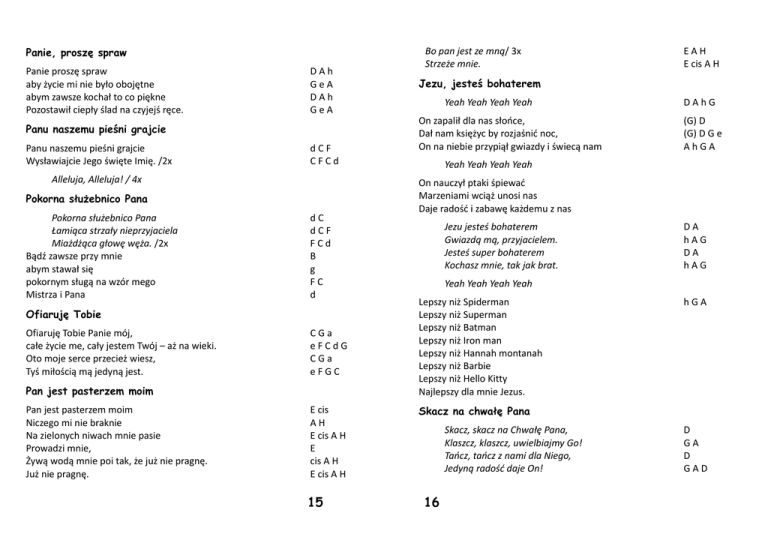 Panie, proszę spraw Panie proszę spraw aby życie mi nie było obojętne abym zawsze kochał to co piękne Pozostawił ciepły ślad na czyjejś ręce. DAh GeA DAh GeA Panu naszemu pieśni grajcie Panu naszemu pieśni grajcie Wysławiajcie Jego święte Imię. /2x dCF CFCd Alleluja, Alleluja! / 4x Pokorna służebnico Pana Pokorna służebnico Pana Łamiąca strzały nieprzyjaciela Miażdżąca głowę węża. /2x Bądź zawsze przy mnie abym stawał się pokornym sługą na wzór mego Mistrza i Pana dC dCF FCd B g FC d Ofiaruję Tobie Ofiaruję Tobie Panie mój, całe życie me, cały jestem Twój – aż na wieki. Oto moje serce przecież wiesz, Tyś miłością mą jedyną jest. CGa eFCdG CGa eFGC Pan jest pasterzem moim Pan jest pasterzem moim Niczego mi nie braknie Na zielonych niwach mnie pasie Prowadzi mnie, Żywą wodą mnie poi tak, że już nie pragnę. Już nie pragnę. E cis AH E cis A H E cis A H E cis A H 15 Bo pan jest ze mną/ 3x Strzeże mnie. EAH E cis A H Jezu, jesteś bohaterem Yeah Yeah Yeah Yeah On zapalił dla nas słońce, Dał nam księżyc by rozjaśnić noc, On na niebie przypiął gwiazdy i świecą nam DAhG (G) D (G) D G e AhGA Yeah Yeah Yeah Yeah On nauczył ptaki śpiewać Marzeniami wciąż unosi nas Daje radość i zabawę każdemu z nas Jezu jesteś bohaterem Gwiazdą mą, przyjacielem. Jesteś super bohaterem Kochasz mnie, tak jak brat. DA hAG DA hAG Yeah Yeah Yeah Yeah Lepszy niż Spiderman Lepszy niż Superman Lepszy niż Batman Lepszy niż Iron man Lepszy niż Hannah montanah Lepszy niż Barbie Lepszy niż Hello Kitty Najlepszy dla mnie Jezus. hGA Skacz na chwałę Pana Skacz, skacz na Chwałę Pana, Klaszcz, klaszcz, uwielbiajmy Go! Tańcz, tańcz z nami dla Niego, Jedyną radość daje On! 16 D GA D GAD Z całego serca zatańcz dla Niego, On swymi dziećmi nazywa nas. Oddaj Mu wszystko, On patrzy z nieba, więc wznieś wzrok ku górze i tańcz. D GA D GA