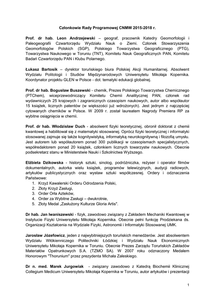 Członkowie Rady Programowej CNMW 2015-2018 r. Prof. dr hab. Leon Andrzejewski – geograf, pracownik Katedry Geomorfologii i Paleogeografii Czwartorzędu Wydziału Nauk o Ziemi. Członek Stowarzyszenia Geomorfologów Polskich (SGP), Polskiego Towarzystwa Geograficznego (PTG), Towarzystwa Naukowego w Toruniu (TNT), Komitetu Nauk Geograficznych PAN, Komitetu Badań Czwartorzędu PAN i Klubu Polarnego. Łukasz Bartosik – dyrektor toruńskiego biura Polskiej Akcji Humanitarnej. Absolwent Wydziału Politologii i Studiów Międzynarodowych Uniwersytetu Mikołaja Kopernika. Koordynator projektu GLEN w Polsce - dot. tematyki edukacji globalnej. Prof. dr hab. Bogusław Buszewski - chemik, Prezes Polskiego Towarzystwa Chemicznego (PTChem), wiceprzewodniczący Komitetu Chemii Analitycznej PAN, członek rad wydawniczych 25 krajowych i zagranicznych czasopism naukowych, autor albo współautor 15 książek, licznych patentów (w większości już wdrożonych). Jest jednym z najczęściej cytowanych chemików w Polsce. W 2009 r. został laureatem Nagrody Premiera RP za wybitne osiągnięcia w chemii. Prof. dr hab. Włodzisław Duch - absolwent fizyki teoretycznej, obronił doktorat z chemii kwantowej a habilitował się z matematyki stosowanej. Oprócz fizyki teoretycznej i informatyki stosowanej zajmuje się także kognitywistyką, informatyką neurokognitywną i filozofią umysłu. Jest autorem lub współautorem ponad 300 publikacji w czasopismach specjalistycznych, współredaktorem ponad 20 książek, członkiem licznych towarzystw naukowych. Obecnie podsekretarz stanu w Ministerstwie Nauki i Szkolnictwa Wyższego. Elżbieta Dzikowska - historyk sztuki, sinolog, podróżniczka, reżyser i operator filmów dokumentalnych, autorka wielu książek, programów telewizyjnych, audycji radiowych, artykułów publicystycznych oraz wystaw sztuki współczesnej. Ordery i odznaczenia Państwowe: 1. Krzyż Kawalerski Orderu Odrodzenia Polski, 2. Złoty Krzyż Zasługi, 3. Order Orła Azteków, 4. Order za Wybitne Zasługi – dwukrotnie, 5. Złoty Medal „Zasłużony Kulturze Gloria Artis". Dr hab. Jan Iwaniszewski - fizyk, zawodowo związany z Zakładem Mechaniki Kwantowej w Instytucie Fizyki Uniwersytetu Mikołaja Kopernika. Obecnie pełni funkcję Prodziekana ds. Organizacji Kształcenia na Wydziale Fizyki, Astronomii i Informatyki Stosowanej UMK. Jarosław Józefowicz, jeden z najwybitniejszych toruńskich menedżerów. Jest absolwentem Wydziału Włókienniczego Politechniki Łódzkiej i Wydziału Nauk Ekonomicznych Uniwersytetu Mikołaja Kopernika w Toruniu. Obecnie Prezes Zarządu Toruńskich Zakładów Materiałów Opatrunkowych S.A. (TZMO SA). W 2007 roku odznaczony Medalem Honorowym "Thorunium" przez prezydenta Michała Zaleskiego. Dr n. med. Marek Jurgowiak - związany zawodowo z Katedrą Biochemii Klinicznej Collegium Medicum Uniwersytetu Mikołaja Kopernika w Toruniu, autor artykułów i prezentacji 1 popularyzujących zagadnienia biologii, biochemii i medycyny, m.in. w pismach i magazynach: „Wiedza i Życie”, „Focus”, „Postępy Biochemii”, „Kosmos”, „Gazeta Wyborcza”. Prof. dr hab. Andrzej Kus – astronom, posiada duży dorobek naukowy i bogate doświadczenie w radioastronomii. Łącznie opublikował ponad 100 prac. Ponad sześć lat spędził w wiodących ośrodkach badawczych w Europie i USA. Przez wiele lat był kierownikiem Katedry Radioastronomii UMK, a w latach 2001-2010 pełnił funkcję dyrektora Centrum Astronomii UMK. Dr Maja Lewandowska-Robak – chemik z wykształcenia, obecnie dyrektor Wydziału Rozwoju i Programowania Europejskiego Urzędu Miasta Torunia. Ukończyła studia magisterskie na Wydziale Chemii Uniwersytetu Mikołaja Kopernika w Toruniu i tam zrobiła doktorat. Dr hab. Jerzy Łukaszewicz, prof. UMK – chemik, dyrektor Interdyscyplinarnego Centrum Nowoczesnych Technologii w Toruniu. Jego zainteresowania naukowe związane są z detekcją par i gazów, fizykochemią zjawisk powierzchniowych oraz syntezą nowych materiałów. Dr hab. Janusz Leon Wiśniewski jest fizykiem, chemikiem, informatykiem oraz pisarzem. Współautor pierwszego w świecie programu komputerowego AutoNom do automatycznego tworzenia systematycznych nazw organicznych związków chemicznych na podstawie ich wzorów strukturalnych. Współredaguje naukowe czasopismo informatyczne wydawane w Internecie. Autor licznych książek wśród których można wymienić: „S@motność w Sieci”, „Zespoły Napięć”, „Bikini” czy „Grand”. Został uhonorowany w Alei Gwiazd w swym rodzinnym mieście Toruniu. Izabela Ziętara – dyrektor Gimnazjum nr 3 im. Jana Pawła II w Toruniu, od lat aktywnie zaangażowana w działania zakresu edukacji formalnej i nieformalnej, m. in. jako nauczyciel z zakresu biologii, hydrobiologii i przyrody, wykładowca na studiach podyplomowych na Uniwersytecie Mikołaja Kopernika. 2