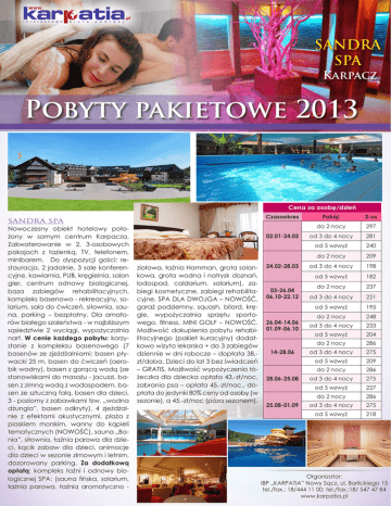 SANDRA SPA Karpacz Pobyty pakietowe 2013 Cena za osobę/dzień SANDRA SPA Nowoczesny obiekt hotelowy położony w samym centrum Karpacza. Zakwaterowanie w 2, 3-osobowych pokojach z łazienką, TV, telefonem, minibarem. Do dyspozycji gości: restauracja, 2 jadalnie, 3 sale konferencyjne, kawiarnia, PUB, kręgielnia, salon gier, centrum odnowy biologicznej, baza zabiegów rehabilitacyjnych, kompleks basenowo - rekreacyjny, solarium, sala do ćwiczeń, siłownia, sauna, parking – bezpłatny. Dla amatorów białego szaleństwa - w najbliższym sąsiedztwie 2 wyciągi, wypożyczalnia nart. W cenie każdego pobytu: korzystanie z kompleksu basenowego (7 basenów ze zjeżdżalniami: basen pływacki 25 m, basen do ćwiczeń (aerobik wodny), basen z gorącą wodą (ze stanowiskami do masażu - jacuzzi, basen z zimną wodą z wodospadem, basen ze sztuczną falą, basen dla dzieci, 3 - poziomy z zabawkami tzw. „wodna dżungla”, basen odkryty), 4 zjeżdżalnie z efektami akustycznymi, plaża z piaskiem morskim, wanny do kąpieli tematycznych (NOWOŚĆ), sauna „Bania”, siłownia, łaźnia parowa dla dzieci, kącik zabaw dla dzieci, animacje dla dzieci w sezonie zimowym i letnim, dozorowany parking. Za dodatkową opłatą: kompleks łaźni i odnowy biologicznej SPA: (sauna fińska, solarium, łaźnia parowa, łaźnia aromatyczno - Czasookres 02.01-24.02 ziołowa, łaźnia Hamman, grota solankowa, grota wodna i natrysk doznań, lodospad, caldarium, salarium), zabiegi kosmetyczne, zabiegi rehabilitacyjne, SPA DLA DWOJGA – NOWOŚĆ, garaż podziemny, squash, bilard, kręgle, wypożyczalnia sprzętu sportowego, fitness, MINI GOLF – NOWOŚĆ. Możliwość dokupienia pobytu rehabilitacyjnego (pakiet kuracyjny) dodatkowo wizyta lekarska + do 3 zabiegów dziennie w dni robocze – dopłata 38,zł/doba. Dzieci do lat 3 bez świadczeń – GRATIS. Możliwość wypożyczenia łóżeczka dla dziecka opłata 43,-zł/noc, zabrania psa – opłata 45,-zł/noc., dopłata do jedynki 80% ceny od osoby (w sezonie), a 45,-zł/noc (poza sezonem). 24.02-28.03 03-26.04 06.10-22.12 26.04-14.06 01.09-06.10 14-28.06 28.06-25.08 25.08-01.09 Pokój: 2-os do 2 nocy 297 od 3 do 4 nocy 281 od 5 wzwyż 240 do 2 nocy 209 od 3 do 4 nocy 198 od 5 wzwyż 182 do 2 nocy 237 od 3 do 4 nocy 221 od 5 wzwyż 195 do 2 nocy 248 od 3 do 4 nocy 233 od 5 wzwyż 204 do 2 nocy 286 od 3 do 4 nocy 275 od 5 wzwyż 209 do 2 nocy 286 od 3 do 4 nocy 275 od 5 wzwyż 227 do 2 nocy 286 od 3 do 4 nocy 275 od 5 wzwyż 218 Organizator: IBP „KARPATIA” Nowy Sącz, ul. Barlickiego 15 tel./fax.: 18/444 11 00; tel./fax.:18/ 547 47 84 www.karpatia.pl SANDRA SPA Karpacz Pobyty pakietowe 2013 do pobytów z wyżywieniem można dokupić pakiety SPA relaksacyjne oraz weekendowe Ceny w PLN za osobę/ pakiet w pokoju 2-os PAKIET Cena ZABIEGI DODATKOWE ŚWIADCZENIA PAKIETY WEEKENDOWE ZŁOTE RYTUAŁY PIĘKNOŚCI 530 zabieg natleniający „Eliksir życia” na ciało, masaż holistyczny stemplami ziołowymi pleców, zabieg nawilżajacy na twarz, zabieg „Piękne dłonie” łaźnia parowa z aromaterapią (30 min) MINERAŁY MORZA 460 zabieg odżywczy na twarz, zabieg oczyszczający „Potęga oceanu” na ciało, zabieg „Piękne dłonie” j.w. DLA MAMY 500 zabieg odżywczy na twarz, zabieg detoksykujący „Herbaciany ogród” na ciało, masaż rozgrzewający „Dotyk Słońca”, zabieg „Piękne dłonie” j.w. DLA CÓRKI 500 zabieg nawilżający na twarz, zabieg nawadniający „Poranna rosa” na ciało, masaż rozgrzewajacy „Dotyk Słońca”, zabieg „Piękne dłonie” j.w. DLA NIEJ 510 zabieg nawilżający na twarz, zabieg detoksykujący „Herbaciany ogród” na ciało, masaż pobudzający „Cynamonowa fantazja” j.w. DLA NIEGO 540 zabieg energetyzujący „Jato’man” na twarz, zabieg detoksykujący „Herbaciany ogród” na ciało, masaż energetyzujący „Deszczowa eskapada” j.w. SANDRA RELAX SPA 430 masaż relaksacyjny twarzy, zabieg regeneracyjny „Satynowa Kenia” na ciało, masaż relaksacyjny „Egzotyczna pokusa” j.w. filiżanka herbatki odprężającej DESER CZEKOLADOWY DLA CIAŁA 480 zabieg nawilżający lub odżywczy na twarz, zabieg czekoladowy na ciało, masaż relaksacyjny „Mleczna czekolada”, łaźnia parowa z aromaterapią (30 min), filiżanka czekolady DESER ŻURAWINOWY DLA CIAŁA 480 zabieg nawilżający lub odżywczy na twarz, zabieg żurawinowy body-lift na ciało, masaż relaksacyjny „Żurawinowe aromaty” łaźnia parowa z aromaterapią (30 min), sok żurawinowy DESER KAWOWY DLA CIAŁA 480 zabieg nawilżający lub odżywczy na twarz, zabieg kawowy na ciało, masaż relaksacyjny „Kawowe przebudzenie” łaźnia parowa z aromaterapią (30 min), filiżanka kawy PAKIETY TYGODNIOWE RELAKS I ODNOWA DLA NIEJ 660 zabieg dotleniający na twarz, masaż holistyczny stemplami ziołowymi pleców, zabieg detoksykujący „Herbaciany ogród” na ciało, masaż relaksacyjny całościowy, zabieg „Piękne dłonie”, zabieg „Lekkie stopy”, łaźnia parowa (30 min) RELAKS I ODNOWA DLA NIEGO 650 zabieg energetyzujący „Jato’man” na twarz, masaż holistyczny stemplami ziołowymi pleców, zabieg detoksykujący „Herbaciany ogród” na ciało, masaż relaksacyjny całościowy, zabieg „Piękne dłonie”, masaż częściowy klasyczny łaźnia parowa (30 min) PIĘKNA SKÓRA 720 zabieg nawilżający na twarz, peeling ciała, zabieg odżywczy na twarz, masaż relaksacyjny całościowy, zabieg nawilżający na ciało łaźnia parowa (30 min) 700 zabieg nawilżający lub odżywczy na twarz, masaż relaksacyjny „Mleczna czekolada”, zabieg „Lekkie stopy”, zabieg „Piękne dłonie”, zabieg na ciało (do wyboru kawowy, czekoladowy lub żurawinowy), masaż holistyczny stemplami ziołowymi pleców łaźnia parowa z aromaterapią (30 min) AROMATY I BOGACTWA NATURY Organizator: IBP „KARPATIA” Nowy Sącz, ul. Barlickiego 15 tel./fax.: 18/444 11 00; tel./fax.:18/ 547 47 84 www.karpatia.pl