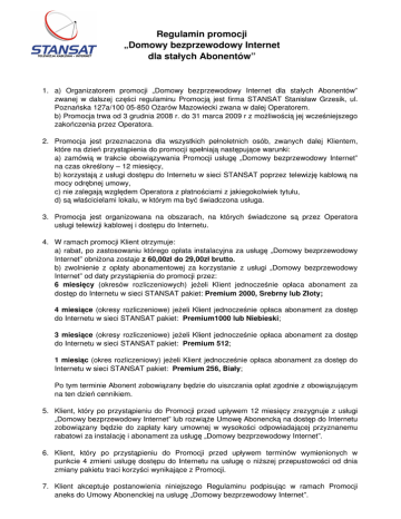 Regulamin promocji „Domowy bezprzewodowy Internet dla stałych Abonentów” 1. a) Organizatorem promocji „Domowy bezprzewodowy Internet dla stałych Abonentów” zwanej w dalszej części regulaminu Promocją jest firma STANSAT Stanisław Grzesik, ul. Poznańska 127a/100 05850 Ożarów Mazowiecki zwana w dalej Operatorem. b) Promocja trwa od 3 grudnia 2008 r. do 31 marca 2009 r z możliwością jej wcześniejszego zakończenia przez Operatora. 2. Promocja jest przeznaczona dla wszystkich pełnoletnich osób, zwanych dalej Klientem, które na dzień przystąpienia do promocji spełniają następujące warunki: a) zamówią w trakcie obowiązywania Promocji usługę „Domowy bezprzewodowy Internet” na czas określony – 12 miesięcy, b) korzystają z usługi dostępu do Internetu w sieci STANSAT poprzez telewizję kablową na mocy odrębnej umowy, c) nie zalegają względem Operatora z płatnościami z jakiegokolwiek tytułu, d) są właścicielami lokalu, w którym ma być świadczona usługa. 3. Promocja jest organizowana na obszarach, na których świadczone są przez Operatora usługi telewizji kablowej i dostępu do Internetu. 4. W ramach promocji Klient otrzymuje: a) rabat, po zastosowaniu którego opłata instalacyjna za usługę „Domowy bezprzewodowy Internet” obniżona zostaje z 60,00zł do 29,00zł brutto. b) zwolnienie z opłaty abonamentowej za korzystanie z usługi „Domowy bezprzewodowy Internet” od daty przystąpienia do promocji przez: 6 miesięcy (okresów rozliczeniowych) jeżeli Klient jednocześnie opłaca abonament za dostęp do Internetu w sieci STANSAT pakiet: Premium 2000, Srebrny lub Złoty; 4 miesiące (okresy rozliczeniowe) jeżeli Klient jednocześnie opłaca abonament za dostęp do Internetu w sieci STANSAT pakiet: Premium1000 lub Niebieski; 3 miesiące (okresy rozliczeniowe) jeżeli Klient jednocześnie opłaca abonament za dostęp do Internetu w sieci STANSAT pakiet: Premium 512; 1 miesiąc (okres rozliczeniowy) jeżeli Klient jednocześnie opłaca abonament za dostęp do Internetu w sieci STANSAT pakiet: Premium 256, Biały; Po tym terminie Abonent zobowiązany będzie do uiszczania opłat zgodnie z obowiązującym na ten dzień cennikiem. 5. Klient, który po przystąpieniu do Promocji przed upływem 12 miesięcy zrezygnuje z usługi „Domowy bezprzewodowy Internet” lub rozwiąże Umowę Abonencką na dostęp do Internetu zobowiązany będzie do zapłaty kary umownej w wysokości odpowiadającej przyznanemu rabatowi za instalację i abonament za usługę „Domowy bezprzewodowy Internet”. 6. Klient, który po przystąpieniu do Promocji przed upływem terminów wymienionych w punkcie 4 zmieni usługę dostępu do Internetu na usługę o niższej przepustowości od dnia zmiany pakietu traci korzyści wynikające z Promocji. 7. Klient akceptuje postanowienia niniejszego Regulaminu podpisując w ramach Promocji aneks do Umowy Abonenckiej na usługę „Domowy bezprzewodowy Internet”.