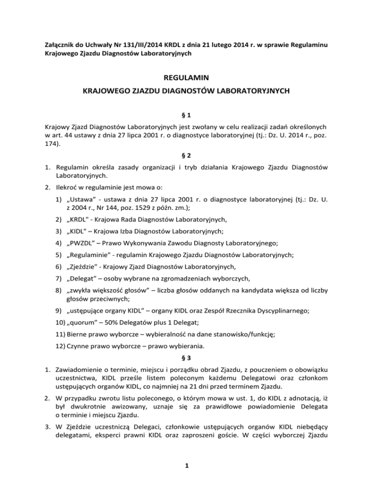 Załącznik do Uchwały Nr 131/III/2014 KRDL z dnia 21 lutego 2014 r. w sprawie Regulaminu Krajowego Zjazdu Diagnostów Laboratoryjnych REGULAMIN KRAJOWEGO ZJAZDU DIAGNOSTÓW LABORATORYJNYCH §1 Krajowy Zjazd Diagnostów Laboratoryjnych jest zwołany w celu realizacji zadań określonych w art. 44 ustawy z dnia 27 lipca 2001 r. o diagnostyce laboratoryjnej (tj.: Dz. U. 2014 r., poz. 174). §2 1. Regulamin określa zasady organizacji i tryb działania Krajowego Zjazdu Diagnostów Laboratoryjnych. 2. Ilekroć w regulaminie jest mowa o: 1) „Ustawa” - ustawa z dnia 27 lipca 2001 r. o diagnostyce laboratoryjnej (tj.: Dz. U. z 2004 r., Nr 144, poz. 1529 z późn. zm.); 2) „KRDL" - Krajowa Rada Diagnostów Laboratoryjnych, 3) „KIDL" – Krajowa Izba Diagnostów Laboratoryjnych; 4) „PWZDL” – Prawo Wykonywania Zawodu Diagnosty Laboratoryjnego; 5) „Regulaminie" - regulamin Krajowego Zjazdu Diagnostów Laboratoryjnych; 6) „Zjeździe" - Krajowy Zjazd Diagnostów Laboratoryjnych, 7) „Delegat” – osoby wybrane na zgromadzeniach wyborczych, 8) „zwykła większość głosów” – liczba głosów oddanych na kandydata większa od liczby głosów przeciwnych; 9) „ustępujące organy KIDL” – organy KIDL oraz Zespół Rzecznika Dyscyplinarnego; 10) „quorum” – 50% Delegatów plus 1 Delegat; 11) Bierne prawo wyborcze – wybieralność na dane stanowisko/funkcję; 12) Czynne prawo wyborcze – prawo wybierania. §3 1. Zawiadomienie o terminie, miejscu i porządku obrad Zjazdu, z pouczeniem o obowiązku uczestnictwa, KIDL prześle listem poleconym każdemu Delegatowi oraz członkom ustępujących organów KIDL, co najmniej na 21 dni przed terminem Zjazdu. 2. W przypadku zwrotu listu poleconego, o którym mowa w ust. 1, do KIDL z adnotacją, iż był dwukrotnie awizowany, uznaje się za prawidłowe powiadomienie Delegata o terminie i miejscu Zjazdu. 3. W Zjeździe uczestniczą Delegaci, członkowie ustępujących organów KIDL niebędący delegatami, eksperci prawni KIDL oraz zaproszeni goście. W części wyborczej Zjazdu 1 uczestniczą Delegaci oraz mogą być obecni eksperci prawni KIDL i obsługa techniczna Zjazdu. §4 1. Delegat, po okazaniu dokumentu ze zdjęciem stwierdzającego tożsamość i złożeniu podpisu na liście obecności pierwszego dnia Zjazdu, otrzymuje mandat upoważniający do udziału w Zjeździe, poprzez podniesienie którego oddaje głos w głosowaniu jawnym. 2. Delegata obowiązuje obecność i czynny udział w Zjeździe. 3. Delegaci potwierdzają swoją obecność na Zjeździe podpisami na listach obecności każdego dnia przed rozpoczęciem obrad. 4. Za nieusprawiedliwioną nieobecność lub nieuzasadnione wcześniejsze opuszczenie obrad, Delegat może zostać obciążony częścią kosztów Zjazdu związanych z zapewnieniem uczestnictwa Delegata w obradach Zjazdu. Przedmiotową decyzję podejmie nowo powołana KRDL. §5 1. Zjazd jest władny do podejmowania uchwał i dokonania wyboru organów KIDL przy obecności co najmniej połowy liczby Delegatów. 2. W przypadku braku quorum ponowny termin Zjazdu ustala KRDL, przy czym termin nie może przypaść później niż 2 miesiące i nie wcześniej niż 3 tygodnie po pierwszym terminie Zjazdu. §6 Prezes KRDL otwiera Zjazd i prowadzi obrady do czasu wyboru Przewodniczącego Zjazdu. §7 1. Delegatom, z zastrzeżeniem ust. 2, przysługuje czynne i bierne prawo wyborcze. 2. Delegatom, którzy weszli w skład Komisji Skrutacyjnej nie przysługuje na Zjeździe bierne prawo wyborcze do organów KIDL. 3. Członkom ustępujących organów KIDL nie będącymi delegatami nie przysługuje na Zjeździe czynne i bierne prawo wyborcze. §8 1. Z obrad Zjazdu sporządza się protokół. 2. Przebieg obrad może podlegać rejestracji dźwiękowej i/lub wizualnej. 3. W głosowaniach jawnych i tajnych dopuszcza się zastosowanie techniki elektronicznej. 4. Zjazd przyjmuje porządek obrad. 6. Porządek obrad Zjazdu obejmuje w szczególności: 1) otwarcie Zjazdu i wystąpienie Prezesa KRDL oraz zaproszonych gości; 2) wybór osób uprawnionych do liczenia głosów oddanych w głosowaniu jawnym na Przewodniczącego Zjazdu; 3) wybór Przewodniczącego Zjazdu; 2 4) wybór zastępców Przewodniczącego Zjazdu i Sekretarzy Zjazdu stanowiących wraz z Przewodniczącym Prezydium Zjazdu; 5) wybór komisji mandatowej; 6) wybór komisji skrutacyjnej; 7) wybór komisji wyborczej; 8) wybór komisji wniosków i uchwał 9) sprawozdanie przewodniczącego komisji mandatowej; 10) przyjęcie porządku obrad; 11) wybór komisji zjazdowych; 12) przedstawienie sprawozdań ustępujących organów KIDL; 13) uchwalenie absolutorium ustępującym organom KIDL; 14) wybory nowych organów KIDL; 15) rozpatrzenie wniosków; 16) podjęcie uchwał; 17) sprawozdanie komisji uchwał i wniosków; 18) zamknięcie Zjazdu. §9 1. Delegaci mają prawo do składania wyłącznie na piśmie wniosków o charakterze merytorycznym. 2. Za wnioski w sprawach formalnych uważa się wnioski dotyczące: a) odroczenie obrad na czas nie dłuższy niż 24 godziny; b) zamknięcie posiedzenia; c) uchwalenie tajności posiedzenia; d) zamknięcie listy mówców; e) głosowania bez dyskusji; f) zamknięcia dyskusji; g) odesłania do komisji celem rozpatrzenia i opracowania; h) zmiana kolejności porządku obrad; i) głosowania imiennego; j) o przeprowadzenie głosowania; k) sprawdzenia quorum; l) reasumpcji głosowania, zgłoszonego przez co najmniej 30 Delegatów; m) uchwalenia tajności głosowania; n) zamknięcia listy kandydatów. 3 3. Zjazd rozstrzyga o wniosku formalnym po wysłuchaniu wnioskodawcy i/lub jednego głosu przeciwnego. 4. Przewodniczący Zjazdu zarządza głosowanie jawne wniosków formalnych zgodnie z kolejnością ich zgłaszania. § 10 1. Po zamknięciu dyskusji nad projektem uchwał, lub innymi wnioskami i propozycjami zgłoszonymi w toku obrad, Przewodniczący Zjazdu oznajmia, że Zjazd przystępuje do głosowania. Od tej chwili można zabierać głos 