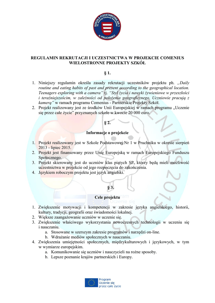 REGULAMIN REKRUTACJI I UCZESTNICTWA W PROJEKCIE COMENIUS WIELOSTRONNE PROJEKTY SZKÓŁ § 1. 1. Niniejszy regulamin określa zasady rekrutacji uczestników projektu ph. „Daily routine and eating habits of past and present according to the geographical location. Teenagers exploring with a camera” tj. “Styl życia i nawyki żywieniowe w przeszłości i teraźniejszościm, w zależności od położenia geograficznego. Uczniowie pracują z kamerą” w ramach programu Comenius - Partnerskie Projekty Szkół. 2. Projekt realizowany jest ze środków Unii Europejskiej w ramach programu „Uczenie się przez całe życie” przyznanych szkole w kwocie 20 000 euro. § 2. Informacje o projekcie 1. Projekt realizowany jest w Szkole Podstawowej Nr 1 w Pruchniku w okresie sierpień 2013 - lipiec 2015. 2. Projekt jest finansowany przez Unię Europejską w ramach Europejskiego Funduszu Społecznego. 3. Projekt skierowany jest do uczniów klas piątych SP, którzy będą mieli możliwość uczestnictwa w projekcie od jego rozpoczęcia do zakończenia. 4. Językiem roboczym projektu jest język angielski. § 3. Cele projektu 1. Zwiększenie motywacji i kompetencji w zakresie języka angielskiego, historii, kultury, tradycji, geografii oraz świadomości lokalnej. 2. Większe zaangażowanie uczniów w uczenie się. 3. Zwiększenie właściwego wykorzystania nowoczesnych technologii w uczeniu się i nauczaniu. a. Stosowane w szerszym zakresie programów i narzędzi on-line. b. Wdrażanie mediów społecznych w nauczaniu. 4. Zwiększenia umiejętności społecznych, międzykulturowych i językowych, w tym w wymiarze europejskim. a. Komunikowanie się uczniów i nauczycieli na rożne sposoby. b. Lepsze poznanie krajów partnerskich i Europy. § 4. Działania projektowe 1. Opracowanie produktów końcowych projektu i zaprezentowanie ich społeczności lokalnej (uczniowie nieuczestniczący w projekcie, nauczyciele i pracownicy szkoły, rodzice, lokalne władze, partnerzy zagraniczni itp.). 2. Spotkania młodzieży ze szkół partnerskich (wymiana doświadczeń, integracja kulturowa, doskonalenie znajomości języka angielskiego). § 5. Zasady rekrutacji uczestników projektu 1. Rekrutacja do wyjazdu do: Frankfurtu nad Menem, grudzień 2013 r. Stambułu, kwiecień 2014 r. Aten, kwiecień 2015 r. 2. W skład Zespołu Rekrutacyjnego nauczyciele uczestniczący w Kole Comeniusa. 3. Uczestnikiem projektu może być osoba, która: z własnej inicjatywy wyraża chęć uczestnictwa w projekcie, jest uczniem SP Nr 1 w Pruchniku, bierze czynny udział w Kole Comeniusa, posiada dobrą znajomość języka angielskiego, wyrazi gotowość do przyjęcia gości – uczestników projektu z innych szkół, posiada niezbędne dokumenty umożliwiające wyjazd za granicę. 4. Proces rekrutacji obejmuje: wyrażenie chęci wyjazdu, akceptację kandydatury przez zespół nauczycieli, podpisanie zgody przez rodziców ucznia, przedstawienie niezbędnych dokumentów, podpisanie kontraktu. 5. Uczeń ubiegający się o udział w projekcie Comenius w wyznaczonym terminie powinien złożyć w sekretariacie szkoły następujące dokumenty: zgodę rodziców, ksero dokumentów. 6. Proces rekrutacji zostanie zakończony stworzeniem listy głównych i rezerwowych uczestników oraz poinformowaniem uczniów zakwalifikowanych do projektu. 7. Wolne miejsca zajmie kolejna osoba z listy rezerwowej, w przypadku gdy uczeń zrezygnuje z udziału w projekcie/zostanie skreślony z listy Uczestników. 8. Każdy uczeń może wziąć udział w kilku rodzajach zajęć objętych Projektem. § 6. Prawa i obowiązki uczestnika Projektu 1. Każdy Uczestnik ma prawo do: nieodpłatnego udziału w zajęciach na które się zakwalifikował, zgłaszania uwag i oceny zajęć, w których uczestniczy, otrzymania materiałów promocyjnych, otrzymania pomocy dydaktycznych do zajęć, nieodpłatnego przekazania materiałów dydaktycznych do biblioteki szkolnej po zakończeniu projektu. 2. Uczestnik zobowiązuje się do: uczestnictwa w zajęciach, na które się zakwalifikował, w przypadku przekroczenia limitu 20% nieobecności koordynator zastrzega sobie prawo skreślenia ucznia z grona uczestników projektu, wypełniania w trakcie zajęć testów sprawdzających, ankiet ewaluacyjnych, ankiet poziomu zadowolenia, do wyrażenia zgody na gromadzenie, przetwarzanie i przekazywanie danych osobowych na potrzeby realizacji projektu, nie sprzedawania materiałów dydaktycznych otrzymanych podczas udziału w projekcie. § 7. Ogólne postanowienia 1. Uczniowie kwaterowani są w host family, czyli u rodzin uczniów szkoły partnerskiej, która zgodziła się gościć naszych uczniów lub w hostelach, jeśli gospodarz nie jest w stanie zorganizować innego noclegu. Rodzina goszcząca zapewnia wyżywienie, nocleg itp. 2. Koszty podróży do kraju goszczącego i z powrotem, ubezpieczenie na czas pobytu uczniów oraz wycieczki objęte programem pobytu w kraju goszczącym finansowane są z funduszy projektowych. Wszelkie inne koszty np. kieszonkowe uczeń ponosi we własnym zakresie. 3. Właściwe przygotowanie się do wyjazdu dotyczy każdego ucznia biorącego w nim udział; wiąże się to z kwestią zgromadzenia kompletu dokumentów, odpowiedniego ubioru, obuwia, itp. 4. Uczestnicy wyjazdu są zobowiązani do bezwzględnego przestrzegania poleceń koordynatora projektu, opiekunów oraz rodziny goszczącej (host family). 5. Każdy uczestnik podlega bezwzględnie następującym zakazom: a. Zakaz samodzielnego oddalania się od grupy. b. Zakaz spożywania napojów alkoholowych i substancji psychoaktywnych w jakiejkolwiek postaci. c. Zakaz palenia papierosów. 6. Uczestnicy wyjazdów są zobowiązani do przestrzegania ciszy nocnej obowiązującej w miejscu, które jest przeznaczone na nocleg. 7. Uczestnicy wyjazdu dostosowują się do ustalonego programu i rozkładu czasowego dnia. 8. Uczestnicy wyjazdu przestrzegają przepisów BHP przeciwpożarowych i kodeksu ruchu drogowego, itp. 