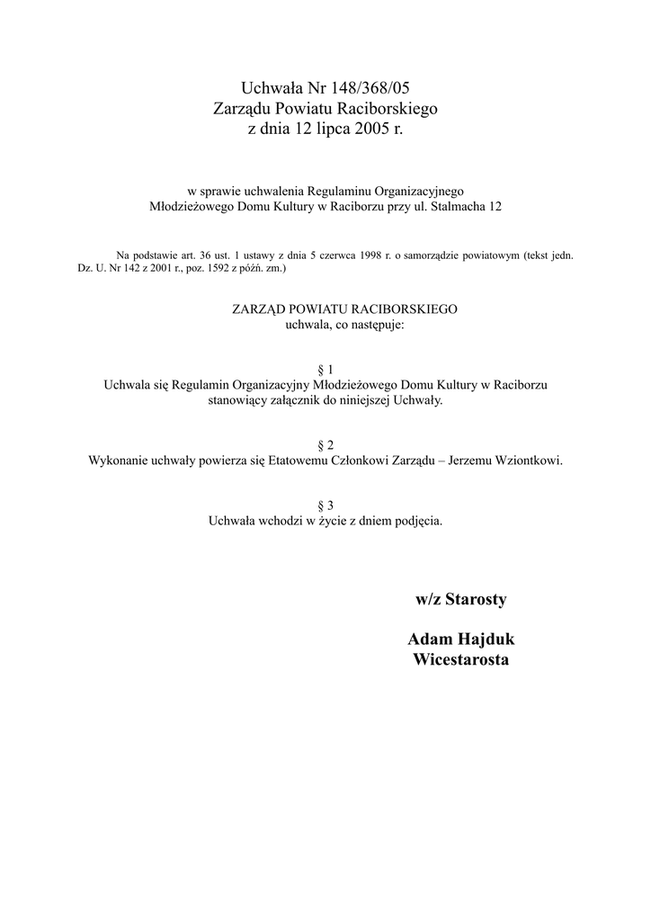 Uchwała Nr 148/368/05 Zarządu Powiatu Raciborskiego z dnia 12 lipca 2005 r. w sprawie uchwalenia Regulaminu Organizacyjnego Młodzieżowego Domu Kultury w Raciborzu przy ul. Stalmacha 12 Na podstawie art. 36 ust. 1 ustawy z dnia 5 czerwca 1998 r. o samorządzie powiatowym (tekst jedn. Dz. U. Nr 142 z 2001 r., poz. 1592 z późń. zm.) ZARZĄD POWIATU RACIBORSKIEGO uchwala, co następuje: §1 Uchwala się Regulamin Organizacyjny Młodzieżowego Domu Kultury w Raciborzu stanowiący załącznik do niniejszej Uchwały. §2 Wykonanie uchwały powierza się Etatowemu Członkowi Zarządu – Jerzemu Wziontkowi. §3 Uchwała wchodzi w życie z dniem podjęcia. w/z Starosty Adam Hajduk Wicestarosta Uzasadnienie: Posiadanie regulaminu organizacyjnego przez jednostki organizacyjne powiatu a takimi są szkoły i placówki dla których organem prowadzącym jest powiat raciborski wynika z treści art. 36 ust. 1 Ustawy z dnia 5 czerwca 1998 r. o samorządzie powiatowym. Przepis ten stanowi, iż organizację i zasady funkcjonowania jednostek organizacyjnych powiatu określają regulaminy organizacyjne uchwalone przez zarząd powiatu. Kierownik Referatu Edukacji, Kultury i Sportu Wicestarosta Józef Czekajło Adam Hajduk Załącznik do Uchwały Nr 148/368/05 Zarządu Powiatu Raciborskiego z dnia 12 lipca 2005 r. REGULAMIN ORGANIZACYJNY MŁODZIEŻOWEGO DOMU KULTURY W RACIBORZU Rozdział I Po s t a n o w i e n i a o g ó l n e §1 Regulamin organizacyjny określa organizację i zasady funkcjonowania Młodzieżowego Domu Kultury w Raciborzu. §2 Młodzieżowy Dom Kultury w Raciborzu działa na podstawie: 1) Rozporządzenia Ministra Edukacji Narodowej i Sportu z dnia 7 marca 2005 r. w sprawie rodzajów i szczegółowych zasad działania placówek publicznych, warunków pobytu dzieci i młodzieży w tych placówkach oraz wysokości i zasad odpłatności wnoszonej przez rodziców za pobyt ich dzieci w tych placówkach ( na podstawie Art. 71 ust.1 pkt.1 Ustawy o systemie oświaty z dnia 7 września 1991 r. ( Dz.U. z 2004 r. Nr 256, poz. 2572, Nr 273, poz. 2703 i Nr 2781 oraz z 2005 r. Nr 17, poz.141 ), 2) Rozporządzenia Ministra Edukacji Narodowej i Sportu w sprawie ramowych statutów placówek publicznych z dnia 7 marca 2005 r. ( na podstawie Art. 60 ust.2 ustawy z dnia 7 września 1991 r. o systemie oświaty ( Dz. U. z 2004r. Nr 256, poz. 2572, Nr 273, poz. 2703 i Nr 281, poz.2781 oraz z 2005 r Nr 17, poz. 141 ) 3) Statutu i niniejszego Regulaminu Organizacyjnego. §3 Młodzieżowy Dom Kultury w Raciborzu ma siedzibę w Raciborzu przy ulicy Stalmacha 12. §4 Młodzieżowy Dom Kultury w Raciborzu swoim zasięgiem obszar Rzeczypospolitej Polskiej. §5 Organem prowadzącym dla Młodzieżowego Domu Kultury jest Powiat Raciborski, a organem nadzoru pedagogicznego Śląski Kurator Oświaty. P r z e d m i o t Rozdział II i z a k r e s d z i a ł a n i a §6 1. Placówka realizuje cele i zadania określone w ustawie o systemie oświaty oraz przepisach wydanych w Zarządzeniu Kuratora Oświaty dot. działalności pozaszkolnej. 2. Młodzieżowy Dom Kultury realizuje zajęcia dydaktyczno – wychowawcze umożliwiając rozwijanie zainteresowań i uzdolnień dzieci i młodzieży poprzez: 1) rozwijanie uzdolnień, 2) rozwijanie kulturalnego wypoczynku, rozrywki, wychowania fizycznego, turystyki i krajoznawstwa, 3) inspirowanie i organizowanie międzyszkolnego życia kulturalnego i społecznego, 4) przygotowanie do samodzielności w nauce i w pracy, 5) dbałość o zdrowie psychiczne i fizyczne, 6) wyrobienie właściwego stosunku do pracy i ludzi, 7) organizowanie przeglądów, pokazów, wystaw, rozrywek, zajęć plenerowych, 8) pogłębianie i rozszerzanie wiedzy wykraczającej poza szkolne programy, 9) MDK opracowuje własne programy i plany pracy. 3. Placówka może realizować inne zadania oświatowo – wychowawcze zlecone przez organ prowadzący /wystawy, konkursy, przeglądy/. Rozdział III S t r u k t u r a o r g a n i z a c y j n a i z a s a d y k i e r o w a n i a. Zasady współdziałania, kierowania Statut Młodzieżowego Domu Kultury. 1. 2. 3. 4. 5. 6. 7. §7 i kompetencji pracowników określa §8 Na czele Młodzieżowego Domu Kultury stoi Dyrektor. Dyrektora powołuje i odwołuje Starosta Raciborski Dyrektor zarządza placówką, kieruje jej działalnością i reprezentuje ją zewnątrz. Dyrektor jest uprawniony do dokonywania czynności prawnych w granicach uprawnień udzielonych przez Starostę Raciborskiego. Dyrektor jest zwierzchnikiem służbowym pracowników zatrudnionych w Młodzieżowym Domu Kultury. Do obowiązków Dyrektora należą: 1) sprawowanie opieki nad młodzieżą placówki, odpowiedzialność za dydaktyczny i wychowawczy poziom placówki, 2) realizuje zadania zgodnie z Uchwałami Rady Pedagogicznej oraz organów nadzorujących i prowadzących placówkę, 3) tworzy warunki do rozwoju samorządnej i samodzielnej pracy wychowanków, 4) zapewnia, w miarę możliwości, odpowiednie warunki organizacyjne do realizacji zadań dydaktycznych i dydaktyczno – wychowawczych, 5) zapewnia pomoc nauczycielom w realizacji ich zadań i doskonalenia, 6) sprawuje nadzór i organizuje pracę kół zainteresowań placówki, 7) organizuje i kontroluje całokształt pracy placówki, 8) zabezpiecza właściwe warunki nauki i pracy. Do obowiązków Głównego księgowego należy: 1) przestrzeganie przepisów prawa pracy, obowiązującego Regulaminu Pracy, 2) organizuje pracę komórki finansowo- księgowej, 3) 4) 5) 6) 7) opracowuje analizy i plany finansowe placówki, organizuje i kontroluje pracę finansowo – księgową placówki, rozlicza i kontroluje wydatki placówki, przestrzega dyscyplinę finansową placówki, ewidencjonuje i kontroluje majątek placówki, organizuje naliczanie, wypłacanie i kontrolę płac. 8. Do zakresu zadań i kompetencji Sekretarza należy: 1) przestrzeganie przepisów prawa pracy, obowiązującego Regulaminu Pracy 2) organizuje pracę sekretariatu Młodzieżowego Domu Kultur