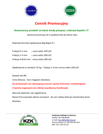 Cennik Promocyjny Nowoczesny produkt na bazie kredy piszącej z własnej kopalni !!! Jesienna promocja od 1 października do końca roku Wapniak Kornicki opakowania Big-Bag 0,5 t Frakcja 0-1 mm – cena netto 240 zł/t Frakcja 1-4 mm – cena netto 300 zł/t Frakcja 4-8/10 mm –cena netto 300 zł/t Opakowania w workach 25 kg – frakcja 1-4 mm cenna netto 330 zł/t Stawka Vat 8% Cena dotyczy : loco magazyn dostawcy Do powyższych cen obowiązują znaczne upusty ilościowe i marketingowe ( kwestia negocjacji oraz dalszej współpracy handlowej) Warunki płatności :do uzgodnienia Nasza firma posiada własny transport , do cen należy doliczyć ewentualny koszt dostawy. Kredowe Zakłady w Kornicy tel/fax: 83 358 88 88 e-mail: [email protected] Kornica Nowa 12, 08-205 Kornica NIP: 537-130-23-18