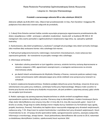 Rada Rodziców Poznańskiej Ogólnokształcącej Szkoły Muzycznej I stopnia im. Henryka Wieniawskiego Protokół z czerwcowego zebrania RR w roku szkolnym 2014/15 Zebranie odbyło się 8.06.2015 roku. Obecni byli przedstawiciele 11 klas, Pani Dyrektor i księgowa RR, podpisana lista obecności stanowi załącznik do protokołu. 1. Z okazji Dnia Dziecka zamiast lodów została wysunięta propozycja organizowania przedstawienia dla dzieci, (współpraca z UAM - animacje z udziałem studentów) - kwota dof. w budżecie RR 350 zł. W następnym roku warto pomyśleć o ogólnoszkolnym świętowaniu tego dnia, np. specjalny spektakl teatralny. 2. Dyskutowano, aby dzień projektowy („naukowy”) zastąpił od przyszłego roku dzień Jarmarku Solnego. Jako możliwe daty wskazano koniec roku szkolnego lub marzec. 3. Padł pomysł połączenia koncertu rodzinnego z koncertem charytatywnym, może wówczas bez zapraszania gwiazdy - do rozważenia na początku nowego roku szkolnego. 4. Informacje od Dyrekcji: kalendarz szkolny powstanie w tym tygodniu czerwca, ostatnie terminy zostaną dopracowane w sierpniu związane z OKE, egzaminami zewnętrznymi, a następnie zamieszczone na stronie internetowej szkoły. po dwóch latach wnioskowania do Wydziału Oświaty o finanse, nareszcie podczas wakacji mają zostać zamontowane siatki zabezpieczające przy oknie stołówki oraz poręcze przy ścianach na schodach. 5. System zwiększenia bezpieczeństwa. Działania podjęte dotychczas przez Dyrekcję: otwarcie drzwi przy sekretariacie oraz patio przy stołówce, zamknięta furtka przy Hejmowskiego. Miejsca mało szczelne to brama przy bursie oraz brama przy budynku muzycznym, ale jest problem z poprawą sytuacji, gdyż szkoła nie zarządza tymi bramami. 6. Rodzic zajmujący się sprawą poprawy bezpieczeństwa w szkole omówił szczegółowo etapy wprowadzenia systemu identyfikacji uczniów. Pierwszy etap to identyfikator z kodem kreskowym (karta chip), kolor identyfikatora oraz smyczy inny dla 1-3 inny dla 4-6, inny dla nauczycieli, gości - koszt 6 zł brutto za sztukę. Drugi etap to siatka dzieląca teren między bursą i boiskiem (tu formalności typu zgody, projekt, kosztorys, finanse). Potrzebny też będzie dyżur nauczyciela stojącego przy drzwiach wejściowych, zwłaszcza od g. 7.25. Etap trzeci to system kontrolerów i czytników kart przy drzwiach wejściowych. Koszt 4 kontrolerów to ok. 14 tysięcy brutto (potrzebne kable, oprogramowanie systemu, awaryjny wyłącznik). Informacja o monitoringu, atrapy kamer . Koszt jednostkowy identyfikatora dla ucznia to 20 zł, natomiast za dodatkowy identyfikator (rodzice, opiekunowie) koszt wyniesie 10zł. Rada Rodziców Poznańskiej Ogólnokształcącej Szkoły Muzycznej I stopnia im. Henryka Wieniawskiego 7. Zgłoszono do dyrekcji pomysł otwarcia ubikacji dla dzieci świetlicowych na parterze (w miejsce jednej nauczycielskiej). 8. Rada Rodziców ponowiła wniosek do Grona pedagogicznego o REGULARNE wpisywanie ocen do dzienniczków. 9. Stołówka w nowym roku szkolnym: wspólnie z Dyrekcją ustalono, że stołówka będzie prowadzona przez tę sama firmę jeszcze przez rok - do czerwca 2016 - pod warunkiem zaakceptowania warunków przedstawionych przez RR, m.in. rozdzielenie abonamentu na pierwsze i drugie danie, maks. koszt obiadu 8 zł. 10. Dokonano wstępnego podsumowania działalności oraz wykorzystania funduszu RR. Budżet RR realizowany jest zgodnie z preliminarzem. Na dzień 31.05.2015 wpłata składki na poziomie 85%. Nie stwierdzono zagrożenia budżetowego. Kwota zebrana z darowizn (koncert charytatywny) przeznaczona na poprawę bezpieczeństwa w szkole, wykorzystana będzie wykorzystana w miarę realizacji prac. 11. Nie podjęto decyzji w sprawie likwidacji funduszu klasowego odpisu ze składek na RR, pomimo burzliwej dyskusji. Na 10 osób 5 głosowało przeciw likwidacji, 3 za, 2 wstrzymały się od głosu. Sprawa do przegłosowania przez nową RR. 12. Ustalono, że składka na fundusz RR w nowym roku szkolnym pozostaje w niezmienionej kwocie 20 zł za miesiąc (10 zł/rodzeństwo). 13. Postanowiono, że przedłużające się zaległości w płatnościach za basen, a zwłaszcza nieuregulowane na koniec czerwca br., będą powodem braku zgody RR na uczęszczanie tych uczniów na basen w nowym roku szkolnym, ew. jeśli do zebrania wrześniowego zostanie dokonana wplata za całe półrocze. 14. Ustalono, że tradycyjnie RR ufunduje ciasto dla Nauczycieli na koniec roku szkolnego - przyznana kwota - 250 zł. 15. Rekomendacje dla nowej RR po zakończeniu prac nad bezpieczeństwem ponowne przyjrzenie się kwestii dziennika elektronicznego analiza potrzeby dot. kołek zainteresowań, zakup gier do świetlicy dla 4-6 (dokonano częściowej analizy zebranych ankiet, bo nie wszystkie dotarły przed zebraniem: 26 osób wypowiedziało się w sprawie kółek: ok. 10 procent na kółko taneczne, sportowe oraz przygotowanie do sprawdzianu, kółko matematyczne dla klas 1-3, pozostawienie formacji zuchów. Ostateczne wyniki będą znane po przeanalizowaniu dalszej części ankiet dostarczonych do RR podczas zebrania) 16. Termin podsumowującego zebrania RR połączonego z udzieleniem absolutorium ustępującej RR zostanie podany na początku września 2015. protokołowała Wanda Jędrzejczak