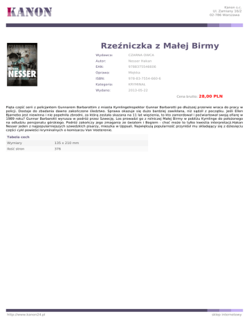 Kanon s.c. Ul. Zamiany 16/2 02-786 Warszawa Rzeźniczka z Małej Birmy Wydawca: CZARNA OWCA Autor: Nesser Hakan EAN: 9788375546606 Oprawa: Miękka ISBN: 978-83-7554-660-6 Kategoria: KRYMINAŁ Wydano: 2013-05-22 Cena brutto: 28,00 PLN Piąta część serii z policjantem Gunnarem Barbarottim z miasta KymlingeInspektor Gunnar Barbarotti po dłuższej przerwie wraca do pracy w policji. Dostaje do zbadania dawno zakończone śledztwo. Sprawa okazuje się dużo bardziej zawikłana, niż sądził z początku. Jeśli Ellen Bjarnebo jest niewinna i nie popełniła zbrodni, za którą została skazana na 11 lat więzienia, to kto zamordował i poćwiartował swoją ofiarę w 1989 roku? Gunnar Barbarotti wyrusza w podróż przez Szwecję. Los prowadzi go z rolniczej Małej Birmy w pobliżu Kymlinge do położonego na odludziu pensjonatu górskiego. Podróż zakończy jego zmagania ze światem i Bogiem - choć może to tylko kwestia interpretacji.Hakan Nesser jeden z najpopularniejszych szwedzkich pisarzy, mieszka w Uppsali. Największą popularność przyniósł mu składający się z dziesięciu części cykl powieści kryminalnych o komisarzu Van Veeterenie. Tabela cech Wymiary 135 x 210 mm Ilość stron 376 http://www.kanon24.pl sklep internetowy