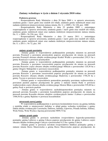 Zmiany wchodzące w życie z dniem 1 stycznia 2010 roku: Podstawa prawna: – Rozporządzenie Rady Ministrów z dnia 28 lipca 2009 r. w sprawie utworzenia, ustalenia granic i nazw gmin oraz siedzib ich władz, ustalenia granic niektórych miast oraz nadania niektórym miejscowościom statusu miasta, Dz. U. z 2009 r. Nr 120, poz. 1000 – Rozporządzenie Rady Ministrów z dnia 22 grudnia 2009 r. zmieniające rozporządzenie w sprawie utworzenia, ustalenia granic i nazw gmin oraz siedzib ich władz, ustalenia granic niektórych miast oraz nadania niektórym miejscowościom statusu miasta, Dz. U. z 2009 r. Nr 226, poz. 1814 – Rozporządzenie Rady Ministrów z dnia 23 marca 2011 r. zmieniające rozporządzenie w sprawie utworzenia, ustalenia granic i nazw gmin oraz siedzib ich władz, ustalenia granic niektórych miast oraz nadania niektórym miejscowościom statusu miasta, Dz. U. z 2011 r. Nr 72, poz. 385 zmiany granic powiatów – Zmiana granic w województwie podkarpackim pomiędzy miastem na prawach powiatu Przemyśl a powiatem przemyskim poprzez przyłączenie do miasta na prawach powiatu Przemyśl obszaru obrębu ewidencyjnego Kruhel Wielki o powierzchni 239,31 ha z gminy Krasiczyn w powiecie przemyskim – Zmiana granic w województwie podkarpackim pomiędzy miastem na prawach powiatu Rzeszów a powiatem rzeszowskim poprzez przyłączenie do miasta na prawach powiatu Rzeszów części obszaru obrębu ewidencyjnego Miłocin o powierzchni 124,30 ha z gminy Głogów Małopolski w powiecie rzeszowskim – Zmiana granic w województwie podkarpackim pomiędzy miastem na prawach powiatu Rzeszów a powiatem rzeszowskim poprzez przyłączenie do miasta na prawach powiatu Rzeszów obszaru obrębu ewidencyjnego Budziwój o powierzchni 1750,34 ha z gminy Tyczyn w powiecie rzeszowskim – Zmiana granic w województwie pomorskim pomiędzy powiatem wejherowskim a powiatem puckim poprzez przyłączenie do gminy o statusie miasta Reda w powiecie wejherowskim części obszaru obrębu ewidencyjnego Moście Błota o powierzchni 539,48 ha z gminy Puck w powiecie puckim – Zmiana granic w województwie zachodniopomorskim pomiędzy miastem na prawach powiatu Koszalin a powiatem koszalińskim poprzez przyłączenie do miasta na prawach powiatu Koszalin obszaru obrębów ewidencyjnych Jamno i Łabusz o powierzchni 1500,56 ha z gminy Będzino w powiecie koszalińskim utworzenie nowej gminy – W województwie podkarpackim w powiecie krośnieńskim tworzy się gminę Jaśliska z siedzibą władz w miejscowości Jaśliska; w skład gminy wchodzą wydzielone z gminy Dukla obręby ewidencyjne Czeremcha, Daliowa, Jaśliska, Lipowiec, Posada Jaśliska, Szklary, Wola Niżna, Wola Wyżna o łącznej powierzchni 9899,73 ha zmiany granic gmin – Zmiana granic w powiecie tucholskim (województwo kujawsko-pomorskie) pomiędzy gminą Lubiewo a gminą Cekcyn poprzez przyłączenie do gminy Lubiewo części obszaru obrębu ewidencyjnego Cekcyn o powierzchni 8,13 ha z gminy Cekcyn – Zmiana granic w powiecie rawskim (województwo łódzkie) pomiędzy gminą o statusie miasta Rawa Mazowiecka a gminą Rawa Mazowiecka poprzez przyłączenie do gminy o statusie miasta Rawa Mazowiecka części obszaru obrębu ewidencyjnego Boguszyce o powierzchni 41,57 ha z gminy Rawa Mazowiecka – Zmiana granic w powiecie nowotarskim (województwo małopolskie) pomiędzy gminą Spytkowice a gminą Raba Wyżna poprzez przyłączenie do gminy Spytkowice części obszaru obrębu ewidencyjnego Raba Wyżna o powierzchni 0,29 ha z gminy Raba Wyżna – Zmiana granic w powiecie pułtuskim (województwo mazowieckie) pomiędzy gminą Pułtusk a gminą Zatory poprzez przyłączenie do gminy Pułtusk części obszaru obrębu ewidencyjnego Nowe Borsuki o powierzchni 32,99 ha z gminy Zatory – Zmiana granic w powiecie suwalskim (województwo podlaskie) pomiędzy gminą Rutka-Tartak a gminą Wiżajny poprzez przyłączenie do gminy Rutka-Tartak obszarów obrębów ewidencyjnych Jodoziory, Kleszczówek, Polimonie i Smolniki o powierzchni 1105,4 ha z gminy Wiżajny – Zmiana granic w powiecie bytowskim (województwo pomorskie) pomiędzy gminą Tuchomie a gminą Kołczygłowy poprzez przyłączenie do gminy Tuchomie części obszaru obrębu ewidencyjnego Zagony o powierzchni 356,57 ha z gminy Kołczygłowy – Zmiana granic w powiecie chojnickim (województwo pomorskie) pomiędzy gminą Chojnice a gminą Konarzyny poprzez przyłączenie do gminy Chojnice części obszaru obrębu ewidencyjnego Zielona Chocina o powierzchni 26,39 ha z gminy Konarzyny – Zmiana granic w powiecie lublinieckim (województwo śląskie) pomiędzy gminą Koszęcin a gminą o statusie miasta Lubliniec poprzez przyłączenie do gminy Koszęcin części obszarów obrębów ewidencyjnych Kokotek i Lubliniec o powierzchni 48,47 ha z gminy o statusie miasta Lubliniec – Zmiana granic w powiecie szczecineckim (województwo zachodniopomorskie) pomiędzy gminą o statusie miasta Szczecinek a gminą Szczecinek poprzez przyłączenie do gminy o statusie miasta Szczecinek części obszarów obrębów ewidencyjnych Sitno i Trzesieka o powierzchni 1132,94 ha z gminy Szczecinek nadanie statusu miasta – Nadanie statusu miasta miejscowości Łaszczów położonej na obszarze gminy Łaszczów w powiecie tomaszowskim (województwo lubelskie), w skład miasta Łaszczów wchodzą obszar obrębu ewidencyjnego Łaszczów-Osada oraz części obszarów obrębów ewidencyjnych Czerkasy, Domaniż, Łaszczów-Kolonia i Podhajce o łącznej powierzchni 500,88 ha – Nadanie statusu miasta miejscowości Radłów położonej na obszarze gminy Radłów w powiecie tarnowskim (województwo małopolskie), w skład miasta Radłów wchodzi obszar obrębu ewidencyjnego Radłów o powierzchni 1684,43 ha – Nadanie statusu miasta miejscowości Kołaczyce położonej na obszarze gminy Kołaczyce w powiecie jasielskim (województwo podkarpackie), w skład miasta Kołaczyce wchodzi obszar obrębu ewidencyjnego Koła