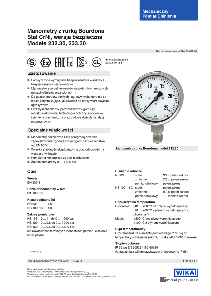 Mechaniczny Pomiar Ciśnienia Manometry z rurką Bourdona Stal CrNi, wersja bezpieczna Modele 232.30, 233.30 Karta katalogowa WIKA PM 02.04 k Inne zatwierdzenia patrz strona 3 Zastosowanie ■■ Podwyższone wymagania bezpieczeństwa w zakresie bezpieczeństwa użytkowników ■■ Manometry z wypełnieniem do wysokich i dynamicznych pulsacji ciśnienia oraz wibracji 1) ■■ Do gazów, mediów ciekłych i agresywnych, które nie są lepkie i krystalizujące, jak również do pracy w środowisku agresywnym ■■ Przemysł chemiczny, petrochemiczny, górniczy, morski, elektrownie, technologia ochrony środowiska, inżynieria mechaniczna oraz budowa dużych instalacji przemysłowych Specjalne właściwości ■■ Manometry bezpieczne z litą przegrodą przednią zaprojektowane zgodnie z wymogami bezpieczeństwa wg EN 837-1 ■■ Wysoka stabilność eksploatacyjna oraz odporność na wstrząsy i wibracje ■■ Kompletna konstrukcja ze stali nierdzewnej ■■ Zakres pomiarowy 0 … 1 600 bar Opis Wersja EN 837-1 Rozmiar nominalny w mm 63, 100, 160 Klasa dokładności NS 63: 1,6 NS 100, 160: 1,0 Zakres pomiarowy NS 63: 0 ... 1 do 0 ... 1 000 bar NS 100: 0 ... 0,6 do 0 ... 1 000 bar NS 160: 0 ... 0,6 do 0 ... 1.600 bar lub równoważność w innych jednostkach pomiaru ciśnienia lub w próżni 1) Model 233.30 Manometr z rurką Bourdona model 232.30 Ciśnienie robocze NS 63: stałe: zmienne: pomiar chwilowy: NS 100, 160: stałe: zmienne: pomiar chwilowy: 3/4 x pełen zakres 2/3 x pełen zakres pełen zakres pełen zakres 0,9 x pełen zakres 1,3 x pełen zakres Dopuszczalna temperatura Otoczenie: -40 … +60 °C bez płynu wypełniającego -20 … +60 °C z płynem wypełniającym gliceryna 1) Medium: +200 °C bez płynu wypełniającego +100 °C z płynem wypełniającym 1) Błąd temperaturowy Gdy temperatura elementu pomiarowego różni się od temperatury odniesienia (+20 °C): maks. ±0,4 %/10 K zakresu Stopień ochrony IP 65 wg EN 60529 / lEC 60529 (Urządzenia z tylnym przyłączem procesowym: IP 55) Karta katalogowa WIKA PM 02.04 ∙ 11/2015 Karty katalogowe podobnych produktów: Wersja ze stali CrNi; model 232.50; patrz karta katalogowa PM 02.02 Wersja na wysokie ciśnienie; model 222.30; patrz karta katalogowa PM 02.09 Do zastosowań ultra czystych, wersja bezpieczna; model 232.35; patrz karta katalogowa PM 02.11 Strona 1 z 4 Inne przyłącza procesowe Manometr z rurką Bourdona Przyłącze procesowe Stal CrNi316L (NS 63: 1.4571), Położenie gwintu: dolne lub tylne ekscentryczne1) NS 63: gwint zew.: G ¼ B, SW 14 NS 100, 160: gwint zew.: G ½ B, SW 22 (NS 160 tylko dolny) ■■ Inne przyłącza procesowe Element pomiarowy Stal CrNi 316L Sprężyna typu C lub heliakalnego ■■ Kołnierz tylny, stal CrNi Mechanizm Stal CrNi Podzielnia Białe aluminium, czarna podzielnia NS 63 z wypustem ograniczającym ■■ Uszczelki (model 910.17, patrz karta katalogowa AC 09.08) ■■ Montaż z separatorem patrz folder separatory ■■ System pomiarowy z monelu® (model 262.30) ■■ Kołnierz przedni,ze stali CrNi lub ze stali CrNi polerowanej ■■ Temperatura otoczenia -40 °C: wypełnienie silikonowe ■■ Stopień ochrony IP 66, IP 67 ■■ Manometr z urządzeniem kontaktowym, patrz model PGS23.1x0, karta katalogowa PV 22.02 lub model 232.30.063, karta katalogowa PV 22.03 ■■ Manometr z sygnałem elektrycznym, model PGT23.1x0, karta katalogowa PV 12.04 Wskazówka Czarne aluminium Obudowa Stal CrNi, z litą przegrodą przednią (Solidfront) i zabezpieczeniem przeciwwybuchowym z tyłu, zakres wskazań ≤ 0 ... 16 bar (przyłącze dolne) z zaworem kompensującym Szyba Szyba wielowarstwowa bezpieczna (NS 63: poliwęglan) Pokrywa Typu Twist, stal CrNi Płyn wypełniający (dla modelu 233.30) Gliceryna 99,7 % (Gliceryna 86,5 % dla zakresów pomiarowych ≤ 0 ... 2,5 bar) 1) Przyłącze tylne tylko przy manometrach bez wypełnienia NS 63 i 100 Strona 2 z 4 Karta katalogowa WIKA PM 02.04 ∙ 11/2015 Zatwierdzenia Logo Opis Deklaracja zgodności WE ■■ Dyrektywa ciśnieniowa 97/23/EG Kraj Wspólnota Europejska PS > 200 bar, Modul A, akcesoria ciśnieniowe ■■ ATEX- zgodnie 94/9/EG (opcjonalnie) Ochrona typu „c“, konstrukcja bezpieczna - - - EAC (opcjonalnie) ■■ Dyrektywa ciśnieniowa ■■ Obszary zagrożone wybuchem Euroazjatycka Wspólnota Gospodarcza GOST Certyfikat metrologii/ techniki pomiaru Rosja KazInMetr Certyfikat metrologii/ techniki pomiaru Kazachstan MTSCHS Pozwolenie na uruchomienie Kazachstan BelGIM Certyfikat metrologii/ techniki pomiaru Białoruś Uzbekistan Certyfikat metrologii/ techniki pomiaru Uzbekistan CPA Certyfikat metrologii/ techniki pomiaru Chiny KOSHA (opcjonalnie) Obszary zagrożone wybuchem Korea Południowa GL (opcjonalnie) statki, budowa statków (np. przemysł morski) Międzynarodowy CRN bezpieczeństwo (np. bezpieczeństwo elektryczne, przeciążenia, ...) Kanada Certyfikaty (opcjonalnie) ■■ 2.2-certyfikat fabryczny wg EN 10204 ■■ 3.1-certyfikat sprawdzenia wg EN 10204 Zatwierdzenia i certyfikaty dostępne są na stronie internetowej Karta katalogowa WIKA PM 02.04 ∙ 11/2015 Strona 3 z 4 Wymiary w mm Inne przyłącza procesowe Przyłącze radialne dolne 1034588.02 ≤ 16 bar z zaworem odpowietrzającym > 16 bar bez zaworu odpowietrzającego 1034596.02 Przyłącze tylne ekscentryczne 1) 1) Przyłącze tylne tylko przy manometrach bez wypełnienia NS 63 i 100 NS Wymiary w mm a b b1 b2 D1 D2 e f G h ±1 SW 63 17,5 42 42 61 63 63 14,5 18,5 G¼B 54 14 100 25 59,5 59,5 93 101 100 17 30 G½B 87 160 27 65 - - 161 159 17,5 - G½B 118 3) 4) Waga w kg Model 232.30 Model 233.30 22 0,65 1,08 22 1,30 2,34 0,20 0,26 Przyłącze procesowe wg EN 837-1 / 7.3 3) Przy zakresie pomiarowym ≥ 100 bar: 41,5 mm 4) Przy zakresie pomiarowym ≥ 100 bar: 79 mm © 2003 WIKA Alexander Wiegand SE & Co. KG, wszelkie prawa zastrzeżone Specyfikacje i wymiary podane w niniejszej karcie przedstawiają stan konstrukcyjny aktualny w momencie wydruku. Istnieje 