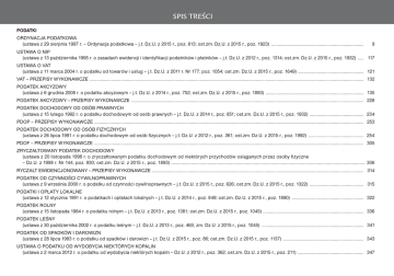 SPIS TREŚCI PODATKI ORDYNACJA PODATKOWA (ustawa z 29 sierpnia 1997 r. – Ordynacja podatkowa – j.t. Dz.U. z 2015 r., poz. 613; ost.zm. Dz.U. z 2015 r., poz. 1923) .............................................................................. 9 USTAWA O NIP (ustawa z 13 października 1995 r. o zasadach ewidencji i identyfikacji podatników i płatników – j.t. Dz.U. z 2012 r., poz. 1314; ost.zm. Dz.U. z 2015 r., poz. 1932) ...... 117 USTAWA O VAT (ustawa z 11 marca 2004 r. o podatku od towarów i usług – j.t. Dz.U. z 2011 r. Nr 177, poz. 1054; ost.zm. Dz.U. z 2015 r., poz. 1649) . ...................................................... 121 VAT – PRZEPISY WYKONAWCZE . .................................................................................................................................................................................................................................... 132 PODATEK AKCYZOWY (ustawa z 6 grudnia 2008 r. o podatku akcyzowym – j.t. Dz.U. z 2014 r., poz. 752; ost.zm. Dz.U. z 2015 r., poz. 1893) ................................................................................... 135 PODATEK AKCYZOWY – PRZEPISY WYKONAWCZE ................................................................................................................................................................................................... 228 PODATEK DOCHODOWY OD OSÓB PRAWNYCH (ustawa z 15 lutego 1992 r. o podatku dochodowym od osób prawnych – j.t. Dz.U. z 2014 r., poz. 851; ost.zm. Dz.U. z 2015 r., poz. 1932) .............................................. 234 PDOP – PRZEPISY WYKONAWCZE . ................................................................................................................................................................................................................................ 253 PODATEK DOCHODOWY OD OSÓB FIZYCZNYCH (ustawa z 26 lipca 1991 r. o podatku dochodowym od osób fizycznych – j.t. Dz.U. z 2012 r., poz. 361; ost.zm. Dz.U. z 2015 r., poz. 1992) ............................................... 254 PDOF – PRZEPISY WYKONAWCZE . ................................................................................................................................................................................................................................ 305 ZRYCZAŁTOWANY PODATEK DOCHODOWY (ustawa z 20 listopada 1998 r. o zryczałtowanym podatku dochodowym od niektórych przychodów osiąganych przez osoby fizyczne – Dz.U. z 1998 r. Nr 144, poz. 930; ost.zm. Dz.U. z 2015 r., poz. 1893) . .......................................................................................................................................................... 306 RYCZAŁT EWIDENCJONOWANY – PRZEPISY WYKONAWCZE ................................................................................................................................................................................. 314 PODATEK OD CZYNNOŚCI CYWILNOPRAWNYCH (ustawa z 9 września 2000 r. o podatku od czynności cywilnoprawnych – j.t. Dz.U. z 2015 r., poz. 626; ost.zm. Dz.U. z 2015 r., poz. 1322) .............................................. 315 PODATKI I OPŁATY LOKALNE (ustawa z 12 stycznia 1991 r. o podatkach i opłatach lokalnych – j.t. Dz.U. z 2014 r., poz. 849; ost.zm. Dz.U. z 2015 r., poz. 1890) ............................................................. 322 PODATEK ROLNY (ustawa z 15 listopada 1984 r. o podatku rolnym – j.t. Dz.U. z 2013 r., poz. 1381; ost.zm. Dz.U. z 2015 r., poz. 1045) . ................................................................................... 336 PODATEK LEŚNY (ustawa z 30 października 2002 r. o podatku leśnym – j.t. Dz.U. z 2013 r., poz. 465; zm. Dz.U. z 2015 r., poz. 1045) ...................................................................................... 341 PODATEK OD SPADKÓW I DAROWIZN (ustawa z 28 lipca 1983 r. o podatku od spadków i darowizn – j.t. Dz.U. z 2015 r., poz. 86; ost.zm. Dz.U. z 2015 r., poz. 1137) .................................................................... 343 USTAWA O PODATKU OD WYDOBYCIA NIEKTÓRYCH KOPALIN (ustawa z 2 marca 2012 r. o podatku od wydobycia niektórych kopalin – Dz.U. z 2012 r., poz. 362; ost.zm. Dz.U. z 2015 r., poz. 211) ........................................................ 347 USTAWA O SPECJALNYM PODATKU WĘGLOWODOROWYM (ustawa z 25 lipca 2014 r. o specjalnym podatku węglowodorowym – Dz.U. z 2014 r., poz. 1215; ost.zm. Dz.U. z 2015 r., poz. 978) ........................................................... 355 USTAWA O ADMINISTRACJI PODATKOWEJ (ustawa z 10 lipca 2015 r. o administracji podatkowej – Dz.U. z 2015 r., poz. 1269; zm. Dz.U. z 2015 r., poz. 1513) ........................................................................................ 356 USTAWA O KONTROLI SKARBOWEJ (ustawa z 28 września 1991 r. o kontroli skarbowej – j.t. Dz.U. z 2015 r., poz. 553; ost.zm. Dz.U. z 2015 r., poz. 1649) .................................................................................. 358 KODEKS KARNY SKARBOWY (ustawa z 10 września 1999 r. – Kodeks karny skarbowy – j.t. Dz.U. z 2013 r., poz. 186; ost.zm. Dz.U. z 2015 r., poz. 1932) ......................................................................... 362 USTAWA O OPŁACIE SKARBOWEJ (ustawa z 16 listopada 2006 r. o opłacie skarbowej – j.t. Dz.U. z 2015 r., poz. 783; ost.zm. Dz.U. z 2015 r., poz. 1893) .................................................................................. 369 USTAWA O DORADZTWIE PODATKOWYM (ustawa z 5 lipca 1996 r. o doradztwie podatkowym – j.t. Dz.U. z 2011 r. Nr 41, poz. 213; ost.zm. Dz.U. z 2015 r., poz. 1224) ....................................................................... 372 RACHUNKOWOŚĆ RACHUNKOWOŚĆ (ustawa z 29 września 1994 r. o rachunkowości – j.t. Dz.U. z 2013 r., poz. 330; ost.zm. Dz.U. z 2015 r., poz. 1893) .............................................