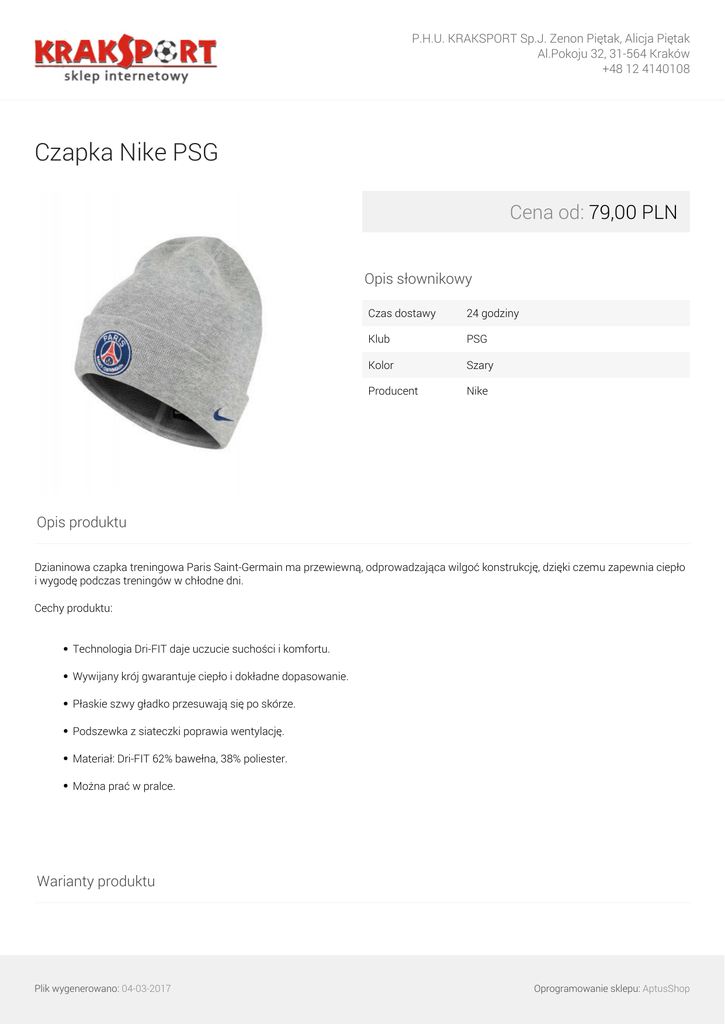 P.H.U. KRAKSPORT Sp.J. Zenon Piętak, Alicja Piętak Al.Pokoju 32, 31-564 Kraków +48 12 4140108 Czapka Nike PSG Cena od: 79,00 PLN Opis słownikowy Czas dostawy 24 godziny Klub PSG Kolor Szary Producent Nike Opis produktu Dzianinowa czapka treningowa Paris Saint-Germain ma przewiewną, odprowadzająca wilgoć konstrukcję, dzięki czemu zapewnia ciepło i wygodę podczas treningów w chłodne dni. Cechy produktu: Technologia Dri-FIT daje uczucie suchości i komfortu. Wywijany krój gwarantuje ciepło i dokładne dopasowanie. Płaskie szwy gładko przesuwają się po skórze. Podszewka z siateczki poprawia wentylację. Materiał: Dri-FIT 62% bawełna, 38% poliester. Można prać w pralce. Warianty produktu Plik wygenerowano: 04-03-2017 Oprogramowanie sklepu: AptusShop P.H.U. KRAKSPORT Sp.J. Zenon Piętak, Alicja Piętak Al.Pokoju 32, 31-564 Kraków +48 12 4140108 męski 79,00 PLN Galeria Plik wygenerowano: 04-03-2017 Powered by TCPDF (www.tcpdf.org) Oprogramowanie sklepu: AptusShop