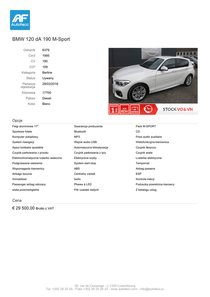BMW 120 dA 190 M-Sport Odnonik 6379 Cm3 1995 CV 190 CO² 109 Kategoria Status Pierwsza rejestracja Berline Uywany 29/03/2016 Kilometra 17700 Paliwo Diesel Kolor Blanc Opcje Felgi aluminiowe 17" Gwarancja producenta Pack M-SPORT Sportowe fotele Bluetooth CD Komputer pokadowy MP3 Prise audio auxiliaire System nawigacji Wejcie audio USB Wielofunkcyjna kierownica Appui lombaire ajustable Automatyczna klimatyzacja Czujnik deszczu Czujnik parkowania z przodu Czujnik parkowania z tylu Czujnik wiata Elektrochromatyczne lusterko wsteczne Elektryczne szyby Lusterka elektryczne Podgrzewane siedzenia System start-stop Tempomat Wspomaganie kierownicy ABS Airbag pasaera Airbags boczna Centralny zamek ESP Immobiliser Isofix Kontrola trakcji Passenger airbag odczany Phares à LED Poduszka powietrzna kierowcy wiata przeciwmgielne Filtr czastek stalych Z katalogu uslug Cena € 29 500,00 Brutto z VAT 56, rue de Cessange - L-1320 Luxembourg Tel. +352 26 25 25 - Faks +352 26 25 26 22 - www.autofecc.com - [email protected]