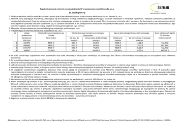 Regulamin promocji „Internet na wakacje (na start)” organizowanej przez Sileman Sp. z o.o. §1. Zasady promocji 1. Niniejszy regulamin określa zasady korzystania z promocyjnych warunków dostępu do Usług Internetu świadczonych przez Sileman Sp z o.o. 2. Abonent, który przystępuje do promocji, zobowiązuje się do korzystania z usługi podstawowej objętej promocją na zasadach określonych w niniejszym regulaminie i złożonym Zamówieniu przez okres 23 miesięcy kalendarzowych, licząc od pierwszego dnia miesiąca następującego po dacie przystąpienia do promocji. Okres ten stanowi minimalny okres wymagany dla skorzystania z warunków promocyjnych. W szczególności podstawę naliczenia udzielonych ulg, na zasadach określonych w § 4.10 Regulaminu świadczenia usług telekomunikacyjnych, może stanowić rozwiązanie Umowy przez Abonenta lub z jego winy lub rezygnacja przez Abonenta z usług objętych promocją przed upływem tego terminu. 3. Abonenta, który przystępuje do promocji obowiązują następujące, preferencyjne ceny: a. Usługi Dostępu do Internetu świadczone przez Sileman Sp. z o.o. Lp. Usługa Opłata okresowa miesięczna wg Opłata okresowa miesięczna promocyjna Ulga w skali jednego Okresu rozliczeniowego Suma udzielonych ulg dla podstawowa Cennika Cena brutto 23 Okresów Dostępu do Cena brutto rozliczeniowych Od lipca do Od września do 23 pełnego Od lipca do Od września do 23 pełnego Internetu sierpnia miesiąca sierpnia miesiąca 1. sileMINI 49,00 zł 0,01 zł 34,00 zł 48,99 zł 15,00 zł 412,98 zł 2. sileMAX 79,00 zł 0,01 zł 54,00 zł 78,99 zł 25,00 zł 682,98 zł 3. sileULTRA 99,00 zł 0,01 zł 74,00 zł 98,99 zł 25,00 zł 722,98 zł 4. silePRO 159,00 zł 0,01 zł 104,00 zł 158,99 zł 55,00 zł 1472,98 zł 4. W braku odmiennego uzgodnienia Stron, promocyjne ceny opłat okresowych miesięcznych obowiązują od pierwszego dnia Okresu rozliczeniowego następującego po przystąpieniu przez Abonenta do promocji. 5. Do promocji przystąpić może Abonent, który spełnia wszystkie wymienione poniżej warunki: a. zamawia w dniu przystąpienia do promocji jedną z usług wymienionych w §1.3, b. upłynął w stosunku do Abonenta minimalny okres niezbędny do skorzystania z dotychczas obowiązujących warunków promocyjnych, w zakresie usług objętych promocją, do której przystępuje Abonent, c. zamawia usługę Dostawcy w Lokalu, w którym w okresie trzech miesięcy poprzedzających przystąpienie do promocji Dostawca nie świadczył żadnych usług. 6. W szczególnie uzasadnionych przypadkach, Dostawca może wyrazić zgodę na przystąpienie do promocji przez Abonenta niespełniającego warunków wymienionych w §1.5. W przypadku zgody na przystąpienie do promocji w związku z niespełnieniem warunku wskazanego w §1.5.b kwota udzielonych ulg wskazana w §1.3 zastępuje kwotę ulg wynikającą z dotychczas obowiązujących Abonenta warunków promocyjnych a Dostawca zrzeka się roszczeń o zapłatę ulg wynikających z dotychczas obowiązujących warunków promocyjnych chyba, że w Porozumieniu w sprawie rozwiązania Umowy lub odstąpieniu od promocji wskazano inaczej. 7. W miesiącach od lipca do sierpnia obowiązywania ulg niniejszej promocji, ulg wynikających z promocji „EKO faktura” nie stosuje się. 8. Kwota udzielonych ulg wskazana w §1.3 jest maksymalną kwotą ulgi, jaką Dostawca udzielić może Abonentowi w ramach niniejszej promocji. Prognozowany sposób rozliczania Abonenta w poszczególnych Okresach rozliczeniowych, a tym samym faktyczną kwotę ulgi udzielonej w ramach niniejszej promocji, Dostawca przedstawia Abonentowi na dokumencie Zamówienia. Łączna wysokość ulg udzielonych w opłatach okresowych miesięcznych w ramach niniejszej promocji obliczona została dla 23 Okresów rozliczeniowych. Kwota roszczeń Dostawcy z tytułu udzielonych ulg w opłatach okresowych nie przekroczy tak ustalonej wartości ulg, również w przypadku uzgodnienia rozpoczęcia świadczenia usług przed pierwszym dniem Okresu rozliczeniowego następującego po przystąpieniu do promocji Po upływie minimalnego okresu niezbędnego do skorzystania z warunków promocyjnych, Abonent będzie zobowiązany do uiszczania opłat zgodnie z Cennikiem obowiązującym w dniu przystąpienia przez Abonenta do promocji. Zmiana Cennika, w trakcie obowiązywania Umowy na warunkach promocyjnych, rodzi skutki wskazane w Umowie. Wiążące Abonenta promocyjne ceny określone zgodnie z niniejszym regulaminem nie ulegają zmianie w trakcie minimalnego okresu do skorzystania z warunków promocyjnych. 9. Regulamin promocji wchodzi w życie dnia 01.07.2016 r. obowiązuje do odwołania. Sileman sp. z o.o. z siedzibą w Rudzie Śląskiej (41-710) przy ul. Dąbrowskiego 35, zarejestrowaną w KRS pod numerem 207875 (Sąd Rejonowy w Gliwicach, X Wydział Gospodarczy KRS), NIP 6412315845, kapitał zakładowy 190000 zł.