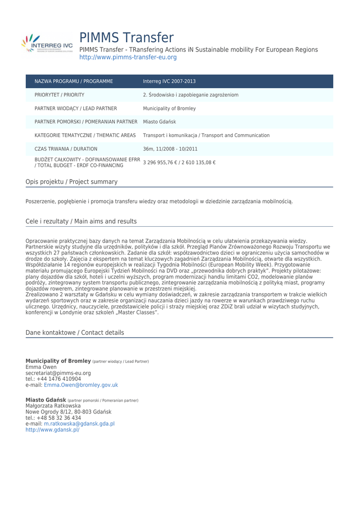 PIMMS Transfer PIMMS Transfer - TRansfering Actions iN Sustainable mobility For European Regions http://www.pimms-transfer-eu.org NAZWA PROGRAMU / PROGRAMME Interreg IVC 2007-2013 PRIORYTET / PRIORITY 2. Środowisko i zapobieganie zagrożeniom PARTNER WIODĄCY / LEAD PARTNER Municipality of Bromley PARTNER POMORSKI / POMERANIAN PARTNER Miasto Gdańsk KATEGORIE TEMATYCZNE / THEMATIC AREAS Transport i komunikacja / Transport and Communication CZAS TRWANIA / DURATION 36m, 11/2008 - 10/2011 BUDŻET CAŁKOWITY - DOFINANSOWANIE EFRR 3 296 955,76 € / 2 610 135,08 € / TOTAL BUDGET - ERDF CO-FINANCING Opis projektu / Project summary Poszerzenie, pogłębienie i promocja transferu wiedzy oraz metodologii w dziedzinie zarządzania mobilnością. Cele i rezultaty / Main aims and results Opracowanie praktycznej bazy danych na temat Zarządzania Mobilnością w celu ułatwienia przekazywania wiedzy. Partnerskie wizyty studyjne dla urzędników, polityków i dla szkół. Przegląd Planów Zrównoważonego Rozwoju Transportu we wszystkich 27 państwach członkowskich. Zadanie dla szkół: współzawodnictwo dzieci w ograniczeniu użycia samochodów w drodze do szkoły. Zajęcia z ekspertem na temat kluczowych zagadnień Zarządzania Mobilnością, otwarte dla wszystkich. Współdziałanie 14 regionów europejskich w realizacji Tygodnia Mobilności (European Mobility Week). Przygotowanie materiału promującego Europejski Tydzień Mobilności na DVD oraz „przewodnika dobrych praktyk”. Projekty pilotażowe: plany dojazdów dla szkół, hoteli i uczelni wyższych, program modernizacji handlu limitami CO2, modelowanie planów podróży, zintegrowany system transportu publicznego, zintegrowanie zarządzania mobilnością z polityką miast, programy dojazdów rowerem, zintegrowane planowanie w przestrzeni miejskiej. Zrealizowano 2 warsztaty w Gdańsku w celu wymiany doświadczeń, w zakresie zarządzania transportem w trakcie wielkich wydarzeń sportowych oraz w zakresie organizacji nauczania dzieci jazdy na rowerze w warunkach prawdziwego ruchu ulicznego. Urzędnicy, nauczyciele, przedstawiciele policji i straży miejskiej oraz ZDiZ brali udział w wizytach studyjnych, konferencji w Londynie oraz szkoleń „Master Classes”. Dane kontaktowe / Contact details Municipality of Bromley (partner wiodący / Lead Partner) Emma Owen [email protected] tel.: +44 1476 410904 e-mail: [email protected] Miasto Gdańsk (partner pomorski / Pomeranian partner) Małgorzata Ratkowska Nowe Ogrody 8/12, 80-803 Gdańsk tel.: +48 58 32 36 434 e-mail: [email protected] http://www.gdansk.pl/