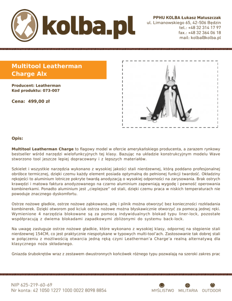Multitool Leatherman Charge Alx Producent: Leatherman Kod produktu: 073-007 Cena: 499,00 zł Opis: Multitool Leatherman Charge to flagowy model w ofercie amerykańskiego producenta, a zarazem rynkowy bestseller wśród narzędzi wielofunkcyjnych tej klasy. Bazując na układzie konstrukcyjnym modelu Wave stworzono tool jeszcze lepiej dopracowany i z lepszych materiałów. Szkielet i wszystkie narzędzia wykonano z wysokiej jakości stali nierdzewnej, którą poddano profesjonalnej obróbce termicznej, dzięki czemu każdy element posiada optymalną do pełnionej funkcji twardość. Okładziny rękojeści to aluminium lotnicze pokryte twardą anodyzacją o wysokiej odporności na zarysowania. Brak ostrych krawędzi i matowa faktura anodyzowanego na czarno aluminium zapewniają wygodę i pewność operowania kombinerkami. Ponadto aluminium jest „cieplejsze” od stali, dzięki czemu praca w niskich temperaturach nie powoduje znacznego dyskomfortu. Ostrze nożowe gładkie, ostrze nożowe ząbkowane, piłę i pilnik można otworzyć bez konieczności rozkładania kombinerek. Dzięki otworom pod kciuk ostrza nożowe można błyskawicznie otworzyć za pomocą jednej ręki. Wymienione 4 narzędzia blokowane są za pomocą indywidualnych blokad typu liner-lock, pozostałe współpracują z dwiema blokadami zapadkowymi zbliżonymi do systemu back-lock. Na uwagę zasługuje ostrze nożowe gładkie, które wykonano z wysokiej klasy, odpornej na stępienie stali nierdzewnej 154CM, co jest praktycznie niespotykane w typowych multi-tool’ach. Zastosowanie tak dobrej stali w połączeniu z możliwością otwarcia jedną ręką czyni Leatherman’a Charge’a realną alternatywą dla klasycznego noża składanego. Gniazda śrubokrętów wraz z zestawem dwustronnych końcówek różnego typu pozwalają na szeroki zakres prac montażowych i naprawę różnorodnego sprzętu. Wygodne przenoszenie zapewnia znajdująca się w zestawie kabura oraz odejmowany klips umożliwiający przypięcie tool’a za paskiem lub o krawędź kieszeni. Funkcje: - kombinerki płaskie - kombinerki standardowe - obciskacz do spłonek - przecinak do drutu - przecinak do drutu twardego - zaciskacz - ostrze nożowe gładkie 72 mm - ostrze nożowe ząbkowane - hak tnący - pilnik do metalu i drewna - pilnik diamentowy - piła do drewna - 3 gniazda na końcówki śrubokrętów - otwieracz do konserw i kapsli - linijka calowa i centymetrowa - odejmowany klips do noszenia - odejmowane kółko do kluczy - wysuwane kółko do kluczy - zestaw dziewięciu końcówek śrubokrętów Gwarancja: 25 lat! Dane techniczne: Materiały: aluminium; stal nierdzewna 420; stal nierdzewna 154CM Wymiary: 102 mm x 39 mm (złożony) Waga: 238 g Producent: Leatherman, USA