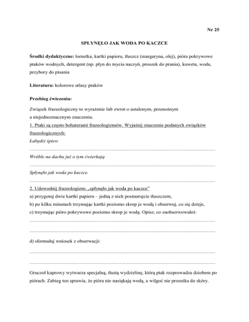 Nr 25 SPŁYNĘŁO JAK WODA PO KACZCE Środki dydaktyczne: lornetka, kartki papieru, tłuszcz (margaryna, olej), pióra pokrywowe ptaków wodnych, detergent (np. płyn do mycia naczyń, proszek do prania), kuweta, woda, przybory do pisania Literatura: kolorowe atlasy ptaków Przebieg ćwiczenia: Związek frazeologiczny to wyrażenie lub zwrot o ustalonym, przenośnym a niejednoznacznym znaczeniu. 1. Ptaki są często bohaterami frazeologizmów. Wyjaśnij znaczenie podanych związków frazeologicznych: Łabędzi śpiew ………………………………………………………………………………………………… Wróble na dachu już o tym ćwierkają ………………………………………………………………………………………………… Spłynęło jak woda po kaczce. ………………………………………………………………………………………………… 2. Udowodnij frazeologizm; „spłynęło jak woda po kaczce” a) przygotuj dwie kartki papieru – jedną z nich posmarujcie tłuszczem, b) po kilku minutach trzymając kartki poziomo skrop je wodą i obserwuj, co się dzieje, c) trzymając pióro pokrywowe poziomo skrop je wodą. Opisz, co zaobserwowałeś: ………………………………………………………………………………………………… ………………………………………………………………………………………………… d) sformułuj wniosek z obserwacji: ………………………………………………………………………………………………… ………………………………………………………………………………………………… Gruczoł kuprowy wytwarza specjalną, tłustą wydzielinę, którą ptak rozprowadza dziobem po piórach. Zabieg ten sprawia, że pióra nie nasiąkają wodą, a wilgoć nie przenika do skóry. 3. Obserwuj zachowanie ptaków pływających kiedy wychodzą na ląd. Zwróć uwagę na ich zachowanie, a następnie zaznacz na sylwetce ptak wodnego miejsce położenia gruczołu kuprowego. http://www.zwierzaczek.strefa.pl/kolorowanki/kaczka/kaczka.html 3. Sprawdź, co się dzieje z piórami, gdy zanurzymy je w czystej wodzie i wodzie z detergentem: a) zanurz pióro pokrywowe w kuwecie z czystą wodą, wyciągnij i strzepnij, b) sprawdź suchość pióra, c) dodaj do wody w kuwecie detergentu, zamieszaj i włóż na chwilę pióro, wyciągnij i strzepnij, d) sprawdź suchość pióra. Sformułuj wniosek z doświadczenia: ………………………………………………………………………………………………… …………………………………………………………………………………………………. 4. Zaobserwuj zachowanie kormoranów po kąpieli w wodzie. http://www.arrakis.es/~alcrique/prestige.htm Wyjaśnij, czemu i dlaczego służy to zachowanie? ………………………………………………………………………………………………… ……………………………………………………………………………………………….. 5. Korzystając z poprzednich doświadczeń i obserwacji wyjaśnij pochodzenie frazeologizmu „wygląda jak zmoknięta kura” ………………………………………………………………………………………………… ………………………………………………………………………………………………..