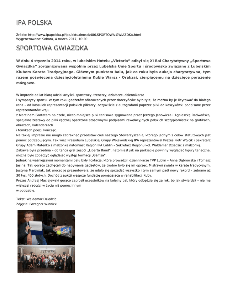 IPA POLSKA Źródło: http://www.ipapolska.pl/ipa/aktualnosci/486,SPORTOWA-GWIAZDKA.html Wygenerowano: Sobota, 4 marca 2017, 10:20 SPORTOWA GWIAZDKA W dniu 4 stycznia 2014 roku, w lubelskim Hotelu „Victoria” odbył się XI Bal Charytatywny „Sportowa Gwiazdka” zorganizowana wspólnie przez Lubelską Unię Sportu i środowisko związane z Lubelskim Klubem Karate Tradycyjnego. Głównym punktem balu, jak co roku była aukcja charytatywna, tym razem poświęcona dziesięcioletniemu Kubie Warsz - Orakzai, cierpiącemu na dziecięce porażenie mózgowe. W imprezie od lat biorą udział artyści, sportowcy, trenerzy, działacze, dziennikarze i sympatycy sportu. W tym roku gadżetów ofiarowanych przez darczyńców było tyle, że można by je licytować do białego rana – od koszulek reprezentacji polskich piłkarzy, oczywiście z autografami poprzez piłki do koszykówki podpisane przez reprezentantów kraju z Marcinem Gortatem na czele, nieco mniejsze piłki tenisowe sygnowane przez Jerzego Janowicza i Agnieszkę Radwańską, specjalne zestawy do piłki ręcznej opatrzone stosownymi podpisami rewelacyjnych polskich szczypiornistek na grafikach, obrazach, kalendarzach i tomikach poezji kończąc. Na takiej imprezie nie mogło zabraknąć przedstawicieli naszego Stowarzyszenia, którego jednym z celów statutowych jest pomoc potrzebującym. Tak więc Prezydium Lubelskiej Grupy Wojewódzkiej IPA reprezentował Prezes Piotr Wójcik i Sekretarz Grupy Adam Mateńko z małżonką natomiast Region IPA Lublin – Sekretarz Regionu kol. Waldemar Dziedzic z małżonką. Zabawa była przednia – do tańca grał zespół „Liberta Band”, natomiast jak na parkiecie powinny wyglądać figury taneczne, można było zobaczyć oglądając występ formacji „Gamza”. Jednak najważniejszymi momentami balu były licytacje, które prowadzili dziennikarze TVP Lublin – Anna Dąbrowska i Tomasz Jasina. Tak gorąco zachęcali do nabywania gadżetów, że trudno było się im oprzeć. Mistrzyni świata w karate tradycyjnym, Justyna Marciniak, tak uroczo je prezentowała, że udało się sprzedać wszystko i tym samym padł nowy rekord – zebrano aż 30 tys. 400 złotych. Dochód z aukcji wesprze fundację pomagającą w rehabilitacji Kuby. Prezes Andrzej Maciejewski gorąco zaprosił uczestników na kolejny bal, który odbędzie się za rok, bo jak stwierdził – nie ma większej radości w życiu niż pomóc innym w potrzebie. Tekst: Waldemar Dziedzic Zdjęcia: Grzegorz Winnicki Ocena: 0/5 (0) Tweetnij