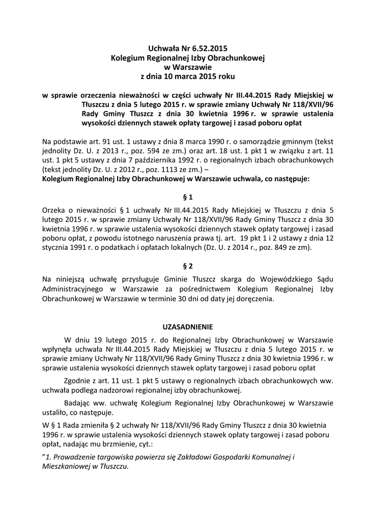 Uchwała Nr 6.52.2015 Kolegium Regionalnej Izby Obrachunkowej w Warszawie z dnia 10 marca 2015 roku w sprawie orzeczenia nieważności w części uchwały Nr III.44.2015 Rady Miejskiej w Tłuszczu z dnia 5 lutego 2015 r. w sprawie zmiany Uchwały Nr 118/XVII/96 Rady Gminy Tłuszcz z dnia 30 kwietnia 1996 r. w sprawie ustalenia wysokości dziennych stawek opłaty targowej i zasad poboru opłat Na podstawie art. 91 ust. 1 ustawy z dnia 8 marca 1990 r. o samorządzie gminnym (tekst jednolity Dz. U. z 2013 r., poz. 594 ze zm.) oraz art. 18 ust. 1 pkt 1 w związku z art. 11 ust. 1 pkt 5 ustawy z dnia 7 października 1992 r. o regionalnych izbach obrachunkowych (tekst jednolity Dz. U. z 2012 r., poz. 1113 ze zm.) – Kolegium Regionalnej Izby Obrachunkowej w Warszawie uchwala, co następuje: §1 Orzeka o nieważności § 1 uchwały Nr III.44.2015 Rady Miejskiej w Tłuszczu z dnia 5 lutego 2015 r. w sprawie zmiany Uchwały Nr 118/XVII/96 Rady Gminy Tłuszcz z dnia 30 kwietnia 1996 r. w sprawie ustalenia wysokości dziennych stawek opłaty targowej i zasad poboru opłat, z powodu istotnego naruszenia prawa tj. art. 19 pkt 1 i 2 ustawy z dnia 12 stycznia 1991 r. o podatkach i opłatach lokalnych (Dz. U. z 2014 r., poz. 849 ze zm). §2 Na niniejszą uchwałę przysługuje Gminie Tłuszcz skarga do Wojewódzkiego Sądu Administracyjnego w Warszawie za pośrednictwem Kolegium Regionalnej Izby Obrachunkowej w Warszawie w terminie 30 dni od daty jej doręczenia. UZASADNIENIE W dniu 19 lutego 2015 r. do Regionalnej Izby Obrachunkowej w Warszawie wpłynęła uchwała Nr III.44.2015 Rady Miejskiej w Tłuszczu z dnia 5 lutego 2015 r. w sprawie zmiany Uchwały Nr 118/XVII/96 Rady Gminy Tłuszcz z dnia 30 kwietnia 1996 r. w sprawie ustalenia wysokości dziennych stawek opłaty targowej i zasad poboru opłat Zgodnie z art. 11 ust. 1 pkt 5 ustawy o regionalnych izbach obrachunkowych ww. uchwała podlega nadzorowi regionalnej izby obrachunkowej. Badając ww. uchwałę Kolegium Regionalnej Izby Obrachunkowej w Warszawie ustaliło, co następuje. W § 1 Rada zmieniła § 2 uchwały Nr 118/XVII/96 Rady Gminy Tłuszcz z dnia 30 kwietnia 1996 r. w sprawie ustalenia wysokości dziennych stawek opłaty targowej i zasad poboru opłat, nadając mu brzmienie, cyt.: ”1. Prowadzenie targowiska powierza się Zakładowi Gospodarki Komunalnej i Mieszkaniowej w Tłuszczu. 2. Zarządza się pobór opłaty targowej w drodze inkasa. 3. Z zainkasowanej gotówki inkasenci rozliczają się z Zakładem Gospodarki Komunalnej i Mieszkaniowej w tym samym dniu. 4. Na wniosek Zakładu Gospodarki Komunalnej i Mieszkaniowej w Tłuszczu na inkasentów opłaty targowej wyznacza się: 1) Pana Adama Wojtyrę 2) Pana Henryka Goceł 5. Wysokość wynagrodzenia za inkaso wynosi 15% od pobranej opłaty targowej. 6. Wynagrodzenie określone w ust. 5 wypłacane będzie inkasentom przez Zakład Gospodarki Komunalnej i Mieszkaniowej, na zasadach ustalonych w odrębnej umowie, która będzie zawarta z inkasentami”. Opłatę targową - w myśl art. 15 ust. 1 ustawy o podatkach i opłatach lokalnych pobiera się od osób fizycznych, osób prawnych oraz jednostek nie mających osobowości prawnej, dokonujących sprzedaży na targowiskach. Stosownie do art. 15 ust. 2 tejże ustawy targowiskami są wszelkie miejsca, w których jest prowadzona sprzedaż. Zaś art. 15 ust. 2b ww. ustawy stanowi, że opłacie targowej nie podlega sprzedaż dokonywana w budynkach lub w ich częściach. W myśl art. 18 ust. 2 pkt 8 cyt. ustawy o samorządzie gminnym do wyłącznej właściwości rady gminy należy podejmowanie uchwał w sprawach podatków i opłat w granicach określonych w odrębnych ustawach. W rozpatrywanej sprawie ustawą, która określa zakres upoważnienia rady gminy jest ustawa o podatkach i opłatach lokalnych. Art. 19 pkt 1 ustawy o podatkach i opłatach lokalnych stanowi delegację dla rady gminy do określenia zasad ustalania i poboru oraz terminów płatności i wysokości stawki opłaty targowej. Na podstawie art. 19 pkt 2 tejże ustawy rada gminy może zarządzić pobór opłaty targowej w drodze inkasa oraz określić inkasentów i wysokość wynagrodzenia za inkaso. A w oparciu o art. 19 pkt 3 ww. ustawy organ stanowiący gminy może wprowadzić inne niż wymienione w ustawie zwolnienia przedmiotowe od opłat lokalnych. W ocenie organu nadzoru postanowienia badanej uchwały w zakresie powierzenia prowadzenia targowiska Zakładowi Gospodarki Komunalnej i Mieszkaniowej w Tłuszczu, ustalenia, że: inkasenci opłaty targowej rozliczają się z tym Zakładem, wyznaczenie inkasentów następuje na wniosek Zakładu Gospodarki Komunalnej i Mieszkaniowej w Tłuszczu, Zakład wypłaca inkasentom wynagrodzenie z tytułu inkasa na zasadach ustalonych w umowie zawartej z inkasentami, wykraczają poza delegację wynikającą z art. 19 pkt 1 i 2 ustawy o podatkach i opłatach lokalnych. Powyższe postanowienia Rady nie stanowią bowiem zasad ustalania i poboru oraz terminów płatności i wysokości stawki opłaty targowej, jak również nie stanowią zarządzenia poboru opłaty targowej w drodze inkasa oraz określenia inkasentów i wysokości wynagrodzenia za inkaso. W ocenie Kolegium Izby w sprawie nie ma zastosowania art. 31 z w związku z art. 3 pkt 3 lit. c ustawy z dnia 29 sierpnia 1997 r. Ordynacja podatkowa (zwanej dalej w skrócie „Ordynacją podatkową”), zgodnie z którym osoby prawne oraz jednostki organizacyjne niemające osobowości prawnej będące inkasentami są obowiązane wyznaczyć osoby, do których obowiązków należy pobieranie podatków oraz terminowe wpłacenie organowi podatkowemu pobranych kwot, a także zgłosić właściwemu miejscowo organowi podatkowemu imiona, nazwiska i adresy tych osób. Z badanej uchwały wynika bowiem, że Rada Miasta nie wyznaczyła na inkasenta opłaty targowej Zakładu Gospodarki Komunalnej i Mieszkaniowej w Tłuszczu lecz wyznaczyła na inkasentów osoby fizyczne na wniosek tego Zakładu. W pr