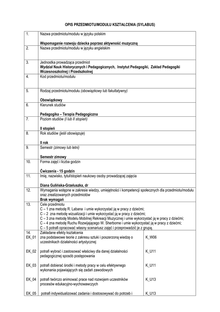 OPIS PRZEDMIOTU/MODUŁU KSZTAŁCENIA (SYLABUS) 1. Nazwa przedmiotu/modułu w języku polskim 2. Wspomaganie rozwoju dziecka poprzez aktywność muzyczną Nazwa przedmiotu/modułu w języku angielskim 3. 4. Jednostka prowadząca przedmiot Wydział Nauk Historycznych i Pedagogicznych, Instytut Pedagogiki, Zakład Pedagogiki Wczesnoszkolnej i Przedszkolnej Kod przedmiotu/modułu 5. Rodzaj przedmiotu/modułu (obowiązkowy lub fakultatywny) 6. Obowiązkowy Kierunek studiów 7. Pedagogika – Terapia Pedagogiczna Poziom studiów (I lub II stopień) 8. II stopień Rok studiów (jeśli obowiązuje) 9. II rok Semestr (zimowy lub letni) 10. Semestr zimowy Forma zajęć i liczba godzin 11. Ćwiczenia - 15 godzin Imię, nazwisko, tytuł/stopień naukowy osoby prowadzącej zajęcia Diana Gulińska-Grzeluszka, dr Wymagania wstępne w zakresie wiedzy, umiejętności i kompetencji społecznych dla przedmiotu/modułu oraz zrealizowanych przedmiotów Brak wymagań 13. Cele przedmiotu C – 1 zna metodę R. Labana i umie wykorzystać ją w pracy z dziećmi; C – 2 zna metodę wizualizacji i umie wykorzystać ją w pracy z dziećmi; C – 3 zna metodę Modelu Mobilnej Rekreacji Muzycznej i umie wykorzystać ją w pracy z dziećmi; C – 4 zna metodę Ruchu Rozwijającego W. Sherborne i umie wykorzystać ją w pracy z dziećmi; C – 5 potrafi opracować własny scenariusz zajęć i przeprowadzić je z grupą. 14. Zakładane efekty kształcenia EK_01 zna podstawowe teorie z zakresu sztuki i poszerzoną wiedzę o K_W06 uczestnikach działalności artystycznej 12. EK_02 potrafi wybrać i zastosować właściwy dla danej działalności pedagogicznej sposób postępowania K_U11 EK_03 potrafi dobierać środki i metody pracy w celu efektywnego wykonania pojawiających się zadań zawodowych K_U11 EK_04 potrafi twórczo animować prace nad rozwojem uczestników procesów edukacyjno-wychowawczych K_U13 EK_05 K_U13 potrafi indywidualizować zadania i dostosowywać do potrzeb i możliwości uczniów EK_06 ma pozytywne nastawienie do nabywania wiedzy z zakresu studiowanej dyscypliny i budowania warsztatu pracy pedagoga K_K04 EK_07 odznacza się rozwagą, dojrzałością i zaangażowaniem w K_K05 projektowaniu, planowaniu i realizowaniu działań pedagogicznych 15. Treści programowe 1.Metoda Rudolfa Labana: - poznawanie swoich możliwości, wyczuwania stosunków przestrzennych i czasowych; - wdrażanie do współpracy w grupie; - wyzwalanie inwencji do samoekspresji i inwencji twórczej; - zachowanie koordynacji ruchowej, dbanie o płynność ruchów. 2. Przeprowadzenie zajęcia przez studentów z wykorzystaniem metody R. Labana. 3.Metoda Modelu Mobilnej Rekreacji Muzycznej: - rozładowanie negatywnych emocji za pomocą ruchu; - kształtowanie poczucia rytmu i estetyki ruchu; - odzwierciedlenie ruchem charakteru i nastroju melodii; - wyrabianie poczucia świadomego ruchu; - wyrażanie swoich emocji za pomocą głosu i ruchów ciała; - budzenie aktywności do wspólnej zabawy do osiągnięcia zadowolenia z wykonywanych czynności . 4.Przeprowadzenie przez studentów zajęcia z wykorzystaniem metody MMRM. 5. Metoda Ruchu Rozwijającego W. Sherborne: - rozwijanie świadomości własnego ciała; -rozwijanie kontaktów i porozumiewania się poprzez ćwiczenia ruchowe; -czerpanie radości z aktywności ruchowej; -rozwijanie poczucia bezpieczeństwa, zaufania. 6. Przeprowadzenie przez studentów zajęć z wykorzystaniem metody W. Sherborne. 16. Zalecana literatura (podręczniki) Bogdanowicz M., Kisiel B., Przasnyska M., Metoda Weroniki Sherborne w terapii i wspomaganiu rozwoju dziecka, WSiP, Warszawa 1997. Kierył M., Elementy terapii i profilaktyki muzycznej, Wydawnictwo ISDN, Warszawa 1996. Klöppel R., Vliex S., Rytmika w wychowaniu i terapii, WSiP, Warszawa 1995. Lewandowska K., Muzykoterapia dziecięca, WSiP, Gdańsk 1996. Ławrowska R., Muzyka i ruch, Wydawnictwo Nasza Księgarnia, Warszawa 1991. Metera A., Muzykoterapia. Muzyka w medycynie i edukacji, Wydawnictwo Centrum Technik Nauki "Metronom", Leszno 2002. 17. Forma zaliczenia poszczególnych komponentów przedmiotu/modułu, sposób sprawdzenia osiągnięcia zamierzonych efektów kształcenia: ćwiczenia: zaliczenie na ocenę 18. Język wykładowy 19. polski Obciążenie pracą studenta Forma aktywności studenta Godziny zajęć (wg planu studiów) z nauczycielem: - ćwiczenia: Praca własna studenta: - opracowanie i przeprowadzenie zajęcia (praca grupowa) i projektu zajęć z wykorzystaniem poznanych na ćwiczeniach metod pracy z dziećmi (opracowanie indywidualne). - przygotowanie do zajęć: - czytanie wskazanej literatury: Suma godzin Liczba punktów ECTS Średnia liczba godzin na zrealizowanie aktywności 15 15 10 10 50 2