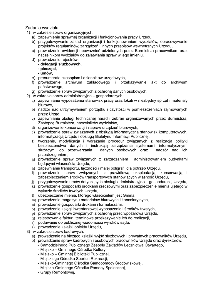 Zadania wydziału 1) w zakresie spraw organizacyjnych: a) zapewnienie sprawnej organizacji i funkcjonowania pracy Urzędu, b) przygotowywanie zasad organizacji i funkcjonowaniem wydziałów, opracowywanie projektów regulaminów, zarządzeń i innych przepisów wewnętrznych Urzędu, c) prowadzenie ewidencji upoważnień udzielonych przez Burmistrza pracownikom oraz naczelnikom wydziałów do załatwiania spraw w jego imieniu, d) prowadzenie rejestrów: - delegacji służbowych, - pieczęci, - umów, e) prenumerata czasopism i dzienników urzędowych, f) prowadzenie archiwum zakładowego i przekazywanie akt do archiwum państwowego, g) prowadzenie spraw związanych z ochroną danych osobowych, 2) w zakresie spraw administracyjno – gospodarczych: a) zapewnianie wyposażenia stanowisk pracy oraz lokali w niezbędny sprzęt i materiały biurowe, b) nadzór nad utrzymywaniem porządku i czystości w pomieszczeniach zajmowanych przez Urząd, c) zapewnianie obsługi technicznej narad i zebrań organizowanych przez Burmistrza, Zastępcę Burmistrza, naczelników wydziałów, d) organizowanie konserwacji i napraw urządzeń biurowych, e) prowadzenie spraw związanych z obsługą informatyczną stanowisk komputerowych, informatyzacją Urzędu i obsługą Biuletynu Informacji Publicznej, f) tworzenie, modyfikacja i wdrażanie procedur związanych z realizacją polityki bezpieczeństwa danych i instrukcją zarządzania systemami informatycznymi służącymi do przetwarzania danych osobowych oraz nadzór nad ich przestrzeganiem, g) prowadzenie spraw związanych z zarządzaniem i administrowaniem budynkami będącymi własnością Urzędu, h) zapewnianie transportu, łączności i małej poligrafii dla potrzeb Urzędu, i) prowadzenie spraw związanych z prawidłową eksploatacją, konserwacją i zabezpieczeniem środków transportowych stanowiących własność Urzędu, j) przygotowywanie umów dotyczących obsługi administracyjno – gospodarczej Urzędu, k) prowadzenie gospodarki środkami rzeczowymi oraz zabezpieczenie mienia ujętego w wykazie środków trwałych Urzędu, l) ubezpieczanie mienia, którego właścicielem jest Gmina, m) prowadzenie magazynu materiałów biurowych i kancelaryjnych, n) prowadzenie gospodarki drukami i formularzami, o) prowadzenie księgi inwentarzowej wyposażenia i środków trwałych, p) prowadzenie spraw związanych z ochroną przeciwpożarową Urzędu, q) rejestrowanie faktur i terminowe przekazywanie ich do realizacji, r) podawanie do publicznej wiadomości wyroków sądu, s) prowadzenie książki obiektu Urzędu, 3) w zakresie spraw kadrowych: a) prowadzenie na bieżąco książki wyjść służbowych i prywatnych pracowników Urzędu, b) prowadzenie spraw kadrowych i osobowych pracowników Urzędu oraz dyrektorów: - Samodzielnego Publicznego Zespołu Zakładów Lecznictwa Otwartego, - Miejsko – Gminnego Ośrodka Kultury, - Miejsko – Gminnej Biblioteki Publicznej, - Miejskiego Ośrodka Sportu i Rekreacji, - Miejsko-Gminnego Ośrodka Samopomocy Środowiskowej, - Miejsko-Gminnego Ośrodka Pomocy Społecznej, - Grupy Remontowej, w zakresie obsługi mieszkańców: a) przyjmowanie dokumentów od klientów, sprawdzanie właściwości miejscowej i rzeczowej oraz kwalifikowanie kompletności dokumentacji; b) prowadzenie w systemie elektronicznym centralnego rejestru korespondencji przychodzącej, w tym ewidencjonowanie, rejestrowanie, rozdział i rozliczanie korespondencji i przesyłek; c) prowadzenie w systemie elektronicznym centralnego rejestru korespondencji wychodzącej w tym wysyłanie korespondencji i przesyłek; d) dekretacja pism na poszczególne komórki organizacyjne Urzędu z wyłączeniem pism zastrzeżonych do dekretacji przez Burmistrza; e) udzielanie informacji klientom (pisemnie, ustnie, telefonicznie, drogą elektroniczną) o: - miejscu, sposobie i terminie załatwiania spraw w Urzędzie, - dokumentach wymaganych do załatwienia sprawy, - procedurach obowiązujących przy załatwianiu sprawy, - strukturze organizacyjnej Urzędu, w tym o godzinach pracy Urzędu oraz zakresie zadań poszczególnych referatów i stanowisk pracy, f) udostępnianie formularzy wniosków i dokumentów oraz pomoc przy ich wypełnianiu, g) stwierdzanie na wniosek klienta zgodności z oryginałem kopii pism lub dokumentów urzędowych, 5) w zakresie wdrażania i eksploatacji systemów informatycznych: a) nadzorowanie poprawnego funkcjonowania systemu sieciowego oraz poszczególnych systemów użytkowych, w tym tworzenie kopii zabezpieczających bazy informacyjne oraz modyfikowanie haseł dostępu do zasobów sieciowych – profile użytkowników, b) nadzór techniczny nad dostępem do internetu oraz obsługa operatorska skrzynek email, c) analizowanie propozycji i ofert dotyczących zakupu sprzętu informatycznego, systemów informatycznych i ewentualnych wdrożeń, opiniowanie ich oraz przedkładanie wniosków, d) przejmowanie zakupionych lub otrzymanych systemów informatycznych (oprogramowanie i dokumentacja systemowa), e) instalowanie systemów informatycznych w Urzędzie oraz wdrażanie wspólnie z pracownikami wydziałów, f) uaktualnianie instalacji systemów użytkowych, otrzymywanych od producentów oprogramowania na serwerze lub stanowiskach użytkowych, g) dbanie o racjonalne użytkowanie sprzętu informatycznego, h) systematyczne wykonywanie okresowej konserwacji, drobnych napraw oraz konfigurowanie zestawów komputerowych, i) współdziałanie z jednostkami informatycznymi administracji rządowej w zakresie unifikacji i standaryzacji rozwiązań informatycznych, j) wykonywanie obowiązków administratora bezpieczeństwa informacji, k) obsługa techniczna strony internetowej, l) systematyczne wprowadzanie danych do BIP, 6) przygotowywanie dokumentów do archiwizacji. 4)
