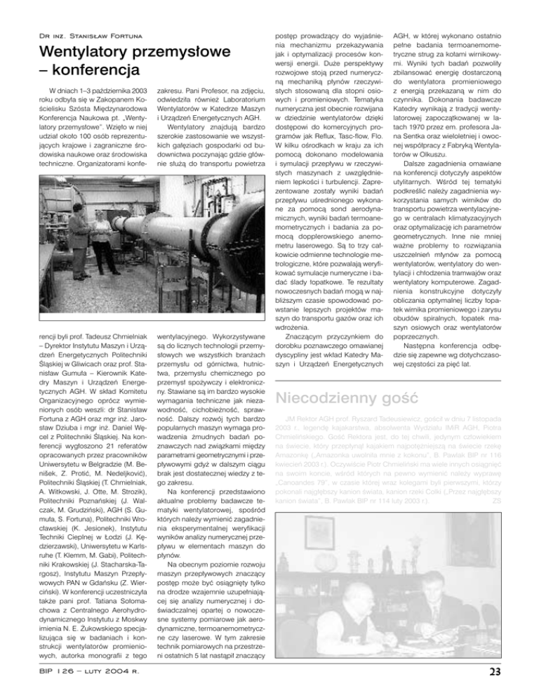 Dr in¿. Stanis³aw Fortuna Wentylatory przemys³owe – konferencja W dniach 1–3 paŸdziernika 2003 roku odby³a siê w Zakopanem Koœcielisku Szósta Miêdzynarodowa Konferencja Naukowa pt. „Wentylatory przemys³owe”. Wziê³o w niej udzia³ oko³o 100 osób reprezentuj¹cych krajowe i zagraniczne œrodowiska naukowe oraz œrodowiska techniczne. Organizatorami konfe- zakresu. Pani Profesor, na zdjêciu, odwiedzi³a równie¿ Laboratorium Wentylatorów w Katedrze Maszyn i Urz¹dzeñ Energetycznych AGH. Wentylatory znajduj¹ bardzo szerokie zastosowanie we wszystkich ga³êziach gospodarki od budownictwa poczynaj¹c gdzie g³ównie s³u¿¹ do transportu powietrza rencji byli prof. Tadeusz Chmielniak – Dyrektor Instytutu Maszyn i Urz¹dzeñ Energetycznych Politechniki Œl¹skiej w Gliwicach oraz prof. Stanis³aw Gumu³a – Kierownik Katedry Maszyn i Urz¹dzeñ Energetycznych AGH. W sk³ad Komitetu Organizacyjnego oprócz wymienionych osób weszli: dr Stanis³aw Fortuna z AGH oraz mgr in¿. Jaros³aw Dziuba i mgr in¿. Daniel Wêcel z Politechniki Œl¹skiej. Na konferencji wyg³oszono 21 referatów opracowanych przez pracowników Uniwersytetu w Belgradzie (M. Benišek, Z. Protiæ, M. Nedeljkoviæ), Politechniki Œl¹skiej (T. Chmielniak, A. Witkowski, J. Otte, M. Strozik), Politechniki Poznañskiej (J. Walczak, M. Grudziñski), AGH (S. Gumu³a, S. Fortuna), Politechniki Wroc³awskiej (K. Jesionek), Instytutu Techniki Cieplnej w £odzi (J. Kêdzierzawski), Uniwersytetu w Karlsruhe (T. Klemm, M. Gabi), Politechniki Krakowskiej (J. Stacharska-Targosz), Instytutu Maszyn Przep³ywowych PAN w Gdañsku (Z. Wierciñski). W konferencji uczestniczy³a tak¿e pani prof. Tatiana So³omachowa z Centralnego Aerohydrodynamicznego Instytutu z Moskwy imienia N. E. ¯ukowskiego specjalizuj¹ca siê w badaniach i konstrukcji wentylatorów promieniowych, autorka monografii z tego wentylacyjnego. Wykorzystywane s¹ do licznych technologii przemys³owych we wszystkich bran¿ach przemys³u od górnictwa, hutnictwa, przemys³u chemicznego po przemys³ spo¿ywczy i elektroniczny. Stawiane s¹ im bardzo wysokie wymagania techniczne jak niezawodnoœæ, cichobie¿noœæ, sprawnoœæ. Dalszy rozwój tych bardzo popularnych maszyn wymaga prowadzenia ¿mudnych badañ poznawczych nad zwi¹zkami miêdzy parametrami geometrycznymi i przep³ywowymi gdy¿ w dalszym ci¹gu brak jest dostatecznej wiedzy z tego zakresu. Na konferencji przedstawiono aktualne problemy badawcze tematyki wentylatorowej, spoœród których nale¿y wymieniæ zagadnienia eksperymentalnej weryfikacji wyników analizy numerycznej przep³ywu w elementach maszyn do p³ynów. Na obecnym poziomie rozwoju maszyn przep³ywowych znacz¹cy postêp mo¿e byæ osi¹gniêty tylko na drodze wzajemnie uzupe³niaj¹cej siê analizy numerycznej i doœwiadczalnej opartej o nowoczesne systemy pomiarowe jak aerodynamiczne, termoanemometryczne czy laserowe. W tym zakresie technik pomiarowych na przestrzeni ostatnich 5 lat nast¹pi³ znacz¹cy BIP 126 – luty 2004 r. postêp prowadz¹cy do wyjaœnienia mechanizmu przekazywania jak i optymalizacji procesów konwersji energii. Du¿e perspektywy rozwojowe stoj¹ przed numeryczn¹ mechanik¹ p³ynów rzeczywistych stosowan¹ dla stopni osiowych i promieniowych. Tematyka numeryczna jest obecnie rozwijana w dziedzinie wentylatorów dziêki dostêpowi do komercyjnych programów jak Reflux, Tasc-flow, Flo. W kilku oœrodkach w kraju za ich pomoc¹ dokonano modelowania i symulacji przep³ywu w rzeczywistych maszynach z uwzglêdnieniem lepkoœci i turbulencji. Zaprezentowane zosta³y wyniki badañ przep³ywu uœrednionego wykonane za pomoc¹ sond aerodynamicznych, wyniki badañ termoanemometrycznych i badania za pomoc¹ dopplerowskiego anemometru laserowego. S¹ to trzy ca³kowicie odmienne technologie metrologiczne, które pozwalaj¹ weryfikowaæ symulacje numeryczne i badaæ œlady ³opatkowe. Te rezultaty nowoczesnych badañ mog¹ w najbli¿szym czasie spowodowaæ powstanie lepszych projektów maszyn do transportu gazów oraz ich wdro¿enia. Znacz¹cym przyczynkiem do dorobku poznawczego omawianej dyscypliny jest wk³ad Katedry Maszyn i Urz¹dzeñ Energetycznych AGH, w której wykonano ostatnio pe³ne badania termoanemometryczne strug za ko³ami wirnikowymi. Wyniki tych badañ pozwoli³y zbilansowaæ energiê dostarczon¹ do wentylatora promieniowego z energi¹ przekazan¹ w nim do czynnika. Dokonania badawcze Katedry wynikaj¹ z tradycji wentylatorowej zapocz¹tkowanej w latach 1970 przez em. profesora Jana Sentka oraz wieloletniej i owocnej wspó³pracy z Fabryk¹ Wentylatorów w Olkuszu. Dalsze zagadnienia omawiane na konferencji dotyczy³y aspektów utylitarnych. Wœród tej tematyki podkreœliæ nale¿y zagadnienia wykorzystania samych wirników do transportu powietrza wentylacyjnego w centralach klimatyzacyjnych oraz optymalizacjê ich parametrów geometrycznych. Inne nie mniej wa¿ne problemy to rozwi¹zania uszczelnieñ m³ynów za pomoc¹ wentylatorów, wentylatory do wentylacji i ch³odzenia tramwajów oraz wentylatory komputerowe. Zagadnienia konstrukcyjne dotyczy³y obliczania optymalnej liczby ³opatek wirnika promieniowego i zarysu obudów spiralnych, ³opatek maszyn osiowych oraz wentylatorów poprzecznych. Nastêpna konferencja odbêdzie siê zapewne wg dotychczasowej czêstoœci za piêæ lat. Niecodzienny goœæ JM Rektor AGH prof. Ryszard Tadeusiewicz, goœci³ w dniu 7 listopada 2003 r., legendê kajakarstwa, absolwenta Wydzia³u IMiR AGH, Piotra Chmieliñskiego. Goœæ Rektora jest, do tej chwili, jedynym cz³owiekiem na œwiecie, który przep³yn¹³ kajakiem najpotê¿niejsz¹ na œwiecie rzekê Amazonkê („Amazonka uwolni³a mnie z kokonu”, B. Pawlak BIP nr 116 kwiecieñ 2003 r.). Oczywiœcie Piotr Chmieliñski ma wiele innych osi¹gniêæ na swoim koncie, wœród których na pewno wymieniæ nale¿y wyprawê „Canoandes 79”, w czasie której wraz kolegami byli pierwszymi, którzy pokonal