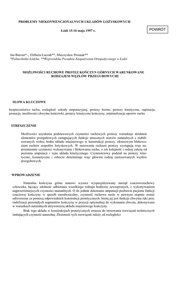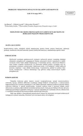 PROBLEMY NIEKONWENCJONALNYCH UKŁADÓW ŁOŻYSKOWYCH Łódź 15-16 maja 1997 r. POWRÓT Jan Burcan*~, Elżbieta Łuczak**, Mieczysław Prosnak** *Politechnika Łódzka, **Wojewódzka Poradnia Zaopatrzenia Ortopedycznego w Łodzi MOŻLIWOŚCI RUCHOWE PROTEZ KOŃCZYN GÓRNYCH WARUNKOWANE RODZAJEM WĘZŁÓW PRZEGUBOWYCHI SŁOWA KLUCZOWE bezpieczeństwo ruchu, rozległość szkody amputacyjnej, protezy bierne, protezy kinetyczne, supinacja, pronacja, możliwości chwytne końcówki, protezy kinetyczne kończyny, minimalizacja oporów ruchu STRESZCZENIE Możliwości uzyskania podstawowych czynności ruchowych protezy warunkuje działanie elementów przegubowych zastępujących funkcje utraconych stawów naturalnych a stabilizowanych wobec braku układu mięśniowego w konstrukcji protezy, okresowym blokowaniem ruchów zespołów łożyskowych. W sterowaniu ruchami protezy występują więc naprzemiennie czynności wykonywania i blokowania ruchu, a ich kolejność i rodzaj zależą od poziomu amputacji i typu układu kinetycznego. Czynnościowy podział na protezy kinetyczne, kosmetyczne i robocze determinuje więc głównie rodzaj zastosowanych węzłów przegubowych. WPROWADZENIE Naturalna kończyna górna stanowi wysoce wyspecjalizowany narząd czucioworuchowy człowieka, łączący zdolność odbierania wszelkiego rodzaju bodźców zewnętrznych, z wykonywaniem najprzeróżniejszych czynności manualnych. O ile jednak dokonanie amputacji pozbawia pacjenta funkcji czuciowej kończyny w sposób nieodwracalny, czynność ruchowa może w pewnym stopniu zostać odtworzona za pomocą odpowiednich konstrukcji protetycznych. Istotą jej jest funkcja chwytna ręki przy stabilizacji pozostałych segmentów kończyny w pozycji optymalnej do wykonania chwytu, dokonywana w warunkach naturalnych aktywnością układu mięśniowego kończyny. Brak tego układu w konstrukcjach protetycznych zmusza do stosowania rozwiązań technicznych imitujących czynność naturalną. Złożoność tych rozwiązań zależy od rozległości szkody amputacyjnej określającej liczbę segmentów i połączeń stawowych do uzupełniania na drodze protetycznej. MOŻLIWOŚCI RUCHOWE PROTEZ KOŃCZY GÓRNYCH Zasadnicza czynność mięśnia kończyny górnej sprowadza się w sensie ruchowym do następujących po sobie okresów wykonywania ruchu i stabilizacji w określonym położeniu, dokonywanych w odpowiednich zespołach funkcjonalnych. Ruchy w protezach typu biernego wykonuje się za pomocą ręki zachowanej lub odpowiednich trików wykonawczych (zamach, podparcie itp.), a w protezach kinetycznych ciągiem linki czynnej (cięgna) uruchamianej odpowiednim ruchem ciała, a powrotem do stanu wyjściowego pod wpływem ciężaru protezy lub pracy sprężyny (ryc. 1). Rys. ł. Główne operacje czynne w protezach kinetycznych cięgnowych: A - chwyt (rozwarcie końcówki z mechanicznym zamknięciem lub odwrotnie), B - zgięcie łokcia (wyprost bierny pod ciężarem przedramienia), C - blokada przegubu łokciowego lub zwolnienie blokady (ruchy naprzemienne). Stabilizację natomiast osiąga się poprzez zablokowanie ruchu w odpowiednich przegubach za pomocą zamków uruchamiających drugą ręką bądź inną ręką czynną, której kolejne ruchy powodują naprzemienne włączanie lub zwalnianie systemu blokującego. Okresowa blokada elementów przegubowych jest więc istotnym czynnikiem biomechanicznym kinetyzacji protez, a zespoły łączące węzeł przegubowy z czynnym zamkiem blokującym stanowią ogromną większość w rozwiązaniach konstrukcyjnych. Pomijając działanie bierne protez kosmetycznych i roboczych dokonywane za pomocą ręki zachowanej, można w aktywnej czynności ruchowej protez kinetycznych wyróżnić kilka typowych operacji, których złożoność zależy od poziomu amputacji określającego zakres ubytku czynności wymagającej odtworzenia na drodze protetycznej. W najprostszych konstrukcyjnie protezach przedramienia odtwarzających jedynie czynność chwytną ręki, stopień kinetyzacji sprowadza się do powodowanego ciągiem linki czynnej rozwierania bądź zamykania chwytaka w postaci haka czynnego lub ręki protezowej (ryc. 2 i 3), z przeciwnym ruchem zachodzącym pod działaniem gumy lub sprężyny (protezy czynne otwierane bądź czynne zamykane, ryc. 4), często z automatyczną blokadą chwytu aby zapobiec możliwości przypadkowego rozwarcia. Kikuty długie umożliwiają przy tym zastosowanie czynnych przegubów obrotowych w uchwycie nadgarstkowym, zwiększającym dzięki supinacji i pronacji możliwości chwytne końcówki. Przy kikutach krótkich pozostaje tylko możliwość regulacji biernej. Rys. 2. Rodzaje haków dwudzielnych zależne od elementów uczynniających: A - hak cięgnowy pierścieniowy (guma lub sprężyna śrubowa), B - hak cięgnowy naciągowy (sprężyna śrubowa lub guma), C - hak cięgnowy z dźwigniową przekładnią naciągu (zmienne napięcie początkowe siła - naciągu), D - hak cięgnowy ze sprężyną spiralną (zwykle osłoniętą). Rys. 3. Główne formy konstrukcyjne rąk protezowych: A - ręka lita (z ruchomym kciukiem), B - ręka skorupowa z litymi palcami (konstrukcja mieszana), C - ręka skorupawa (z ruchomym kciukiem), D - ręka szkieletowa (miękka rękawica kosmetyczna). Rys. 4. Zasadnicze rodzaje końcówek kinetycznych (schemat): A - czynnie otwierana, B - czynnie zamykana. a - ciąg linki czynnej, b - przeciwstawne działanie sprężyny (gumy). Znacznie trudniejsze pod względem konstrukcyjnym kinetyczne protezy ramienia, odtwarzające oprócz zdolności chwytu także możliwości czynnych ruchów w przegubie łokciowym, wymagają dokonywania skojarzonych operacji ruchowych, jak zgięcie przedramienia blok łokcia - rozwarcie i zamknięcie chwytu, bądź rozwarcie chwytu - zwolnienie blokady łokcia - samoistny wyprost przedramienia (pod wpływem siły ciężkości), przy czym bierne ruchy obrotowe przegubu łokciowego zwiększają przestrzeń techniczną p