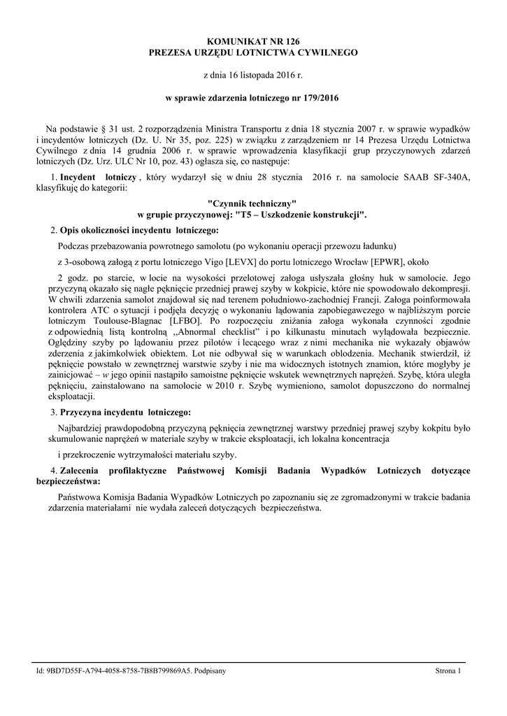 KOMUNIKAT NR 126 PREZESA URZĘDU LOTNICTWA CYWILNEGO z dnia 16 listopada 2016 r. w sprawie zdarzenia lotniczego nr 179/2016 Na podstawie § 31 ust. 2 rozporządzenia Ministra Transportu z dnia 18 stycznia 2007 r. w sprawie wypadków i incydentów lotniczych (Dz. U. Nr 35, poz. 225) w związku z zarządzeniem nr 14 Prezesa Urzędu Lotnictwa Cywilnego z dnia 14 grudnia 2006 r. w sprawie wprowadzenia klasyfikacji grup przyczynowych zdarzeń lotniczych (Dz. Urz. ULC Nr 10, poz. 43) ogłasza się, co następuje: 1. Incydent lotniczy , który wydarzył się w dniu 28 stycznia klasyfikuję do kategorii: 2016 r. na samolocie SAAB SF-340A, "Czynnik techniczny" w grupie przyczynowej: "T5 – Uszkodzenie konstrukcji". 2. Opis okoliczności incydentu lotniczego: Podczas przebazowania powrotnego samolotu (po wykonaniu operacji przewozu ładunku) z 3-osobową załogą z portu lotniczego Vigo [LEVX] do portu lotniczego Wrocław [EPWR], około 2 godz. po starcie, w locie na wysokości przelotowej załoga usłyszała głośny huk w samolocie. Jego przyczyną okazało się nagłe pęknięcie przedniej prawej szyby w kokpicie, które nie spowodowało dekompresji. W chwili zdarzenia samolot znajdował się nad terenem południowo-zachodniej Francji. Załoga poinformowała kontrolera ATC o sytuacji i podjęła decyzję o wykonaniu lądowania zapobiegawczego w najbliższym porcie lotniczym Toulouse-Blagnac [LFBO]. Po rozpoczęciu zniżania załoga wykonała czynności zgodnie z odpowiednią listą kontrolną ,,Abnormal checklist” i po kilkunastu minutach wylądowała bezpiecznie. Oględziny szyby po lądowaniu przez pilotów i lecącego wraz z nimi mechanika nie wykazały objawów zderzenia z jakimkolwiek obiektem. Lot nie odbywał się w warunkach oblodzenia. Mechanik stwierdził, iż pęknięcie powstało w zewnętrznej warstwie szyby i nie ma widocznych istotnych znamion, które mogłyby je zainicjować – w jego opinii nastąpiło samoistne pęknięcie wskutek wewnętrznych naprężeń. Szybę, która uległa pęknięciu, zainstalowano na samolocie w 2010 r. Szybę wymieniono, samolot dopuszczono do normalnej eksploatacji. 3. Przyczyna incydentu lotniczego: Najbardziej prawdopodobną przyczyną pęknięcia zewnętrznej warstwy przedniej prawej szyby kokpitu było skumulowanie naprężeń w materiale szyby w trakcie eksploatacji, ich lokalna koncentracja i przekroczenie wytrzymałości materiału szyby. 4. Zalecenia profilaktyczne bezpieczeństwa: Państwowej Komisji Badania Wypadków Lotniczych dotyczące Państwowa Komisja Badania Wypadków Lotniczych po zapoznaniu się ze zgromadzonymi w trakcie badania zdarzenia materiałami nie wydała zaleceń dotyczących bezpieczeństwa. Id: 9BD7D55F-A794-4058-8758-7B8B799869A5. Podpisany Strona 1 p.o. Prezesa Urzędu Lotnictwa Cywilnego Piotr Samson Id: 9BD7D55F-A794-4058-8758-7B8B799869A5. Podpisany Strona 2