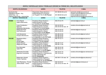 ZESPOŁY WSPIERAJĄCE SZKOŁY PROMUJĄCE ZDROWIE NA TERENIE WOJ. WIELKOPOLSKIEGO ZESPÓŁ WOJEWÓDZKI Agnieszka Dyk Magdalena Stoicka – Kluj Marta Paul – Lis Dagmara Marchodej - Leszczyńska ZESPOŁY REGIONALNE KONIN Anna Filipiak Agata Wilamowska Aneta Koralewska – Bębenek Aleksandra Stacherska Małgorzata Pluta Ewa Ostrowicka Lidia Baraniecka Krystyna Skonieczna KALISZ Magdalena Mróz – Radoms Dorota Datko Sylwia Wierusz Małgorzata Zapała Ewa Marszałek Agata Rak Aleksandra Knychała Bogumiła Chowańska Małgorzata Jóźwiak Teresa Typańska Julia Pilichiewicz - Poczta Jolanta Bader - Kubus ADRES Wojewódzka Stacja Sanitarno – Epidemiologiczna w Poznaniu os. Przyjaźni 118, 61-680 Poznań ADRES Powiatowa Stacja Sanitarno – Epidemiologiczna w Kole ul. Toruńska 72, 62-600 Koło Powiatowa Stacja Sanitarno – Epidemiologiczna w Koninie ul. Staszica 16, 62-500 Konin Powiatowa Stacja Sanitarno – Epidemiologiczna w Słupcy ul. Kosciuszki9, 62-400 Słupca Powiatowa Stacja Sanitarno – Epidemiologiczna w Turku ul. Uniejowska 1a, 62-700 Turek Powiatowa Stacja Sanitarno – Epidemiologiczna w Jarocinie ul. Wąska 2, 63-200 Jarocin Powiatowa Stacja Sanitarno – Epidemiologiczna w Kaliszu ul. Poznańska 44, 62-800 Kalisz Powiatowa Stacja Sanitarno – Epidemiologiczna w Kępnie ul. Pocztowa 1-3, 63-600 Kępno Powiatowa Stacja Sanitarno – Epidemiologiczna w Ostrzeszowie ul. Gen. Sikorskiego 58, 63-500 Ostrzeszów Powiatowa Stacja Sanitarno – Epidemiologiczna w Pleszewie ul. Poznańska 30, 63-300 Pleszew Powiatowa Stacja Sanitarno – Epidemiologiczna w Krotoszynie ul. Floriańska 10, 63-700 Krotoszyn TELEFON 061 656 80 20 do 24 061 656 80 02 do 04 TELEFON E-MAIL [email protected] [email protected] [email protected] [email protected] E-MAIL 063 272 22 79 [email protected] 063 243 90 52 063 243 90 50 wew. 24 [email protected] 063 274 36 42 063 274 63 43 [email protected] 063 280 36 92 063 280 36 82 063 280 36 87 062 747 23 17 [email protected] 062 597 72 27 062 597 72 26 [email protected] 062 782 32 38 062 782 32 16 [email protected] 062 732 07 70 062 730 39 40 [email protected] 062 508 13 30 wew. 34 [email protected] 062 722 05 91 062 725 32 34 wew. 44 [email protected] [email protected] Grażyna Kornaszewska Joanna Żywica LESZNO Joanna Hajnce Kalina Pabisiak – Ignaszewska Iwona Wachowska Izabela Olińska Joanna Nowak Małgorzata Jasik Grażyna Szwarczyńska PIŁA Małgorzata Ferfet Małgorzata Jagiełło Grażyna Libront Paulina Dobska Alicja Krzyżanowska Halina Jachocka Lidia Chełminiak Dorota Kubat POZNAŃ Ewa Krzyżańska Krystyna Jakobsze Honorata Ciechański Katarzyna Łamaszewska Powiatowa Stacja Sanitarno – Epidemiologiczna w Ostrowie Wlkp. Pl. Stefana Rowińskiego 3, 63-400 Ostrów Wlkp. Powiatowa Stacja Sanitarno – Epidemiologiczna w Kościanie ul. Piaskowa 42a, 64-000 Kościan Powiatowa Stacja Sanitarno – Epidemiologiczna w Lesznie ul. Niepodległości 66, 64-100 Leszno Powiatowa Stacja Sanitarno – Epidemiologiczna w Rawicz ul. Wały J. Dąbrowskiego 2, 63-900 Rawicz Powiatowa Stacja Sanitarno – Epidemiologiczna w Gostyniu ul. Wrocławska 8, 66-700 Gostyń Powiatowa Stacja Sanitarno – Epidemiologiczna w Chodzieży ul. Składowa 5, 64-800 Chodzież Powiatowa Stacja Sanitarno – Epidemiologiczna w Czarnkowie ul. Zamkowa 8, 66-700 Czarnków Powiatowa Stacja Sanitarno – Epidemiologiczna w Pile Al. Wojska Polskiego 43, 64-920 Piła Powiatowa Stacja Sanitarno – Epidemiologiczna w Złotowie ul. M. Lubego 1/1, 77-400 Złotów Powiatowa Stacja Sanitarno – Epidemiologiczna w Gnieźnie ul. Św. Wawrzyńca 18, 62-200 Gniezno Powiatowa Stacja Sanitarno – Epidemiologiczna w Grodzisku Wlkp. ul. Rakoniewiecka 42, 62-065 Grodzisk Wlkp. 062 737 89 26 062 737 89 00 062 737 89 02 [email protected] 065 512 22 33 065 512 63 37 [email protected] 065 526 15 15 [email protected] 065 545 39 37 [email protected] 065 572 14 75 065 572 14 66 [email protected] 067 282 02 72 w. 14 [email protected] 067 255 22 40 [email protected] 067 351 98 41 067 351 98 58 [email protected] 067 263 34 27 (44) [email protected] 061 426 22 42 wew.117 i 118 [email protected] 061 444 60 67 [email protected] [email protected] Anastazja Krysztofek Kinal Maria Spychała Magdalena Balcerek Lucyna Matysiak Elżbieta Komanda Dagmara Kramer Kłosowicz Hanna Jankowska Joanna Cichocka Anna Kowalska Danuta Kannchen Elżbieta Poniewierska Ewa Rogacka Anna Mendyka Alina Mąka Ina Łapacz Agnieszka Borkowska Maria Wróblewska Teresa Żak Anna Węclewska Małgorzata Szmit aktualizacja 08.2008 r. Powiatowa Stacja Sanitarno – Epidemiologiczna w Międzychodzie ul. Strzelecka 12, 64-000 Międzychód Powiatowa Stacja Sanitarno – Epidemiologiczna w Nowym Tomyślu Pl. Niepodległości 4, 64-300 Nowy Tomyśl Powiatowa Stacja Sanitarno – Epidemiologiczna w Obornikach ul. Piłsudskiego 76, 64-600 Oborniki Powiatowa Stacja Sanitarno – Epidemiologiczna w Poznaniu ul. Sieroca 10, 61-771 Poznań Powiatowa Stacja Sanitarno – Epidemiologiczna w Szamotułach ul. Chrobrego 8, 64-500 Szamotuły Powiatowa Stacja Sanitarno – Epidemiologiczna w Śremie Ul. Wiejska 2, 63-100 Śrem Powiatowa Stacja Sanitarno – Epidemiologiczna w Środzie Wlkp. ul. Żwirki i Wigury 1, 63-000 Środa Wlkp. Powiatowa Stacja Sanitarno – Epidemiologiczna w Wągrowcu ul. Gnieźnieńska 49, 62-100 Wągrowiec Powiatowa Stacja Sanitarno – Epidemiologiczna w Wolsztynie ul. Drzymały 16, 64-200 Wolsztyn Powiatowa Stacja Sanitarno – Epidemiologiczna we Wrześni ul. Wrocławska 42, 62-300 Września 095 748 24 08 095 748 24 11 [email protected] 061 442 08 00 061 442 08 11 [email protected] 061 296 04 07 061 655 91 54 [email protected] 061 856 28 80 061 852 58 62 [email protected] 061 292 15 34 wew. 38 061 292 15 70 wew. 24 [email protected] 061 289 54 75 061 289 54 91 [email protected] 061 286 70 87 061 286 70 80 061 286 70 81 [email protected] 067 268 56 80 [email protected] 068 384 20 71 [email protected] 061 436 07 32 061 436 07 32 [e