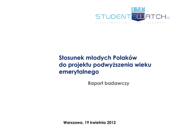 Stosunek młodych Polaków do projektu podwyższenia wieku emerytalnego Raport badawczy Warszawa, 19 kwietnia 2012 Opinie młodych Polaków na temat podwyższenia wieku emerytalnego - Raport Nota metodologiczna Głównym celem badania było poznanie wiedzy i opinii młodych Polaków na temat rządowego projektu podwyższenia wieku emerytalnego. Zbadano również opinie na temat różnych aspektów systemu emerytalnego oraz poziom zaufania do różnych instytucji publicznych, w tym Zakładu Ubezpieczeń Społecznych. Badanie zostało zrealizowane metodą wywiadów on-line w dniach 11-15 kwietnia 2011 roku na losowej próbie 1750 panelistów StudentsWatch w wieku 18-30 lat. Wyniki są reprezentatywne dla Polaków w wieku 18-30 lat ze względu na łączny rozkład wieku i płci. Opinie młodych Polaków na temat podwyższenia wieku emerytalnego - Raport Wnioski (1) Ponad trzy czwarte (76,7 proc.) młodych Polaków nie popiera rządowego projektu podwyższenia wieku emerytalnego. Ponad połowa (56,6 proc.) jest temu zdecydowanie przeciwna. Zaledwie 17,3 proc. nie widzi nic złego w pracowaniu do 67 roku życia. Najmniej takich osób jest wśród 18-20-latków (10,3 proc.). Nieco wyższy poziom poparcia w stosunku do badanej populacji przejawiają sympatycy o poglądach centrowych (38,7 proc.) oraz lewicowych (31,4 proc.). Poparcie dla koncepcji podwyższenia wieku emerytalnego łagodnie rośnie wraz z poziomem miesięcznych zarobków - wśród zarabiających ponad 2500 PLN miesięcznie na rękę poziom poparcia wynosi 37,2 proc., podczas gdy w najniższej grupie dochodowej (poniżej 500 PLN) jedynie 17,4 proc. osób popiera rządowy projekt. Podobnie, aż co trzecia osoba (33,2 proc.) o zarobkach przekraczających 2500 PLN nie widzi nic złego w pracy do 67 roku życia. Dla odmiany, wśród najgorzej zarabiających uważa tak jedynie 14,1 proc. Opinie młodych Polaków na temat podwyższenia wieku emerytalnego - Raport Wnioski (2) Gdyby rząd mógł zrekompensować niekorzystną sytuację wywołaną podwyżką wieku emerytalnego, najwięcej młodych Polaków zjednałby gwarantujac podwyższenie zarobków - w ten sposób przekonałby 69,5 proc. przeciwników projektu. Prawie sześciu na dziesięcu nieprzekonanych (58%) poparłoby projekt w zamian za powstanie nowych miejsc pracy. Dotyczy to przede wszystkim osób bezrobotnych i nie pracujących (67,8%). Prawie połowa (48,8%) uczyniłaby to, gdyby mogła płacić niższe podatki. Najmniej atrakcyjne, bo jedynie dla co trzeciej osoby (33,6 proc.) byłoby obniżenie (dłużej płaconych) składek emerytalnych. Nieco wyższy poziom poparcia w stosunku do badanej populacji przejawiają sympatycy centrowych (38,7 proc.) oraz lewicowych (31,4 proc.). Poparcie dla koncepcji podwyższenia wieku emerytalnego łagodnie rośnie wraz z poziomem miesięcznych zarobków - wśród zarabiających ponad 2500 PLN miesięcznie na rękę poziom poparcia wynosi 37,2 proc., podczas gdy w najniższej grupie dochodowej (poniżej 500 PLN) jedynie 17,4 proc. osób popiera rządowy projekt. Podobnie, aż co trzecia osoba (33,2 proc.) o zarobkach przekraczających 2500 PLN nie widzi nic złego w pracy do 67 roku życia. Dla odmiany, wśród najgorzej zarabiających uważa tak jedynie 14,1 proc. Opinie młodych Polaków na temat podwyższenia wieku emerytalnego - Raport Wnioski (3) Ponad połowa młodych Polaków (59,5) nie wróży najlepiej obecnemu systemowi emerytalnemu - prawie co trzecia osoba (31,7%) jest zdecydowanie przekonana o tym, że obecny system upadnie w ciągu kilku lat. Aż ośmiu na dziesięciu (78,9 proc.) uważa, że obecny system emerytalny nie jest w dobrej w kondycji. Połowa (49,9 proc.) zdecydowanie nie zgadza się, że rządowy projekt nie ma alternatywy. Zdaniem dwóch trzecich (66 proc.) nie jest nią podwyższenie obecnych składek. Młodzi Polacy najczęściej uważają, że obecne progi emerytalne są odpowiednie - w przypadku kobiet za progiem 60 lat opowiada się co trzecia osoba; a w przypadku mężczyzn próg 65 lat wyznaczyło 29 proc. osób. Co ciekawe, optymalny próg który mógłby być rozpatrywany w drugiej kolejności to 55 lat dla kobiet i 60 lat dla mężczyzn. Opinie młodych Polaków na temat podwyższenia wieku emerytalnego - Raport Wnioski (4) Jednocześnie, ZUS jest instytucją, której młodzi Polacy ufają najmniej (2,03 punktu na skali 7-stopniowej skali). Przedostatnie miejsce zajmuje aktualna koalicja PO-PSL (2,24). Znacznie bardziej młodzi Polacy skłonni są zaufać Otwartym Funduszom Emerytalnym (3,05). Najmniej ufne są osoby zarabiajace najwięcej (1,82) lub które ukończyły 26 lat (1,94). Młodzi Polacy najczęściej nie potrafią oszczędzać dużych kwot. Prawie co trzecia osoba (32,6) przyznaje, że miesięcznie nie udaje się jej odłożyć ani złotówki na konto oszczędnościowe lub lokatę. Ponad drugie tyle (35,7 proc.) nie odkłada więcej niz 500 PLN miesięcznie. Jedynie co szósta osoba (16,4 proc.) deklaruje posiadanie Indywidualnego Konta Emerytalnego. Młodzież nie lekceważy doświadczonych pracowników. Ponad połowa (57 proc.) zatrudnionych twierdzi, że w pracy korzysta z wiedzy i doświadczenia starszych współpracowników. Jednocześnie, podobny odsetek młodych Polaków (54,7 proc.) uważa, że podwyższenie wieku emerytalnego spowoduje wzrost konkurencji między młodszymi a starszymi pracownikami. Opinie młodych Polaków na temat podwyższenia wieku emerytalnego - Raport Poparcie dla podwyższenia wieku emerytalnego Czy popierasz rządowy projekt podwyższenia wieku emerytalnego do 67 lat (w roku 2020 dla mężczyzn, w roku 2040 dla kobiet)? 2,9 5,3 Zdecydowanie popieram 15,2 56,6 20,1 Raczej popieram Raczej nie popieram Zdecydowanie nie popieram Nie mam zdania N = 1750 Wyniki w % Opinie młodych Polaków na temat podwyższenia wieku emerytalnego - Raport Poparcie dla podwyższenia wieku emerytalnego ze względu na poglądy polityczne Czy popierasz rządowy projekt podwyższenia w