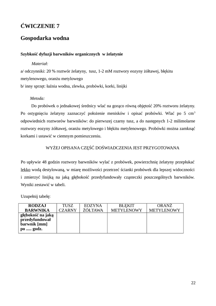 ĆWICZENIE 7 Gospodarka wodna Szybkość dyfuzji barwników organicznych w żelatynie Materiał: a/ odczynniki: 20 % roztwór żelatyny, tusz, 1-2 mM roztwory eozyny żółtawej, błękitu metylenowego, oranżu metylowego b/ inny sprzęt: łaźnia wodna, zlewka, probówki, korki, linijki Metoda: Do probówek o jednakowej średnicy wlać na gorąco równą objętość 20% roztworu żelatyny. Po ostygnięciu żelatyny zaznaczyć położenie menisków i opisać probówki. Wlać po 5 cm 3 odpowiednich roztworów barwników: do pierwszej czarny tusz, a do następnych 1-2 milimolarne roztwory eozyny żółtawej, oranżu metylowego i błękitu metylenowego. Probówki można zamknąć korkami i ustawić w ciemnym pomieszczeniu. WYŻEJ OPISANA CZĘŚĆ DOŚWIADCZENIA JEST PRZYGOTOWANA Po upływie 48 godzin roztwory barwników wylać z probówek, powierzchnię żelatyny przepłukać lekko wodą destylowaną, w miarę możliwości przetrzeć ścianki probówek dla lepszej widoczności i zmierzyć linijką na jaką głębokość przedyfundowały cząsteczki poszczególnych barwników. Wyniki zestawić w tabeli. Uzupełnij tabelę: RODZAJ BARWNIKA głębokość na jaką przedyfundował barwnik [mm] po ..... godz. TUSZ CZARNY EOZYNA ŻÓŁTAWA BŁĘKIT METYLENOWY ORANŻ METYLENOWY 22 Szybkość dyfuzji w zależności od gęstości ośrodka Materiał: a/ odczynniki: 30 %. 10 % i 2.5 % roztwory żelatyny, 0.1 % roztwór błękitu metylenowego b/ inny sprzęt: łaźnia wodna, zlewka, probówki, pipeta, linijki Metoda: Przygotować na gorąco 30 %, 10 % i 2,5 % roztwory żelatyny. Napełnić nimi ( do tej samej wysokości trzy probówki o jednakowej średnicy. Po ostudzeniu żelatyny do każdej probówki wlać pipetą po 5 cm3 0,1 % roztworu błękitu metylenowego. Probówki ustawić w ciemnym pomieszczeniu. WYŻEJ OPISANA CZĘŚĆ DOŚWIADCZENIA JEST PRZYGOTOWANA DLA STUDENTÓW Po 48 godzinach wylać z probówek błękit metylenowy, powierzchnię żelatyny przepłukać lekko wodą destylowaną, a następnie zmierzyć linijką na jaką głęboko przedyfundowaly cząsteczki barwnika w poszczególnych probówkach. Wyniki zestawić w tabeli. Uzupełnij tabelę: STĘŻENIE ŻELATYNY głębokość na jaką przedyfundował barwnik [mm] po ..... godz. 30 % 10 % 2.5 % Przepuszczalność żywej i martwej cytoplazmy komórek roślinnych Materiał a/ rośliny: korzeń buraka ćwikłowego b/ odczynniki: 20 % kwas solny, 70 % etanol, aceton, woda destylowana c/ inny sprzęt: probówki, łaźnia wodna, sitko, nóż Metoda: Z korzenia buraka ćwikłowego wyciąć 5 równych prostopadłościennych kostek i wypłukać je bardzo dokładnie na sitku pod bieżącą wodą. Po jednym kawałku włożyć do pięciu oznaczonych 23 probówek. Do dwóch pierwszych wlać po 5 cm3 wody destylowanej, do następnych odpowiednio: 20 % kwas solny, 70 % etanol i aceton. Jedną probówkę z wodą wsławić na 5 minut do wrzącej łaźni wodnej. Po upływie 1 godziny zawartość probówek wymieszać i przeprowadzić obserwację zabarwienia płynów. Uzupełnij tabelę OBIEKT KONTROLA – woda 20° C ZABARWIENIE UZASADNIENIE woda – 100 ° C 20 % HCl 70 % etanol aceton Oznaczanie wielkości siły ssącej tkanki bulwy ziemniaka Materiał a/ rośliny: bulwy ziemniaka b/ odczynniki: H2O, 0.2, 0.3, 0.4, 0.5, 1.0 M roztwory sacharozy c/ inny sprzęt, szalki Pełnego, skalpel, suwak z noniuszem Metoda Do sześciu szalek Petriego oznaczonych kolejnymi numerami wlać odpowiednio: 0.2, 0.3, 0 4, 0.5 i 0.6 molarne roztwory sacharozy. Z bulwy ziemniaka wyciąć sześć prostopadłościennych kawałków o jednakowej długości np. 40 mm. Długość każdego kawałka zmierzyć dokładnie przy pomocy suwaka z noniuszem i kolejno wrzucać je do odpowiednich roztworów, całkowicie zanurzając. Po godzinie wyjmować kolejno fragmenty tkanki i ponownie dokładnie zmierzyć ich długość. Uzyskane wyniki zestawić w tabeli. DŁUGOŚĆ [ mm ] uwagi: STĘŻENIE SACHAROZY: 0.2 M 0.3 M 0.4 0.5 0.6 pomiar początkowy pomiar końcowy różnica (Aby obliczyć różnicę należy od pomiaru końcowego odjąć początkowy.) 24 Gutacja – założenie doświadczenia Materiał: a/ rośliny: tygodniowe siewki pszenicy b/ inny sprzęt: szalki Petriego, eksykator lub szklany pojemnik Metoda: Tydzień przed doświadczeniem wysiać na bibułę do szalek Petriego, uprzednio moczone przez kilka godzin nasiona pszenicy. Kiełkować je w termostacie w temperaturze 22°C. Liście siewek wykorzystanych do doświadczenia powinny wydobyć się juz z pochewek liściowych. Tak przygotowany materiał roślinny należy przenieść do szklanego naczynia (na przykład do eksykatora). Siewki obficie podlać wodą. Do szybkiego wysycenia powietrza parą wodną należy do naczynia wstawić pojemnik z wodą. Po około godzinie czasu można już obserwować wykraplanie wody przez liście. Z doświadczenia wyciągnąć wnioski. Założyć doświadczenia z gospodarki mineralnej (jeden zestaw na grupę) Wpływ zasolenia roztworu glebowego na kiełkowanie i wzrost siewek pszenicy Materiał a/ rośliny: nasiona pszenicy b/ odczynniki: woda destylowana, NaCI c/ inny sprzęt: kolby miarowe, doniczki, piasek, waga, cylindry, linijki Metoda: Oznaczyć numerami pięć doniczek. Każdą doniczkę napełnić równą ilością piasku i doprowadzić do jednakowej wagi Do każdej doniczki należy dodać 100 cm 3 wody destylowanej na 1 kilogram piasku. Następnie wykorzystać sporządzone wcześniej cztery roztwory NaCI wykonane według przepisu nr 1. Do doniczki oznaczonej numerem 1 dodać wodę destylowaną (kontrola). Do następnych kolejno roztwory NaCI, Wodę i roztwory dodawać w ilości 50 cm3 na 1 kilogram piasku. Do tak przygotowanych doniczek posadzić po 10 suchych nasion pszenicy. Co kilka dni doniczki podlewać do stałej wagi. Po tygodniu przeprowadzić obserwację: oznaczyć liczbę skiełkowanych ziarniaków i średnią wysokość roślin. Można także oznaczyć długość korzeni oraz świe