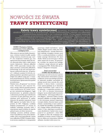 XXXXXXXXXXXX Nowości ze świata trawy syntetycznej Zalety trawy syntetycznej sprawiają, że powstaje coraz wiecej obiektów wykonanych w tej technologii. Boiska wielofunkcyjne, szkolne czy piłkarskie z nawierzchnią syntetyczną to już codzienny widok. Coraz lepsze materiały umożliwiają proponowanie nowych rozwiązań i zastosowań. Niektóre z nich to następcy już istniejących rozwiązań (DOMO Champion Infinity – piłka nożna), inne to zastępowanie trawy naturanej (DOMO Tee – golf), a jeszcze inne to znajdowanie zastosowań do tej pory nie kojarzonych ze sztuczną trawą (DOMO Ski MontBlanc II – narciarstwo, DOMO Equiturf – jeździectwo). DOMO Champion Infinity – syntetyczna trawa piłkarska – następny krok Piłka nożna jest sportem bardzo dynamicznym, w którym wyskoki do piłki, upadki, wślizgi stanowią nieodzowną jego część. W celu zwiększenia komfortu gry oraz ograniczenia ilości kontuzji, takich jak otarcia, stłuczenia kolan i łokci, a także zużycia stawów kolanowych, federacje piłkarskie FIFA i UEFA opracowały wytyczne określające parametry nawierzchni piłkarskich. Dostosowując się do tych wytycznych producenci zaoferowali trawę tzw. „III generacji” o włóknach wysokości 40–60 mm, wypełnioną piaskiem i granulatem gumowym. Dzięki temu piłkarze mogą grać w warunkach przypominających murawę naturalną bez konieczności ograniczania ilości godzin jej użytkowania. Niestety trawa „III generacji” ma również wady. Stosowany jako materiał tłumiący energię udarową granulat gumowy często przemieszcza się, boisko wymaga więc systematycznej pielęgnacji. Ciągłe przemieszczanie się granulatu połączone z utlenianiem powoduje jego rozdrobnienie i tworzenie się pyłu gumowego, który jest wdychany przez sportowców. W upalne, słoneczne dni granulat (najczęściej czarny SBR) nagrzewa się bardzo łatwo do temperatury ok. 60°C. Podgrzany i poddany działaniu prominiowania UV zaczyna się rozkładać wydzielając pochodne siarki, a nieprzyjemny zapach, podobny do zapachu palonych opon, jest dosyć intensywny. Analizując powyższe problemy postanowiono wyprodukować trawę, która eliminowałaby wady swojej poprzedniczki. System trawy piłkarskiej DOMO Champion Infinity nie zawiera wypełniaczy, w tym granulatu 1(4)/2008 gumowego, a dzięki swej budowie – oprócz włókien długich zawiera wielką ilość krótkich, kędzierzawych – posiada właściwości, które spełniają wymagania stawiane przez FIFA, co zostało potwierdzone w wynikach badań uznanego laboratorium ISA Sport Nordic. Można na tej trawie grać w obuwiu takim samym jak na trawie „III generacji”, nie wywołuje ona oparzeń przy poślizgu, a tłumienie energii udarowej jest zgodne z wymaganiami FIFA. Boisko takie już wykonano w Hergiswil w Szwajcarii. Stoki narciarskie – DOMO Ski MontBlanc II Zwiększający się ruch turystyczny w górach, chęć wykorzystania infrastruktury poprzez wydłużenie sezonu narciarskiego sprawiają, że właściciele ośrodków narciarskich poszukują nowych form rozrywki dla swych klientów w okresie letnim i jesiennym. Coraz częściej spotykamy się ze sztucznymi stokami narciarskimi. Część z nich to stoki zadaszone, z temperaturą powietrza od –2 do –10°C, ze sztucznie wytworzonym śniegiem. Są one jednak bardzo kosztowne, wielka budowla – stoki mają po kilkaset metrów długości – izolowana cieplnie, wymaga znacznych nakładów na energię elektryczną w celu utrzymania ujemnej temperatury wewnątrz obiektu. Znacznie tańsze są stoki otwarte z nawierzchnią ze trawy syntetycznej. DOMO Ski MontBlanc II produkowana jest z białego włókna polietylenowego wysokości 15 mm, odpornego na promieniowanie ultrafioletowe. Gęstość trawy wynosi ponad 63 tys. pęczków/m2, a detex 8800. Ze względu na duże siły występujące przy zjeżdżaniu na nartach, osnowa w którą tuftuje się włókna jest wzmocniona włóknem szklanym. Szerokość rolek wynosi 4 m. BUDOWNICTWO SPORTOWE I REKREACYJNE Syntetyczna trawa piłkarska DOMO Champion Infinity 55 XXXXXXXXXXXXXXX Stok z trawy syntetycznej DOMO Ski MontBlanc II Oferowany przez nas system nawierzchni narciarskiej z trawy syntetycznej DOMO Ski MontBlanc II umożliwia korzystanie ze stoku przez okrągły rok, a komfort jazdy jest bliski naturalnemu. W zimie świetnie spełnia również rolę pomocniczą w miejscach szczególnie mocno obciążonych ruchem narciarzy: przy kasach, bramkach, w miejscach wyhamowywania czy podjeżdżania do wyciągu. Ułożenie trawy w miejscach odsłoniętych, gdzie wiatr wywiewa śnieg, zmniejsza nakłady pracy na przygotowanie stoku, gdyż nasza trawa „przytrzymuje” śnieg i umożliwia jazdę nawet przy minimalnej jego grubości. Stok, na którym trawa ma być wyłożona musi być odpowiednio przygotowany. Przede wszystkim należy zdjąć trawę i humus, a następnie utwardzić go np. za pomocą tłucznia. Ze względu na konieczność równomiernego zraszania całej powierzchni stoku, należy rozmieścić na nim dysze oraz rurki doprowadzające wodę. Zaleca się stosowanie wody w obiegu zamkniętym, uzdatnionej, pozbawionej elementów organicznych, nasion trawy, czy zalążków mchu, gdyż chętnie rosną one w dobrze nawodnionym środowisku i mogą powodować niszczenie nawierzchni. Komfort i bezpieczeństwo jazdy podnosi warstwa amortyzująca wykonana np. z granulatu gumowego lub pianki PE w razie upadku zabezpieczając przed potłuczeniem. Na tak przygotowanym podłożu rozwija się dywan z trawy syntetycznej i mocuje do podłoża. Analogicznie przygotowuje się ścieżki wyciągów. Stoki z trawy syntetycznej DOMO Ski MontBlanc nadają się do jazdy na nartach zjazdowych, carvingowych – można krawędziować – i snowboardzie, a także do snow-tubingu, czyli jazdy na dętce, oraz na „jabłuszkach”. Nachylenie stoku oraz jego wyprofilowanie jest właściwie dowolne, ograniczone tylko wymaganiami właśc