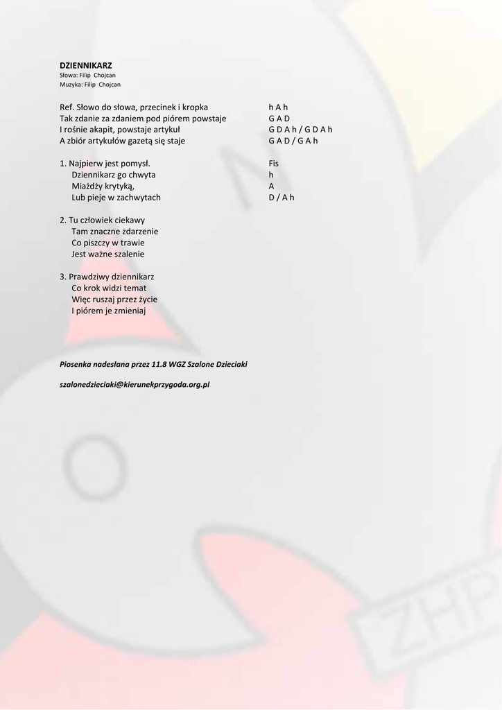 DZIENNIKARZ Słowa: Filip Chojcan Muzyka: Filip Chojcan Ref. Słowo do słowa, przecinek i kropka Tak zdanie za zdaniem pod piórem powstaje I rośnie akapit, powstaje artykuł A zbiór artykułów gazetą się staje 1. Najpierw jest pomysł. Dziennikarz go chwyta Miażdży krytyką, Lub pieje w zachwytach 2. Tu człowiek ciekawy Tam znaczne zdarzenie Co piszczy w trawie Jest ważne szalenie 3. Prawdziwy dziennikarz Co krok widzi temat Więc ruszaj przez życie I piórem je zmieniaj h A h G A D G D A h / G D A h G A D / G A h Fis h A D / A h Piosenka nadesłana przez 11.8 WGZ Szalone Dzieciaki [email protected]