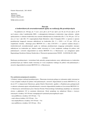 Ożarów Mazowiecki, 2011-08-05 Burmistrz Miasta i Gminy Ożarów Mazowiecki WŚiR 6220.4.42.2011 Decyzja o środowiskowych uwarunkowaniach zgody na realizację dla przedsięwzięcia Na podstawie art. 104 kpa, art. 71 ust.1, ust.2, pkt 2, art.75 ust.1 pkt 4, art. 84, art. 85 ust.2 pkt 2, art.78 ust.4 ustawy z dnia 3 października 2008 r. o udostępnieniu informacji o środowisku i jego ochronie, udziale społeczeństwa w ochronie środowiska oraz ocenach oddziaływania na środowisko (Dz. U. Nr 199, poz. 1227 ze zm.), § 3 ust. 1 pkt 42b i 70 rozporządzenia Rady Ministrów z dnia 9 listopada 2010 r. w sprawie w sprawie przedsięwzięć mogących znacząco oddziaływać na środowisko (Dz. U. z 2010 r. nr 213 poz. 1397), po rozpatrzeniu wniosku złożonego przez BIOTON S.A. z dnia 23.05.2011 r. w sprawie wydania decyzji o środowiskowych uwarunkowaniach zgody na realizację przedsięwzięcia mogącego potencjalnie znacząco oddziaływać na środowisko pn: budowa studni wierconej nr 6 oraz urządzenia wodnego do poboru wód podziemnych z utworów oligoceńskich na terenie BIOTON S.A. w Macierzyszu i po zasięgnięciu opinii Regionalnego Dyrektora Ochrony Środowiska w Warszawie (postanowienie WOOŚ – II.4220.946.2011.BS). orzekam Realizację przedsięwzięcia i stwierdzam brak potrzeby przeprowadzenia oceny oddziaływania na środowisko przedsięwzięcia pn: budowa studni wierconej nr 6 oraz urządzenia wodnego do poboru wód podziemnych z utworów oligoceńskich na terenie BIOTON S.A. w Macierzyszu Przy spełnieniu następujących warunków : 1) Rodzaj i miejsce realizacji przedsięwzięcia : Planowana inwestycja polega na wykonaniu studni wierconej nr 6 oraz urządzeń wodnych do poboru wód podziemnych z utworów oligoceńskich na terenie BIOTON S.A., na dz.ew.4/71 w miejscowości Macierzysz, gmina Ożarów Mazowiecki. zgodnie z „Projektem prac geologicznych w zakresie wykonania ujęcia wód podziemnych z utworów oligoceńskich (studnia nr 6) na terenie BIOTON S.A. w Macierzyszu zatwierdzonym przez Starostę Powiatu Warszawskiego Zachodniego projektuje się wykonanie otworu o głębokości 235 m systemem obrotowym. Otwór projektuje się zabudować filtrem z tworzyw sztucznych o średnicy 165/150 mm i następujących wymiarach poszczególnych części: - rura podfiltrowa o średnicy 165/150 mm – 7 m - część robocza średnicy 165/150 mm – 8 m - rura międzyfiltrowa o średnicy 165/150 mm – 9 m - rura nadfiltrowa o średnicy 165/150 mm – 40 m 1 Część roboczą filtru stanowić będzie rura perforowana szczelinowo o szerokości szczeliny 0,5 mm. Wokół filtru wykonana będzie osypka o średnicy ziaren 0,8-1,2 mm w strefie głębokości 252,5-218 m, a w strefie głębokości 218-185 m uszczelka o średnicy 3-5 mm. W otworze zostaną wykonane prace i badania hydrogeologiczne polegające na usprawnieniu otworu i przeprowadzeniu próbnego pompowania zgodnie z ww. Projektem prac geologicznych. W studni zamontowana zostanie pompa głębinowa opuszczona na głębokość 40 m p.p.t. Kolumna rur wiertniczych zamknięta zostanie szczelną głowicą studzienną uzbrojoną w zawory zwrotny i czepialny, zasuwę klinową i wodomierz umieszczone w obudowie naziemnej typu „Lange”. obudowa postawiona zostanie na podłożu betonowym wystającym do 10 cm ponad powierzchnię o wymiarach 1,66 m x 1,10 m. Podstawa obudowy wykonana będzie z ocieplanej konstrukcji ażurowej. Pokrywę obudowy o wymiarach 1,34 m x 0,80 m i wysokości 1,35 m składająca się z części wewnętrznej i zewnętrznej będzie tworzyć laminat poliestrowoszklany z przestrzenią wypełnioną pianką poliuretanową . Pokrywa wyposażona będzie w uchwyt do jej podnoszenia oraz kominek wentylacyjny. Działka wyznaczona pod otwór nr 6 od wschodu i południa graniczy z Instytutem Biotechnologii i antybiotyków, na którego terenie znajdują się 2 budynki mieszkalne. Zgodnie z zapotrzebowaniem studnia powinna dostarczać wodę w ilości 35 m3/h, dla potrzeb pitnych oraz technologicznych-produkcji insuliny. projektowana studnia nr 6 stanowić będzie główne ujęcie wody, a istniejąca eksploatowana studnia nr 5 będzie ujęciem awaryjnym. Zgodnie z informacjami zawartymi w karcie informacyjnej przedsięwzięcia planowana studnia zlokalizowana będzie w południowej części działki w odległości 35 m od studni nr 5 (ujmującej oligoceński poziom wodonośny) i 15 m od studni nr 3 (ujmującej czwartorzędowy poziom wodonośny). Lej depresji obliczony przy poborze wody w ilości 35 m3/h obejmuje obszar w promieniu 219 m. W zasięgu oddziaływania planowanej studni nr 6 nie ma żadnej studni oligoceńskiej poza studnią nr 5 inwestora studnia nr 5 będzie studnią awaryjną w stosunku do studni nr 6. biorąc pod uwagę charakter i skalę planowanego przedsięwzięcia stwierdza się, że wielkość i złożoność oddziaływania inwestycji nie wpłynie znacząco na stan środowiska. Dla terenu planowanej inwestycji brak jest uchwalonego miejscowego planu zagospodarowania przestrzennego. Do dnia 31 grudnia 2003 r. przeznaczeniem terenu planowej inwestycji było: teren produkcyjny. 2) Warunki wykorzystania terenu w fazie realizacji i eksploatacji ze szczególnym uwzględnieniem konieczności ochrony cennych wartości przyrodniczych, zasobów naturalnych i zabytków oraz ograniczenia uciążliwości dla terenów sąsiednich: a) powstające w trakcie inwestycji odpady należy selektywnie gromadzić w przeznaczonych do tego pojemnikach i sukcesywnie wywozić z terenu budowy przekazując specjalistycznym firmom, nie dopuszcza się składowania odpadów bezpośrednio na ziemi; b) teren objęty decyzją nie znajduje się w strefie ochrony konserwatorskiej i archeologicznej w związku z czym nie podlega przepisom ustawy o ochronie dóbr kultury; c) przedsięwzięcie będzie realizowane poza miejscem wystąpienia obszarów wodno-błotnych i innych o płytkim zaleganiu wód podziemnych; d) przedmiotowe przedsięwzięcie leży p
