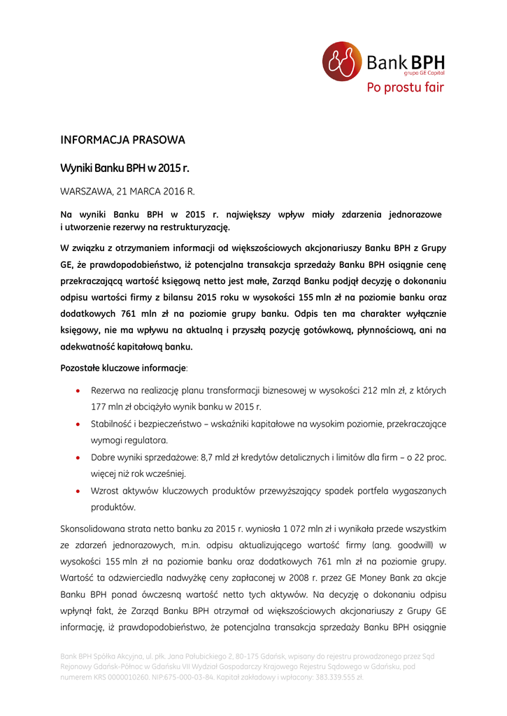 INFORMACJA PRASOWA Wyniki Banku BPH w 2015 r. WARSZAWA, 21 MARCA 2016 R. Na wyniki Banku BPH w 2015 r. największy wpływ miały zdarzenia jednorazowe i utworzenie rezerwy na restrukturyzację. W związku z otrzymaniem informacji od większościowych akcjonariuszy Banku BPH z Grupy GE, że prawdopodobieństwo, iż potencjalna transakcja sprzedaży Banku BPH osiągnie cenę przekraczającą wartość księgową netto jest małe, Zarząd Banku podjął decyzję o dokonaniu odpisu wartości firmy z bilansu 2015 roku w wysokości 155 mln zł na poziomie banku oraz dodatkowych 761 mln zł na poziomie grupy banku. Odpis ten ma charakter wyłącznie księgowy, nie ma wpływu na aktualną i przyszłą pozycję gotówkową, płynnościową, ani na adekwatność kapitałową banku. Pozostałe kluczowe informacje: Rezerwa na realizację planu transformacji biznesowej w wysokości 212 mln zł, z których 177 mln zł obciążyło wynik banku w 2015 r. Stabilność i bezpieczeństwo – wskaźniki kapitałowe na wysokim poziomie, przekraczające wymogi regulatora. Dobre wyniki sprzedażowe: 8,7 mld zł kredytów detalicznych i limitów dla firm – o 22 proc. więcej niż rok wcześniej. Wzrost aktywów kluczowych produktów przewyższający spadek portfela wygaszanych produktów. Skonsolidowana strata netto banku za 2015 r. wyniosła 1 072 mln zł i wynikała przede wszystkim ze zdarzeń jednorazowych, m.in. odpisu aktualizującego wartość firmy (ang. goodwill) w wysokości 155 mln zł na poziomie banku oraz dodatkowych 761 mln zł na poziomie grupy. Wartość ta odzwierciedla nadwyżkę ceny zapłaconej w 2008 r. przez GE Money Bank za akcje Banku BPH ponad ówczesną wartość netto tych aktywów. Na decyzję o dokonaniu odpisu wpłynął fakt, że Zarząd Banku BPH otrzymał od większościowych akcjonariuszy z Grupy GE informację, iż prawdopodobieństwo, że potencjalna transakcja sprzedaży Banku BPH osiągnie Bank BPH Spółka Akcyjna, ul. płk. Jana Pałubickiego 2, 80-175 Gdańsk, wpisany do rejestru prowadzonego przez Sąd Rejonowy Gdańsk-Północ w Gdańsku VII Wydział Gospodarczy Krajowego Rejestru Sądowego w Gdańsku, pod numerem KRS 0000010260. NIP:675-000-03-84. Kapitał zakładowy i wpłacony: 383.339.555 zł. cenę przekraczającą wartość księgową netto jest małe. Korekta ta ma charakter wyłącznie księgowy i jest zgodna z międzynarodowymi standardami rachunkowości. Potwierdzeniem tego są wskaźniki Banku BPH, które na koniec 2015 r. wyniosły: całkowity współczynnik kapitałowy (TCR): 16,6 proc. oraz Tier 1: 14,2 proc. W 2015 r. Bank BPH ogłosił transformację biznesową, dzięki której ma znacząco obniżyć koszty. Realizacja planu ma wpłynąć na poprawę krótko- i długoterminowych wyników banku we wszystkich najważniejszych obszarach. Na wynikającą z planu restrukturyzację bank utworzył rezerwę w wysokości 212 mln zł, z których 177 mln zł obciążyło jego wynik w 2015 r. W ubiegłym roku negatywny wpływ na dochodowość banku miała także składka zapłacona na rzecz Funduszu Wsparcia Kredytobiorców wynosząca 24 mln zł, a także dodatkowa wpłata na rzecz Bankowego Funduszu Gwarancyjnego w wysokości 23,4 mln zł. Bez zdarzeń jednorazowych wynik brutto Banku BPH wyniósłby 35 mln zł. Na wyniki banku w 2015 r. korzystnie wpłynęło utrzymanie odpisów z tytułu utraty wartości na niskim poziomie 44 mln zł, między innymi dzięki bardzo dobrej jakości portfela kredytowego. Całkowity koszt ryzyka wyniósł 0,2 proc. Wskaźnik kredytów z utratą wartości utrzymuje się na niskim poziomie 7,5 proc. i poprawił się o 1,9 pp. w porównaniu z 2014 r. Na koniec 2015 r. aktywa banku osiągnęły wartość 31,3 mld zł, co oznacza spadek o 0,8 proc. względem 2014 r. Gdyby nie został dokonany odpis wartości firmy, wówczas aktywa wzrosłyby o 2 proc. – Pozytywnym trendem, który obserwujemy od kilku kwartałów jest wzrost aktywów Banku BPH w zakresie kluczowych produktów. Przewyższa on spadek aktywów tych produktów, które stopniowo wygaszamy – mówi Richard Gaskin, Prezes Zarządu Banku BPH. Bankowość detaliczna W minionym roku bank pozyskiwał klientów, promując między innymi rachunki osobiste. Posiadaczom Lubię to! Konto zaoferował zwrot 3 proc. wartości transakcji bezgotówkowych realizowanych kartą. Promocja była wsparta kampanią telewizyjną, dzięki czemu w minionym roku bank otworzył 28 tys. rachunków Lubię to! Konto. W II kw. bank wprowadził promocję dla osób powyżej 55. roku życia, pobierających emeryturę lub rentę. Klienci, którzy zdecydowali się otworzyć Kapitalne Konto i przekazywać na nie swoje świadczenie z ZUS, przez dwa lata są zwolnieni z opłaty za prowadzenie rachunku oraz mogą otrzymać zwrot 5 proc. wydatków opłaconych kartą w aptekach. Bank BPH Spółka Akcyjna, ul. płk. Jana Pałubickiego 2, 80-175 Gdańsk, wpisany do rejestru prowadzonego przez Sąd Rejonowy Gdańsk-Północ w Gdańsku VII Wydział Gospodarczy Krajowego Rejestru Sądowego w Gdańsku, pod numerem KRS 0000010260. NIP:675-000-03-84. Kapitał zakładowy i wpłacony: 383.339.555 zł. Na koniec 2015 r. Bank BPH prowadził ponad 535 tys. rachunków osobistych dla klientów indywidualnych, co stanowi 11-proc. wzrost w stosunku do poprzedniego roku. Istotnym elementem oferty depozytowej dla klientów indywidualnych są produkty inwestycyjne. W ramach otwartej architektury bank udostępnia produkty czterech towarzystw inwestycyjnych. W 2015 r. Bank BPH przeprowadził również cztery emisje strukturyzowanych certyfikatów depozytowych, pozyskując 210,2 mln zł. W całym roku łączna sprzedaż brutto produktów inwestycyjnych sięgnęła 1,3 mld zł i była wyższa o 12 proc. w porównaniu z 2014 r. W przychodach bankowości detalicznej największy udział miały kredyty gotówkowe. W 2015 r. Bank BPH udzielił ponad 90,7 tys. kredytów o łącznej wartości 2,9 mld zł, co oznacza wzrost o 44 proc. wobec 201
