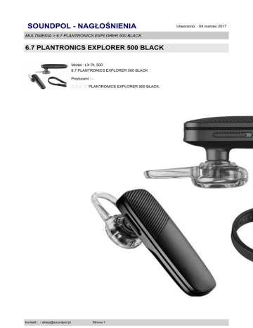 SOUNDPOL - NAGŁOŚNIENIA MULTIMEDIA > 6.7 PLANTRONICS EXPLORER 500 BLACK 6.7 PLANTRONICS EXPLORER 500 BLACK Model : LX PL 500 6.7 PLANTRONICS EXPLORER 500 BLACK Producent : ��� � PLANTRONICS EXPLORER 500 BLACK. kontakt : - [email protected] Strona 1 Utworzono : 04 marzec 2017 SOUNDPOL - NAGŁOŚNIENIA Utworzono : 04 marzec 2017 MULTIMEDIA > 6.7 PLANTRONICS EXPLORER 500 BLACK 6.7 PLANTRONICS EXPLORER 500 BLACK Wysokiej jakości, lekki i wygodny zestaw słuchawkowy, doskonały dla każdego kierowcy. Dzięki funkcji Multipoint można odbierać połączenia z dwóch powiązanych telefonów, co umożliwi łatwe zarządzenie rozmowami z urządzeń służbowych i osobistych.� Słuchawka została wyposażona w komunikaty głosowe dotyczące statusu połączenia oraz stanie naładowania baterii. Ergonomiczny kształt prezentowanej słuchawki został dopasowany do każdego ucha, redukuje również wszelkie hałasy z otoczenia, szum wiatru a także wszelkie echa podczas rozmów.� Dane techniczne Czas rozmowyDo 7 godzin Bluetooth4.1 ZłączeMicro USB do ładowania Waga7.5 g Cena : 248,00 zł Brutto ( 201,63 zł Netto) Dostępność: Produkt dostępny w naszym sklepie od 29 październik 2016 kontakt : - [email protected] Strona 2