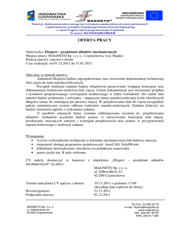 OFERTA PRACY Stanowisko: Ekspert – projektant układów mechanicznych Miejsce pracy: MAGNETO Sp. z o. o., Częstochowa, woj. Śląskie Rodzaj umowy: umowa o dzieło Czas realizacji: od 01.12.2011 do 31.01.2012 Opis prac w ramach umowy: Zadaniem Eksperta będzie zaprojektowanie oraz stworzenie dokumentacji technicznej linii cięcia do taśm nanokrystalicznych. Początek realizacji zadania będzie obejmował opracowanie wstępnej koncepcji oraz dokumentacji techniczno-ruchowej linii cięcia. Celem dokumentacji jest stworzenie projektu i rysunków proponowanego rozwiązania technicznego w kilku wariantach. Do zadań linii należeć będzie podawanie z odwijaka – magazynu taśmy nanokrystalicznej ściśle określonych długości taśmy do istniejącej już głowicy tnącej. W projektowaniu linii do cięcia uwzględnić należy automatyczny system odbioru wykrojów nanokrystalicznych. Zadanie kończyć się będzie złożeniem raportu z wykonania zadania. Z zasobów własnych firmy zostanie oddelegowany asystent ds. projektowania układów. Zadaniem asystenta będzie pomoc w opracowaniu koncepcji linii tnącej, przekazanie znaczących założeń i wymagań projektowych oraz pomoc w przygotowaniu raportu końcowego z realizacji zadania. Wymagania: • wyższe wykształcenie techniczne w kierunku mechanicznym lub budowy maszyn, • znajomość obsługi programów projektowych: AutoCAD, SolidWorks • kilkuletnie doświadczenie zawodowe na podobnym stanowisku • prawo jazdy kat. B mile widziane CV należy dostarczyć w kopercie z dopiskiem „Ekspert – projektant układów mechanicznych” na adres: MAGNETO Sp. z o. o. ul. Odlewników 43 42-200 Częstochowa Termin nadsyłania CV upływa z dniem: Rozstrzygnięcie: Podpisanie umowy: MAGNETO Sp. z o. o. ul. Odlewników 43 42-200 Częstochowa 19.11.2011 o godzinie 17:00 (decyduje data wpływu do firmy) 21.11.2011 01.12.2011 Tel./Fax 34 360 22 72 e-mail [email protected] www.magneto.pl NIP 949-201-60-97 KRS 240-517-390