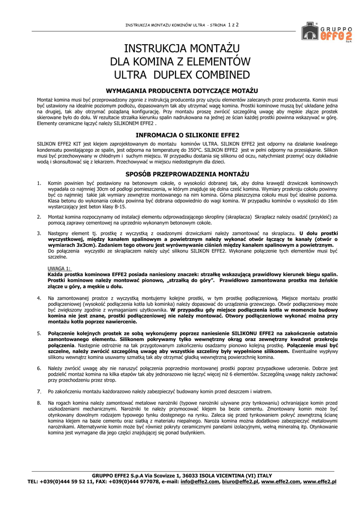 INSTRUKCJA MONTAŻU KOMINÓW ULTRA - STRONA 1z2 INSTRUKCJA MONTAŻU DLA KOMINA Z ELEMENTÓW ULTRA DUPLEX COMBINED WYMAGANIA PRODUCENTA DOTYCZĄCE MOTAŻU Montaż komina musi być przeprowadzony zgonie z instrukcją producenta przy użyciu elementów zalecanych przez producenta. Komin musi być ustawiony na idealnie poziomym podłożu, dopasowanym tak aby utrzymać wagę komina. Prostki kominowe muszą być układane jedna na drugiej, tak aby otrzymać pożądaną konfigurację. Przy montażu proszę zwrócić szczególną uwagę aby męskie złącze prostek skierowane było do dołu. W rezultacie strzałka kierunku spalin nadrukowana na jednej ze ścian każdej prostki powinna wskazywać w górę. Elementy ceramiczne łączyć należy SILIKONEM EFFE2 . INFROMACJA O SILIKONIE EFFE2 SILIKON EFFE2 KIT jest klejem zaprojektowanym do montażu kominów ULTRA. SILIKON EFFE2 jest odporny na działanie kwaśnego kondensatu powstającego ze spalin, jest odporna na temperaturę do 350°C. SILIKON EFFE2 jest w pełni odporny na przesiąkanie. Silikon musi być przechowywany w chłodnym i suchym miejscu. W przypadku dostania się silikonu od oczu, natychmiast przemyć oczy dokładnie wodą i skonsultować się z lekarzem. Przechowywać w miejscu niedostępnym dla dzieci. SPOSÓB PRZEPROWADZENIA MONTAŻU 1. Komin powinien być postawiony na betonowym cokole, o wysokości dobranej tak, aby dolna krawędź drzwiczek kominowych wypadała co najmniej 30cm od podłogi pomieszczenia, w którym znajduje się dolna cześć komina. Wymiary przekroju cokołu powinny być co najmniej takie jak wymiary zewnętrze montowanego na nim komina. Górna płaszczyzna cokołu musi być idealnie pozioma. Klasa betonu do wykonania cokołu powinna być dobrana odpowiednio do wagi komina. W przypadku kominów o wysokości do 16m wystarczający jest beton klasy B-15. 2. Montaż komina rozpoczynamy od instalacji elementu odprowadzającego skropliny (skraplacza) Skraplacz należy osadzić (przykleić) za pomocą zaprawy cementowej na uprzednio wykonanym betonowym cokole. 3. Następny element tj. prostkę z wyczystką z osadzonymi drzwiczkami należy zamontować na skraplaczu. U dołu prostki wyczystkowej, między kanałem spalinowym a powietrznym należy wykonać otwór łączący te kanały (otwór o wymiarach 3x3cm). Zadaniem tego otworu jest wyrównywanie ciśnień między kanałem spalinowym a powietrznym. Do połączenia wyczystki ze skraplaczem należy użyć silikonu SILIKON EFFE2. Wykonane połączenie tych elementów musi być szczelne. UWAGA 1: Każda prostka kominowa EFFE2 posiada naniesiony znaczek: strzałkę wskazującą prawidłowy kierunek biegu spalin. Prostki kominowe należy montować pionowo, „strzałką do góry”. Prawidłowo zamontowana prostka ma żeńskie złącze u góry, a męskie u dołu. 4. Na zamontowanej prostce z wyczystką montujemy kolejne prostki, w tym prostkę podłączeniową. Miejsce montażu prostki podłączeniowej (wysokość podłączenia kotła lub kominka) należy dopasować do urządzenia grzewczego. Otwór podłączeniowy może być zwiększony zgodnie z wymaganiami użytkownika. W przypadku gdy miejsce podłączenia kotła w momencie budowy komina nie jest znane, prostki podłączeniowej nie należy montować. Otwory podłączeniowe wykonać można przy montażu kotła poprzez nawiercenie. 5. Połączenie kolejnych prostek ze sobą wykonujemy poprzez naniesienie SILIKONU EFFE2 na zakończenie ostatnio zamontowanego elementu. Silikonem pokrywamy tylko wewnętrzny okrąg oraz zewnętrzny kwadrat przekroju połączenia. Następnie ostrożnie na tak przygotowanym zakończeniu osadzamy pionowo kolejną prostkę. Połączenie musi być szczelne, należy zwrócić szczególną uwagę aby wszystkie szczeliny były wypełnione silikonem. Ewentualne wypływy silikonu wewnątrz komina usuwamy szmatką tak aby otrzymać gładką wewnętrzną powierzchnię komina. 6. Należy zwrócić uwagę aby nie naruszyć połączenia poprzednio montowanej prostki poprzez przypadkowe uderzenie. Dobrze jest podzielić montaż komina na kilka etapów tak aby jednorazowo nie łączyć więcej niż 6 elementów. Szczególną uwagę należy zachować przy przechodzeniu przez strop. 7. Po zakończeniu montażu każdorazowo należy zabezpieczyć budowany komin przed deszczem i wiatrem. 8. Na rogach komina należy zamontować metalowe narożniki (typowe narożniki używane przy tynkowaniu) ochraniające komin przed uszkodzeniami mechanicznymi. Narożniki te należy przymocować klejem ba bezie cementu. Zmontowany komin może być otynkowany dowolnym rodzajem typowego tynku dostępnego na rynku. Zaleca się przed tynkowaniem pokryć zewnętrzną ścianę komina klejem na bazie cementu oraz siatką z materiału niepalnego. Naroża komina można dodatkowo zabezpieczyć metalowymi narożnikami. Alternatywnie komin może być również pokryty ceramicznymi panelami izolacyjnymi, wełną mineralną itp. Otynkowanie komina jest wymagane dla jego części znajdującej się ponad budynkiem. GRUPPO EFFE2 S.p.A Via Scovizze 1, 36033 ISOLA VICENTINA (VI) ITALY TEL: +039(0)444 59 52 11, FAX: +039(0)444 977078, e-mail: [email protected], [email protected], www.effe2.com, www.effe2.pl INSTRUKCJA MONTAŻU KOMINÓW ULTRA - STRONA 2z2 UWAGA 2: Żaden element komina nie może być związany sztywno ze strukturą budynku. W przypadku związania komina ze strukturą budynku (ze ścianami lub stropem) osiadanie budynku lub brak możliwości rozszerzania się ceramiki komina pod wpływem temperatury, może doprowadzić do nienaprawialnych pęknięć komina. Z tego powodu przy przechodzeniu komina przez strop konieczne jest zastosowanie elastycznych łączników wykonanych z wełny mineralnej lub bazaltowej odpornej na działanie temperatury 300°C. Grubość łącznika powinna wynosić co najmniej 1 cm. Należy zachować minimalną odległość (2mm) miedzy ścianą a kominem ustawionym przy niej kominem. Alternatywnym rozwiązaniem j