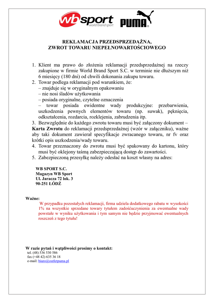 REKLAMACJA PRZEDSPRZEDAŻNA, ZWROT TOWARU NIEPEŁNOWARTOŚCIOWEGO 1. Klient ma prawo do złożenia reklamacji przedsprzedażnej na rzeczy zakupione w firmie World Brand Sport S.C. w terminie nie dłuższym niż 6 miesięcy (180 dni) od chwili dokonania zakupu towaru. 2. Towar podlega reklamacji pod warunkiem, że: – znajduje się w oryginalnym opakowaniu – nie nosi śladów użytkowania – posiada oryginalne, czytelne oznaczenia – towar posiada ewidentne wady produkcyjne: przebarwienia, uszkodzenia pewnych elementów towaru (np. suwak), pęknięcia, odkształcenia, rozdarcia, rozklejenia, zabrudzenia itp. 3. Bezwzględnie do każdego zwrotu towaru musi być załączony dokument – Karta Zwrotu do reklamacji przedsprzedażnej (wzór w załączniku), ważne aby taki dokument zawierał specyfikacje zwracanego towaru, nr fv oraz krótki opis uszkodzenia/wady towaru. 4. Towar przeznaczony do zwrotu musi być spakowany do kartonu, który musi być oklejony taśmą zabezpieczającą dostęp do zawartości. 5. Zabezpieczoną przesyłkę należy odesłać na koszt własny na adres: WB SPORT S.C. Magazyn WB Sport Ul. Jaracza 72 lok. 3 90-251 ŁÓDŹ Ważne: W przypadku pozostałych reklamacji, firma udziela dodatkowego rabatu w wysokości 1% na wszystkie sprzedane towary tytułem zadośćuczynienia za ewentualne wady powstałe w wyniku użytkowania i tym samym nie będzie przyjmować ewentualnych roszczeń z tego tytułu! W razie pytań i wątpliwości prosimy o kontakt: tel. (48) 536 530 586 fax (+48 42) 635 36 18 e-mail: [email protected] Nr dok. ……………………. (wypełniamy w magazynie WB Sport) Nazwa Klienta: Nr NIP Klienta: Załącznik nr: Indeks ZGŁOSZENIE REKLAMACJI PRZEDSPRZEDAŻNEJ – ZWROT Nazwa Nr FV Data FV Cena netto Ilość Roz. Pieczątka i podpis kierownika/właściciela sklepu Opis wady Podpis pracownika WB Sport