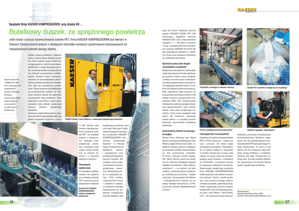 Sprê¿arki firmy KAESER KOMPRESSOREN przy drodze 66 … Butelkowy duszek ze sprê¿onego powietrza Jeœli chodzi o proces wydmuchiwania butelek PET, firma KAESER KOMPRESSOREN jest równie¿ w Stanach Zjednoczonych jednym z wiod¹cych oferentów rozwi¹zañ systemowych dopasowanych do indywidualnych potrzeb danego klienta. Dziêki systemowi „SIGMA PET AIR” firma zajmuj¹ca siê nape³nianiem butelek z Nowego Meksyku zaoszczêdza wiele tysiêcy dolarów oraz wchodzi w nowy obszar dzia³alnoœci. Zak³ad „Essence Bottling” z Albuquerque w stanie Nowy Meksyk nape³nia 5000 butelek wody mineralnej w ci¹gu godziny. Jest to nowy obszar dzia³alnoœci o du¿ej dynamice wzrostu, poniewa¿ jednak w okolicy tej nie ma ¿adnych producentów butelek, szybko rosn¹ce koszty transportu zwi¹zane ze sprowadzaniem pojemników od daleko po³o¿onych dostawców sta³y siê prawdziwym problemem. Zakup systemu pozwalaj¹cego na produkowanie butelek we w³asnym zakresie okaza³ siê logicznym rozwi¹zaniem tego problemu. Podstawowym warunkiem rozpoczêcia inwestycji by³a jednak ca³oœciowa odnowa systemu sprê¿onego powietrza. Do tej pory zapotrzebowanie na sprê¿one powietrza zaspokaja³a ma³a, ale g³oœna sprê¿arka œrubowa o mocy Spokojna praca jest drugim obowi¹zkiem sprê¿arek Patrick Chaver i John Wilson w nowej stacji sprê¿onego powietrza 11 kW. Jednak, jeœli chodzi o obs³ugê systemu produkcji butelek PET, nie chodzi³o jedynie o dostarczenie wiêkszej iloœci sprê¿onego powietrza: potrzebne by³o czyste, suche powietrze w du¿ych iloœciach i o znacznie wiêkszym ciœnieniu. Planowanie systemowe Po okreœleniu wykazu za³o¿eñ dla systemu do produkcji butelek PET, zwrócono siê do ekspertów w zakresie Dla linii PET KAESER KOMPRESSOREN oferuje rozwi¹zania systemowe 16 tego te¿ bracia Trujillowie polecili system KAESER SIGMA PET AIR obejmuj¹cy sprê¿arkê œrubow¹ KAESER ESD 250 z bezpoœrednim napêdem 1: 1, dla sieci o ciœnieniu 13 bar, wysokociœnieniowy kompresor œrubowy KAESER N1400G EP jako doprê¿acza powietrza o ciœnieniu 40 bar oraz osuszacz ch³odniczy do uzdatniania powietrza. sprê¿onego powietrza, braci Larry’ego i Gary’ego Trujillo, reprezentuj¹cych dystrybutora produktów KAESER KOMPRESSOREN „Advanced Compressor Systems” w Albuquerque. Przyjrzeli siê oni dok³adnie planom i wymaganiom oraz przedstawili dok³adn¹ wycenê kosztów dla urz¹dzeñ, prac pod³¹czeniowych oraz sieci sprê¿onego powietrza. Albuquerque le¿y na wysokoœci ponad 1500 metrów nad poziomem morza — zasilanie w sprê¿one powietrze wymaga dopasowania do wysokoœci, na jakiej znajduje siê instalacja. Dla- Nastêpnym wymaganiem zamawiaj¹cego by³o zapewnienie jak najni¿szego poziomu ha³asu pracy sprê¿arki z uwagi na koniecznoœæ umieszczenia stacji sprê¿arkowej w otwartej hali w odleg³oœci zaledwie oko³o 15 metrów od instalacji wydmuchiwania butelek. Spe³nienie tego warunku nie przysporzy³o ¿adnego problemu i tak bardzo cichemu kompresorowi œrubowemu ESD 250. Zastosowanie ch³odzenia wodnego sprê¿arki t³okowej zagwarantowa³o niski poziom ha³asu ca³ej stacji sprê¿onego powietrza. Cicha praca sprê¿arek by³a zatem dla „Essence” naprawdê bardzo wa¿na — a uzyskany poziom g³oœnoœci spowodowa³ prawdziwe zdziwienie. Przysz³oœc nadci¹ga w zwartym szeregu Butelki PET s¹ lekkie i nadaj¹ siê do recyklingu Zadowolenie klienta od samego pocz¹tku Formy z przy³¹czami pneumatycznymi Ostatnie regulacje “doprê¿acza” Prezes firmy „Essence” pan Albert Murray oraz jego przedstawiciel John Wilson przyjêli ofertê braci Trujillo. Instalacja nowego systemu sprê¿onego powietrza zosta³a przeprowadzona bez przerywania produkcji. W koñcu nadesz³a chwila prawdy. Pan Albert Murray zjawi³ siê osobiœcie by dokonaæ przegl¹du gotowej instalacji i powiedzia³: „Wiêc dobrze, w³¹czamy!” — co jednak nie by³o mo¿liwe, poniewa¿ system sprê¿onego powietrza ju¿ pracowa³: “Instalacja ta jest — jak zauwa¿y³ John Wilson — dziesiêciokrotnie wiêksza od naszego starego kompresora 15-PS, a przy tym równie¿ dziesiêciokrotnie cichsza.” Instalacja do wydmuchiwania butelek PET w firmie ‘Essence’, ‘ci¹gle pracuje i pracuje’. Ale tak¿e ‘ci¹gle oszczêdza i oszczêdza’. Oszczêdnoœci na jednej butelce w wysokoœci 3 centów sumuj¹ siê w czasie ca³ej zmiany do kwoty znacznie przewy¿szaj¹cej garœæ dolarów, a dok³adnie do 1200 USD — co œwiadczy, ¿e by³a to naprawdê op³acalna inwestycja. Nowy system sprê¿onego powietrza firmy KAESER KOMPRESSOREN zasila poza tym ca³y zak³ad w powietrze robocze. Suche i czyste powietrze, przy pomocy którego wydmuchiwane s¹ butelki, gwarantuje utrzymanie wysokiego poziomu jakoœci butelek PET oraz minimalnego poziomu wad. John Wilson: “Null Problemo!” — to mo¿e trochê zbyt wiele po- Oszczêdnoœci na przysz³oœæ wiedziane, poniewa¿ w miêdzyczasie kierownictwo firmy “Essence” zastanawia siê nad potraktowaniem produkcji butelek PET jako g³ównego rodzaju dzia³alnoœci. W koñcu w tej okolicy nie ma w dalszym ci¹gu ¿adnego innego dostawcy, a zapotrzebowanie jest du¿e. Przyk³ad ten ilustruje nam, ile mo¿e zdzia³aæ dok³adnie dopasowany do potrzeb klienta system sprê¿onego powietrza. Opracowanie: Angela Kelly/Klaus Dieter Bätz Kontakt: [email protected] 17